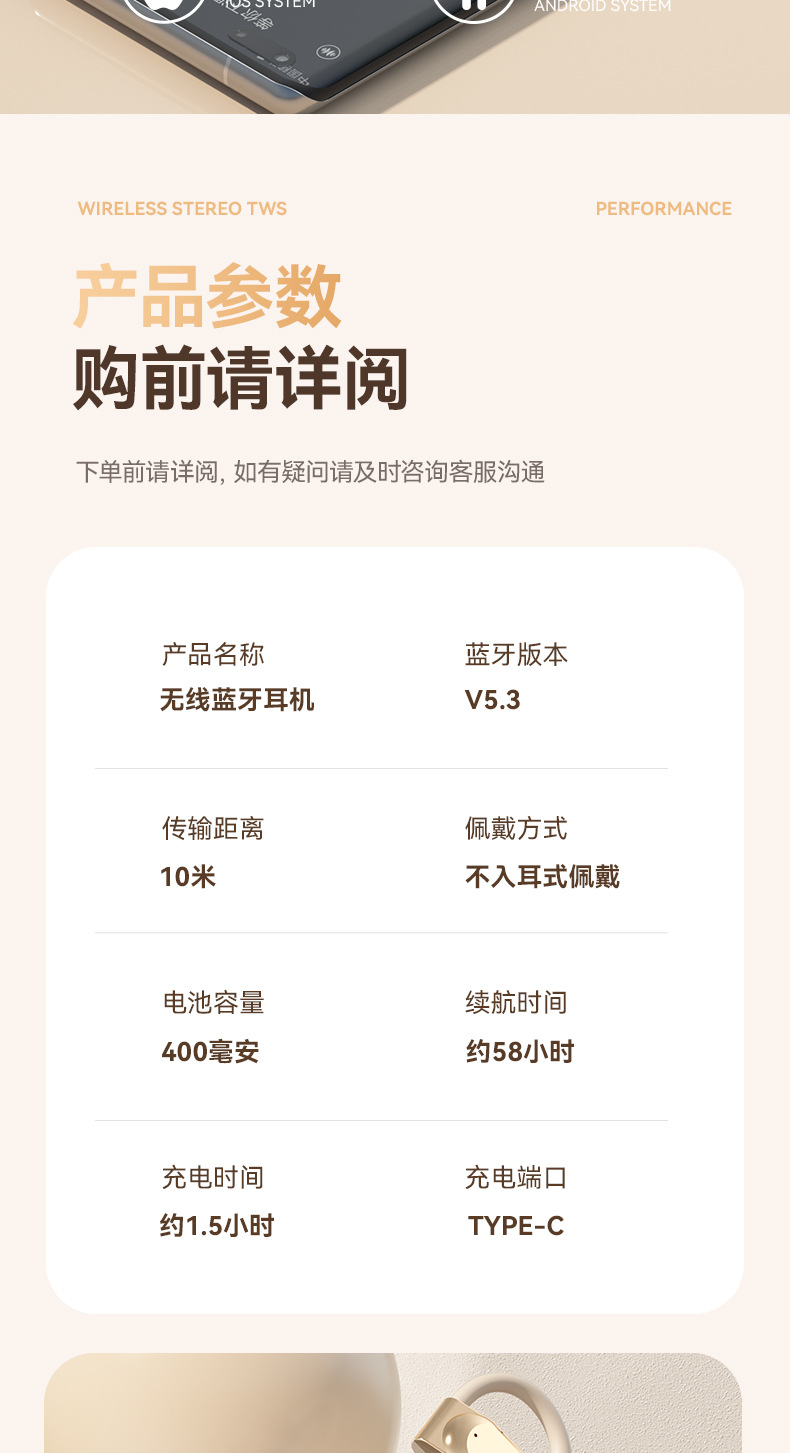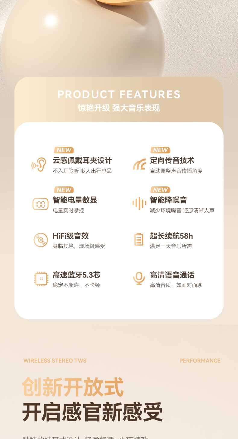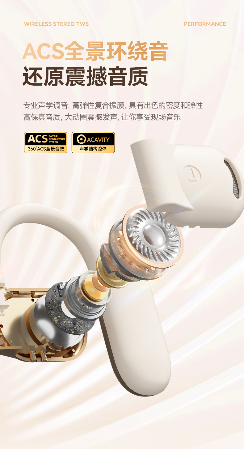 【超长续航!舒适无感佩戴】开放式听音,营造真实现场效果;ACS全景环绕音,一秒穿越现场!智能降噪,享受专业级音质。私模蓝牙耳机M62,畅想身临其境的感觉,让你尽情释放内心热情!