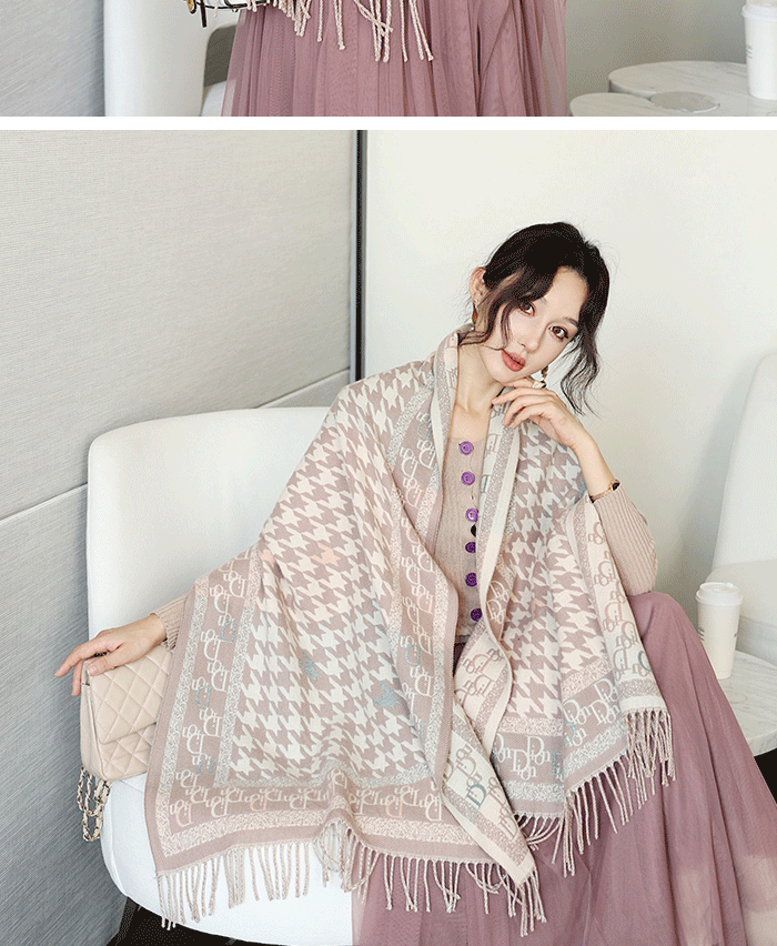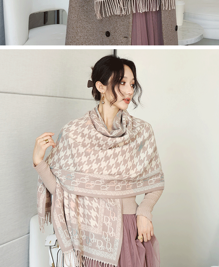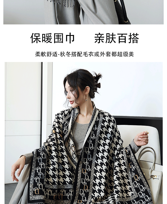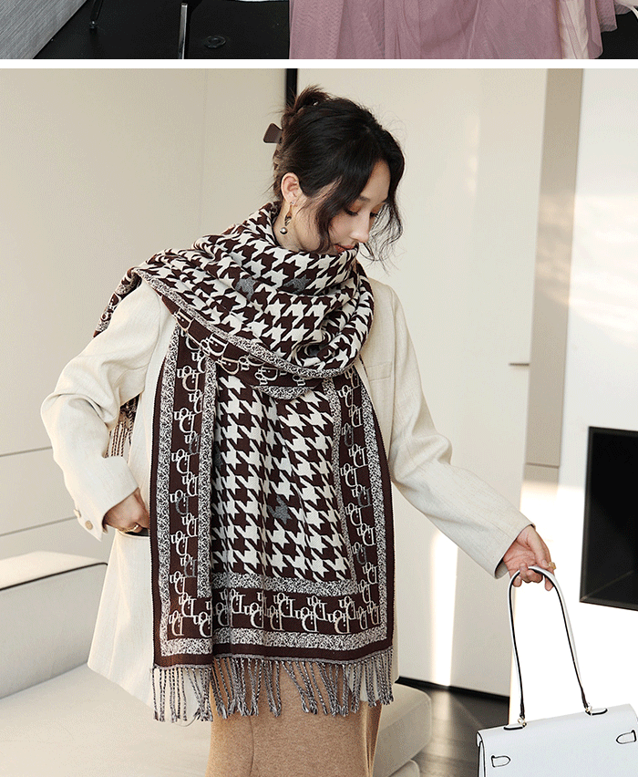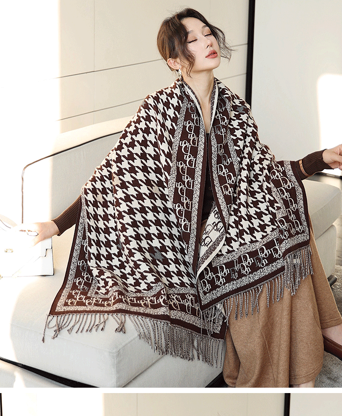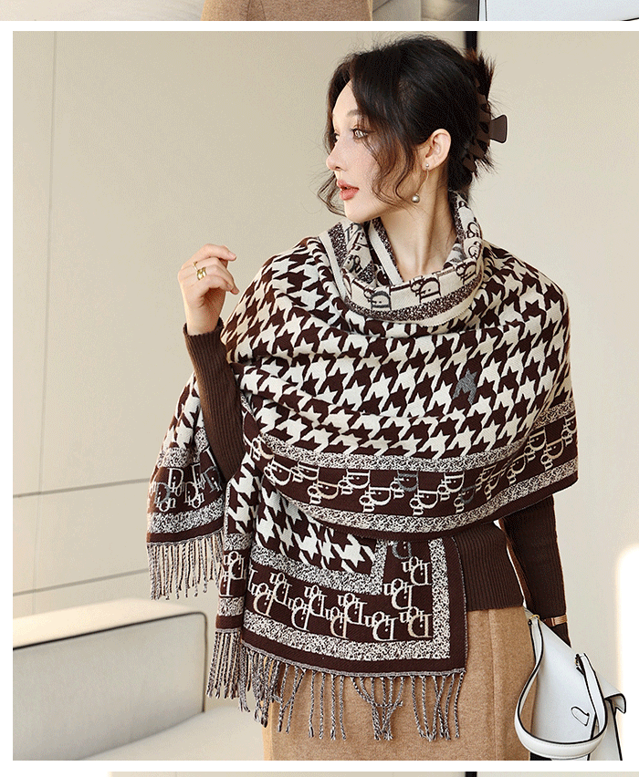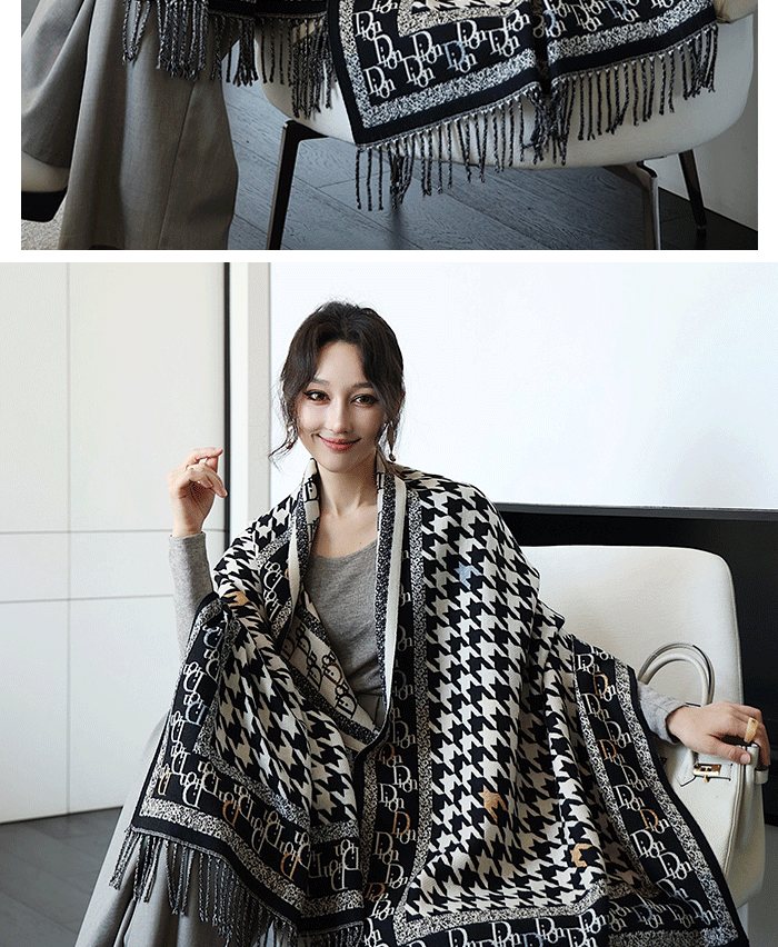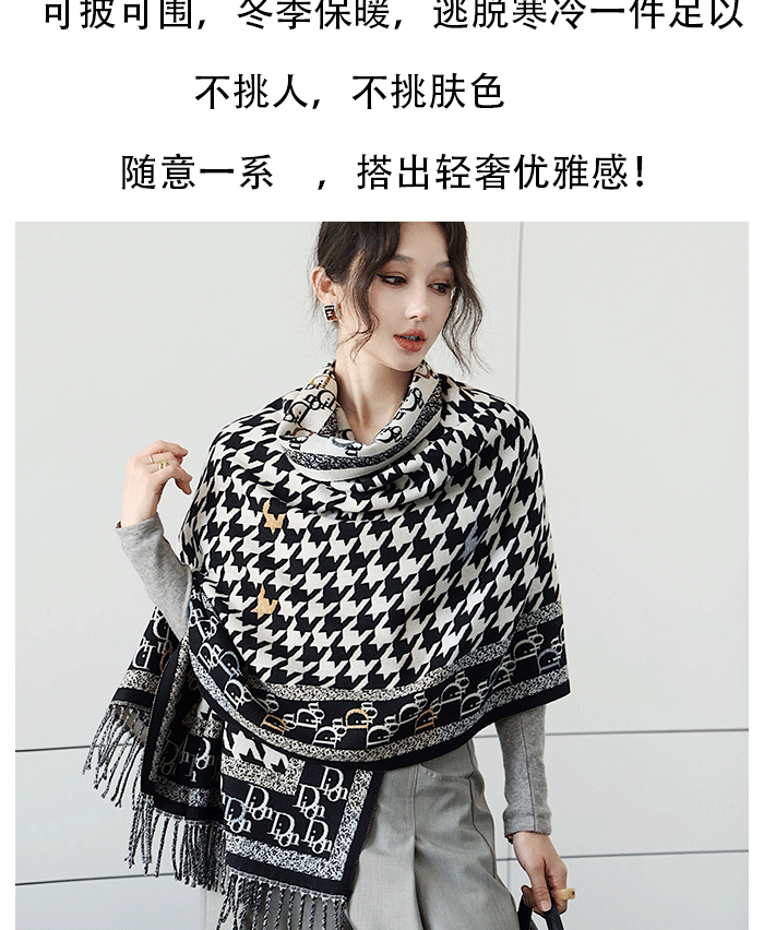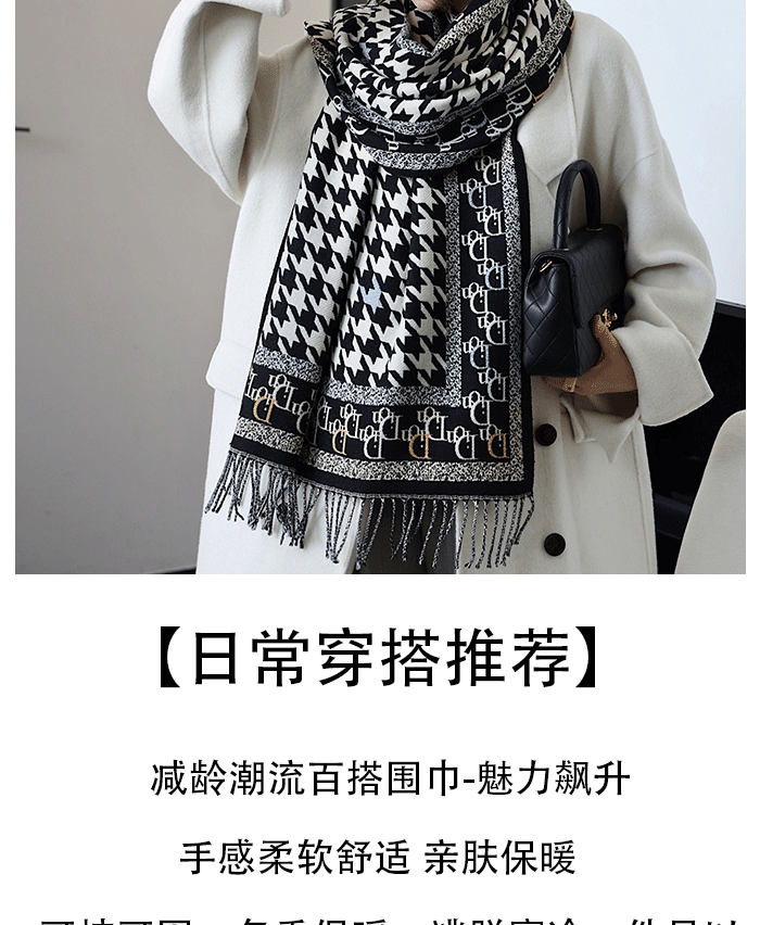 韩版气质秋冬新款围巾 黑白千鸟格围巾女 加厚保暖 字母长流苏仿羊绒披肩围脖