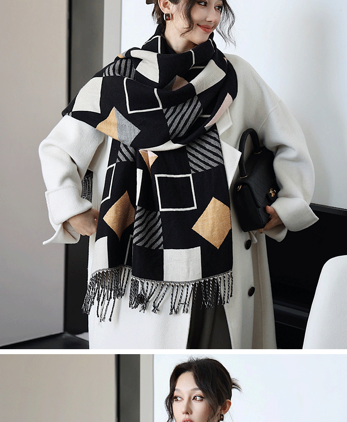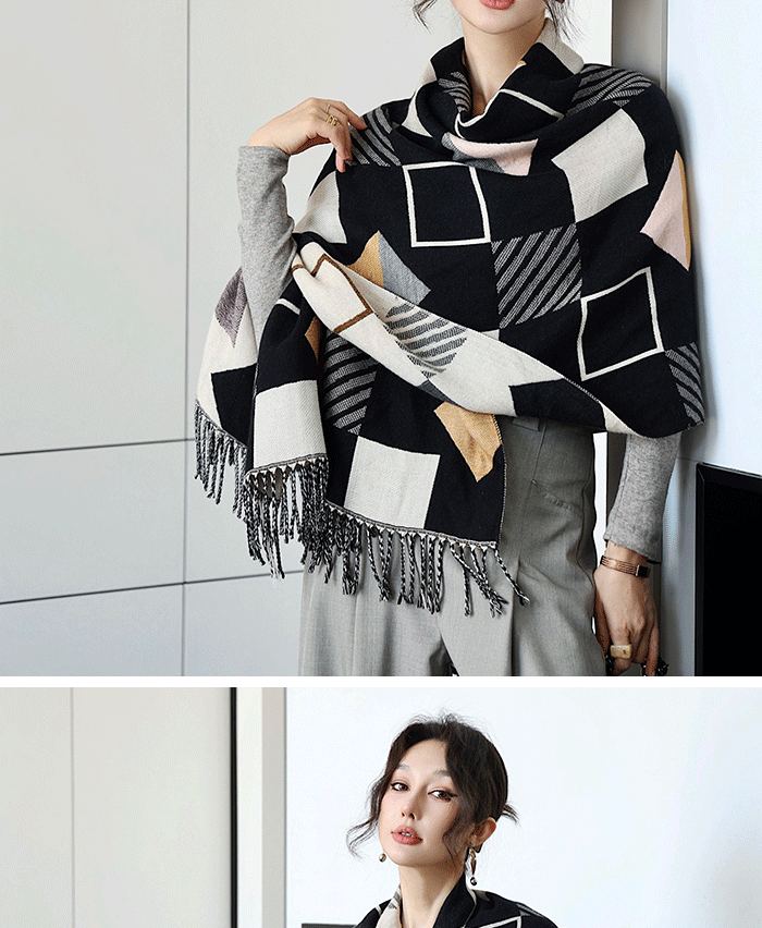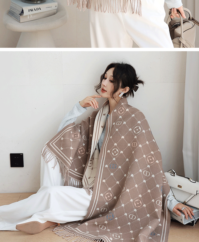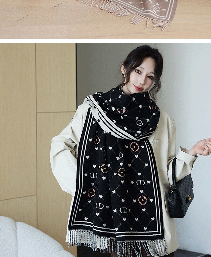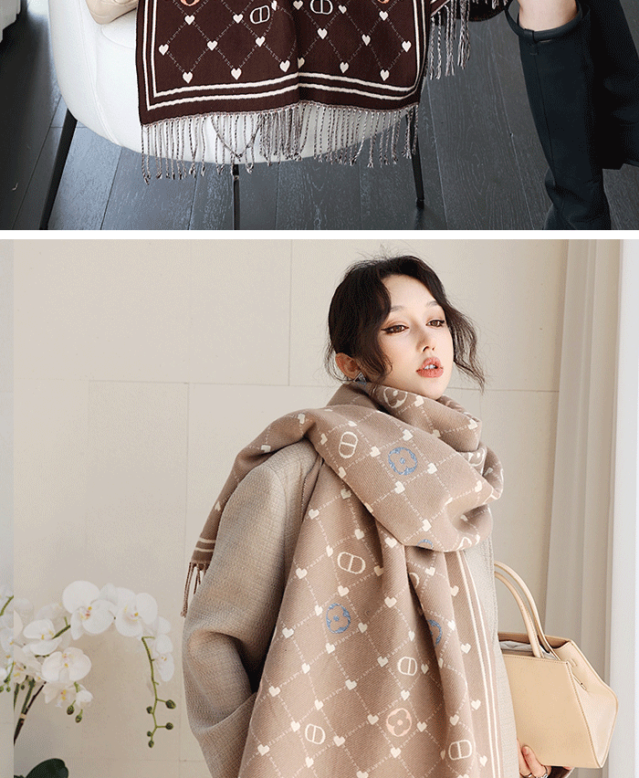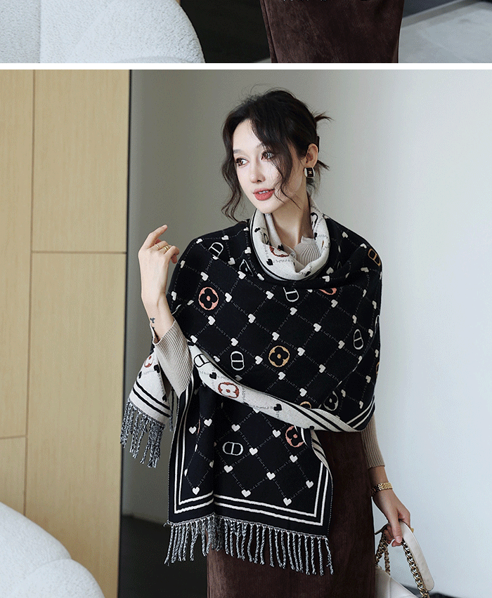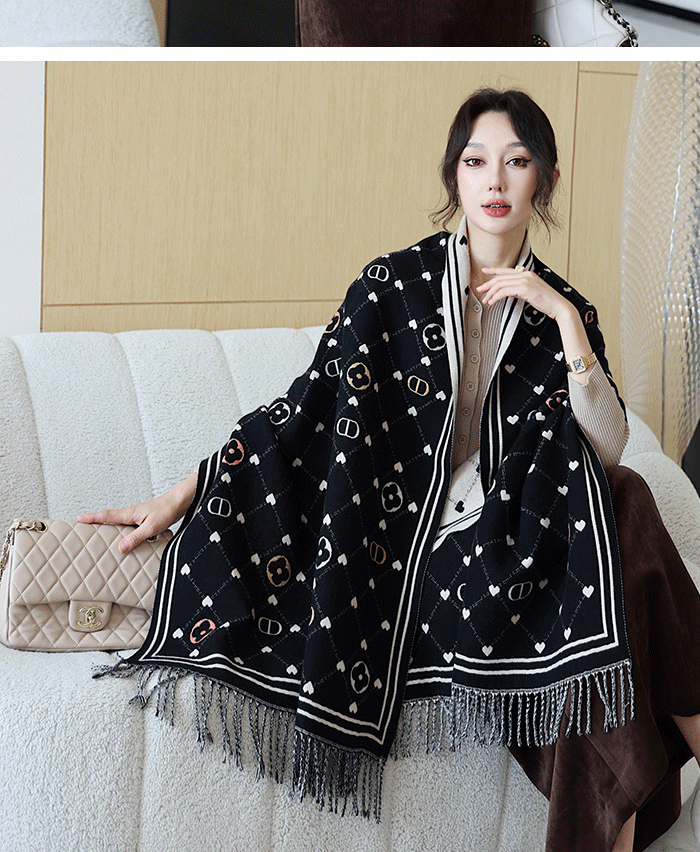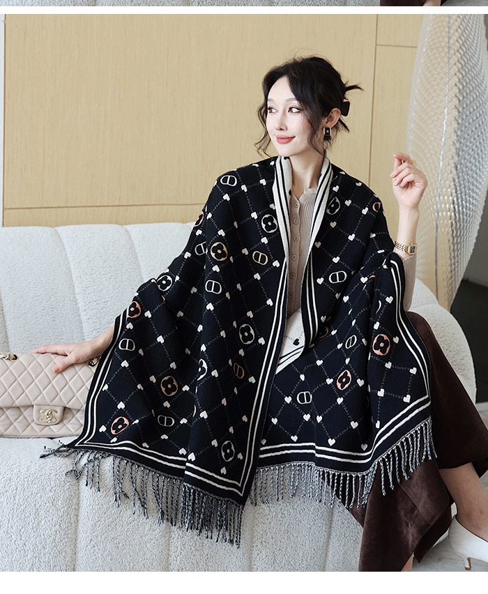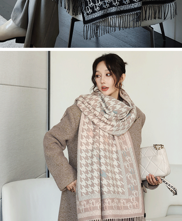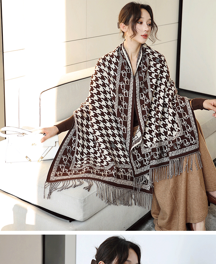 韩版气质秋冬新款围巾 黑白千鸟格围巾女 加厚保暖 字母长流苏仿羊绒披肩围脖