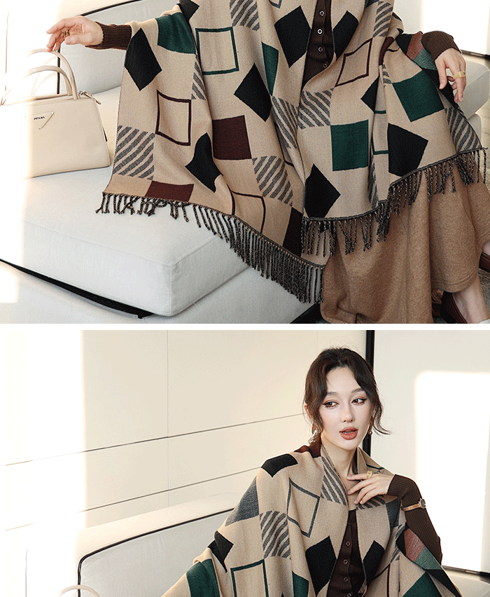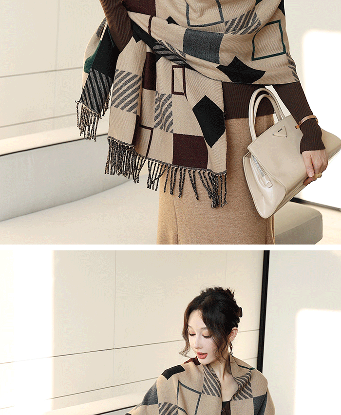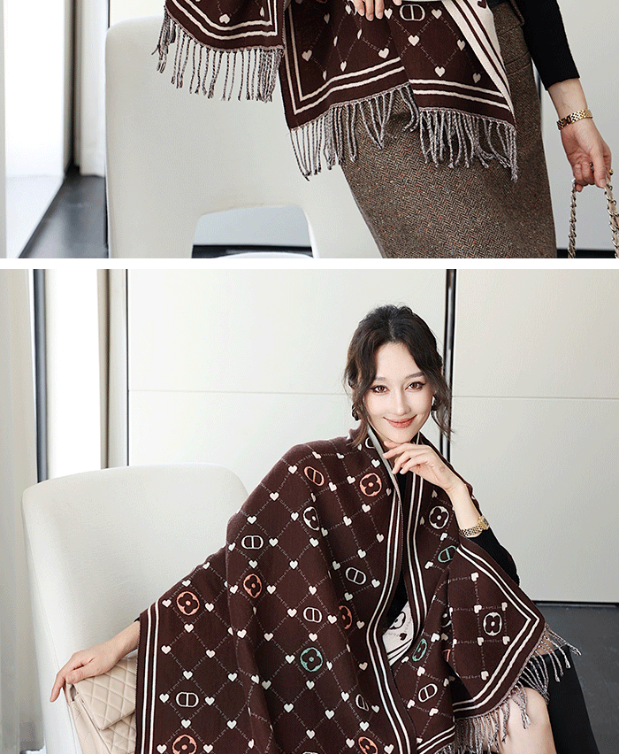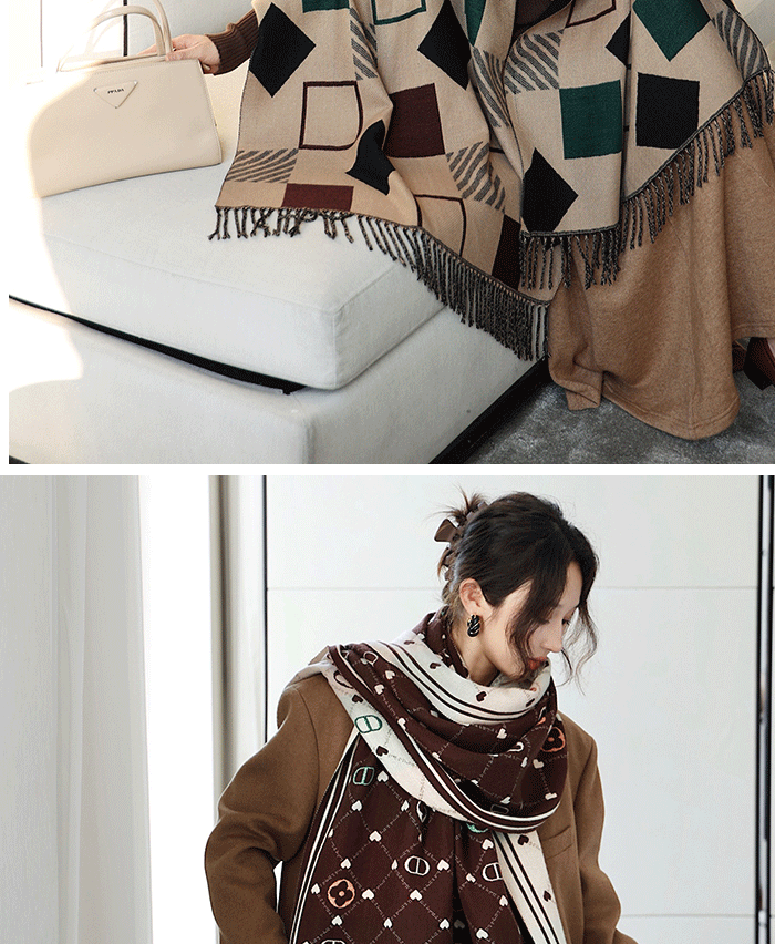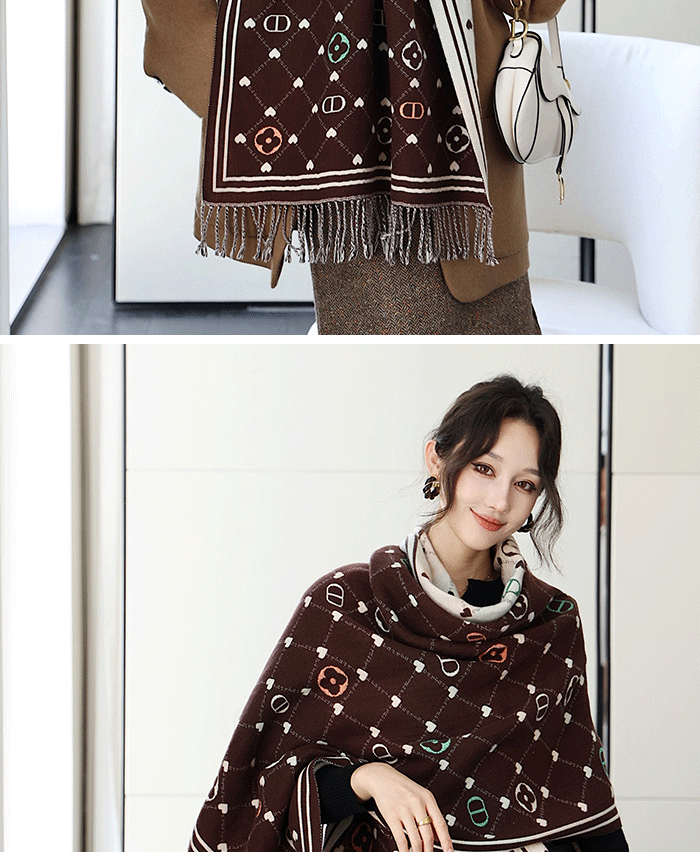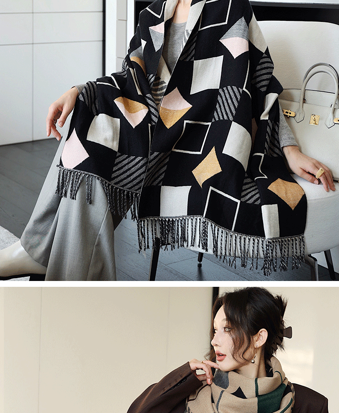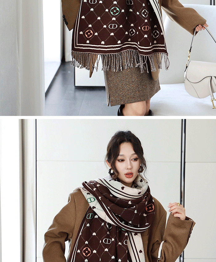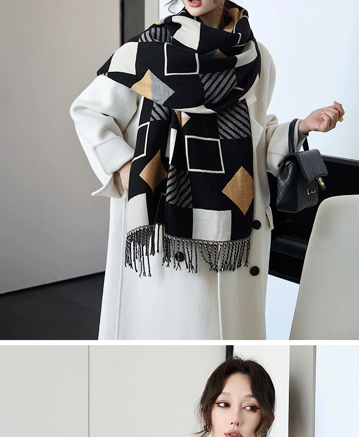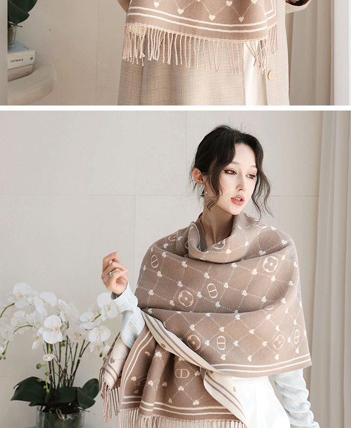 韩版气质秋冬新款围巾 黑白千鸟格围巾女 加厚保暖 字母长流苏仿羊绒披肩围脖