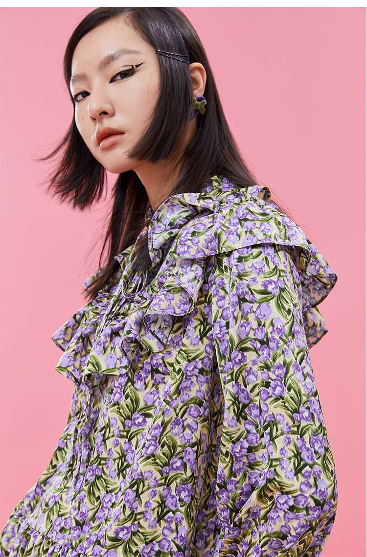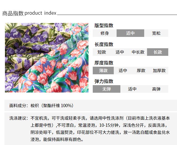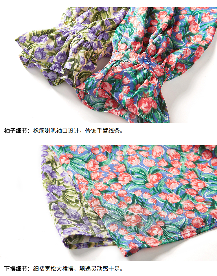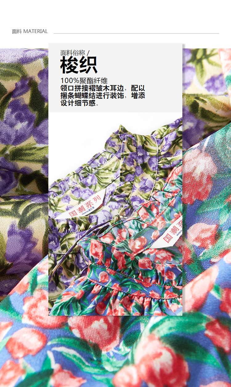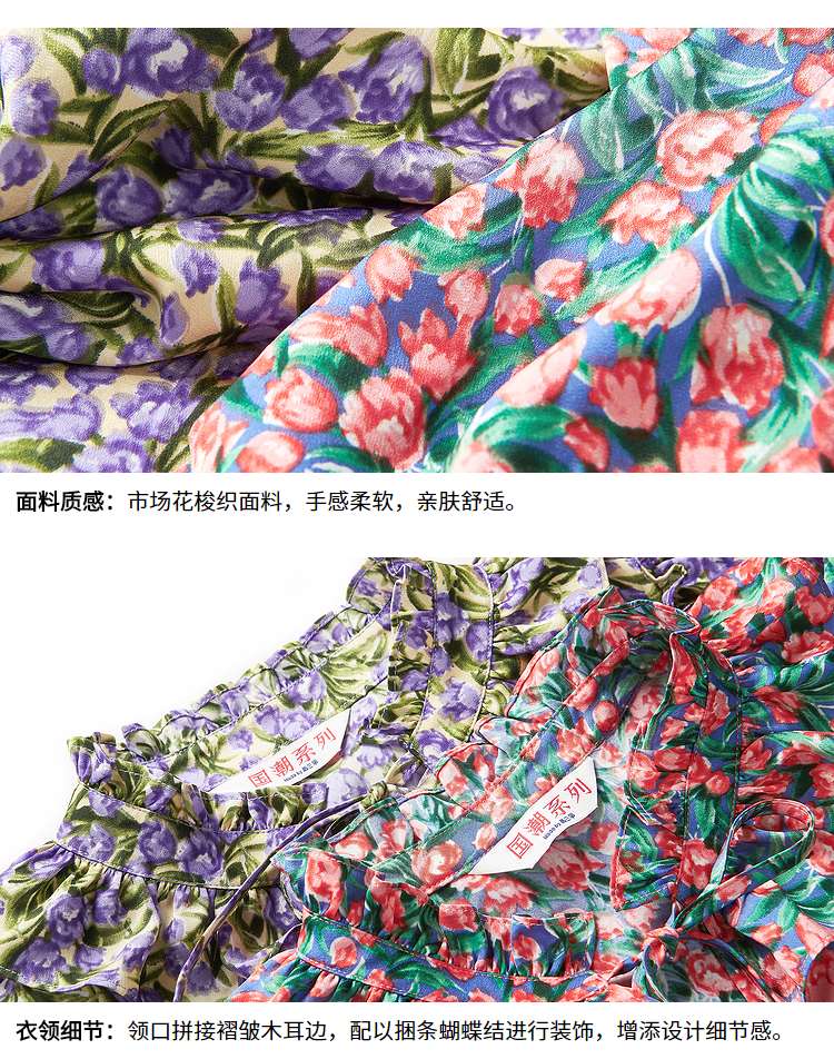 两三事国潮艺术明日世界的花春新款复古荷叶边拼接印花连衣裙