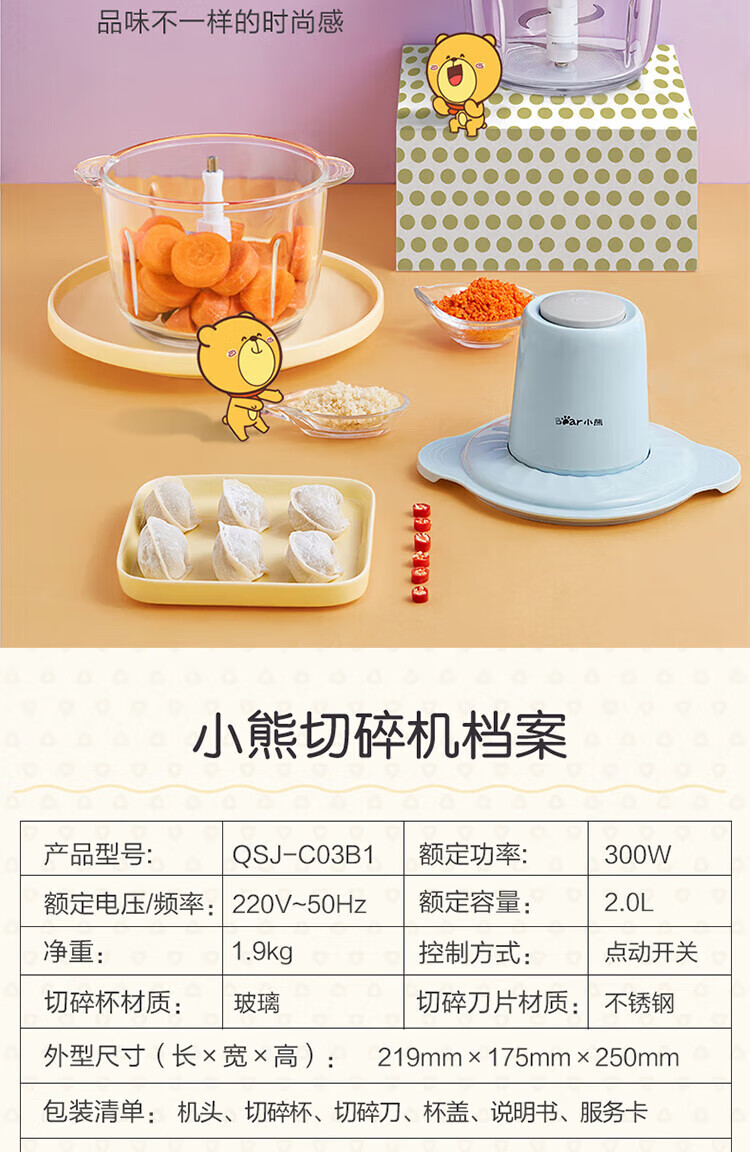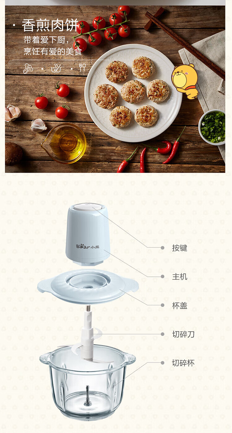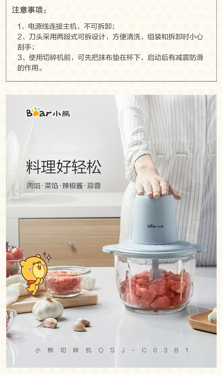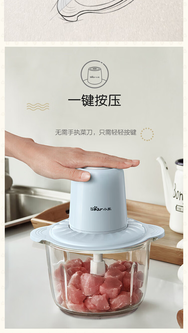 小熊(Bear)2升绞肉机 家用电动玻璃绞馅机碎肉打肉机切菜搅拌机QSJ-C03B1【浅蓝色】