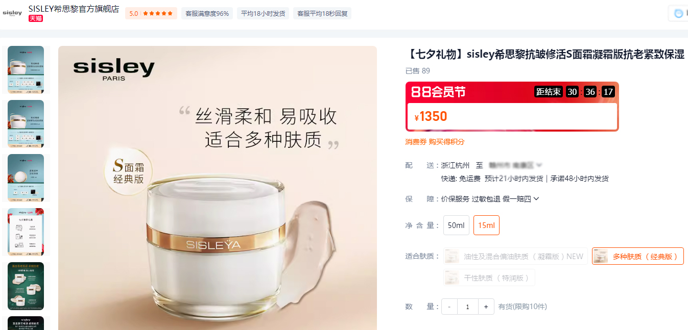 【品名】 sisley希思黎抗皱修活S面霜凝霜版抗老紧致保湿15ml