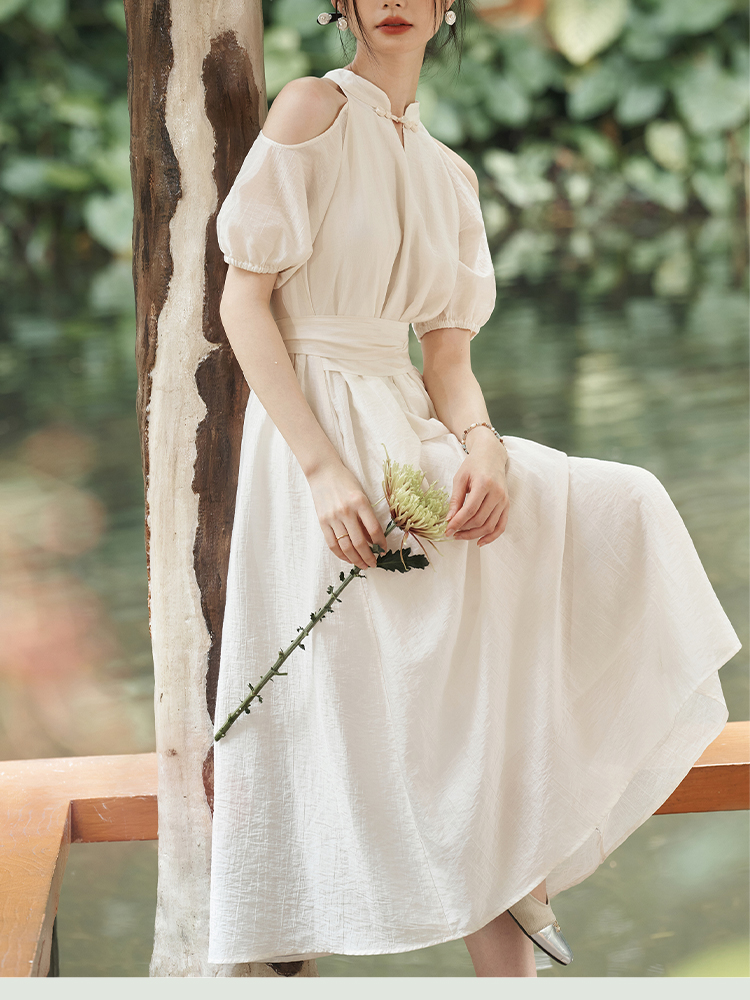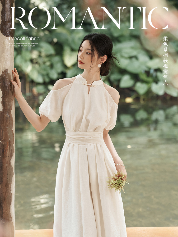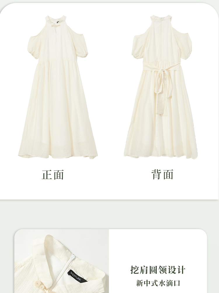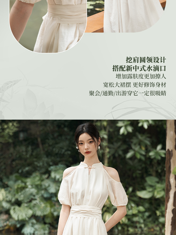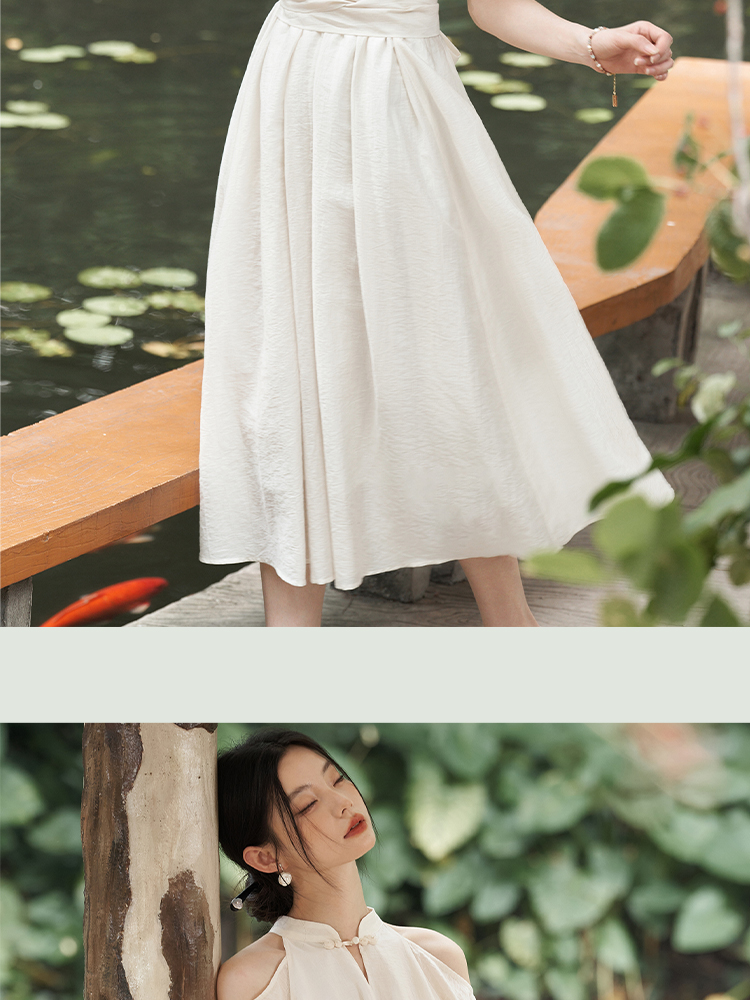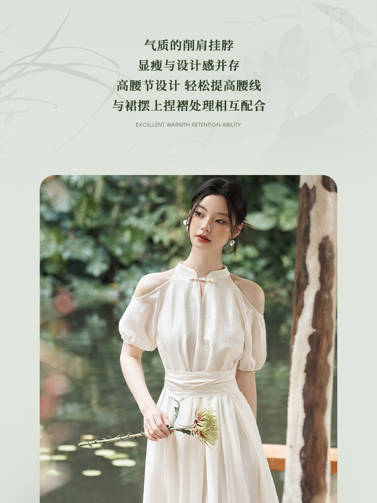 西遇挂脖连衣裙女新款温柔水滴盘扣高腰新中式国风长裙D1941602