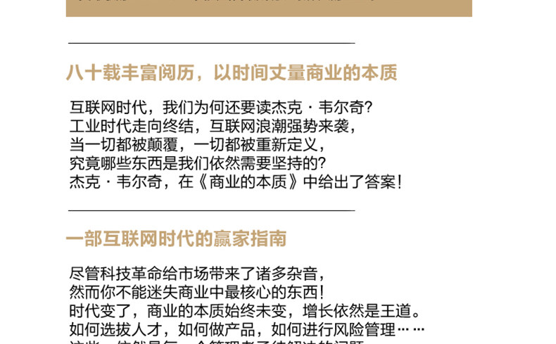 如果说我在写《赢》这本书时对商业有所了解,那么在撰写《商业的本质》时我对商业了解得更多了,也更深刻了。因为自那时起,商业环境已经发生了很大的变化,我很幸运能够紧跟时代的变化而没有落伍。