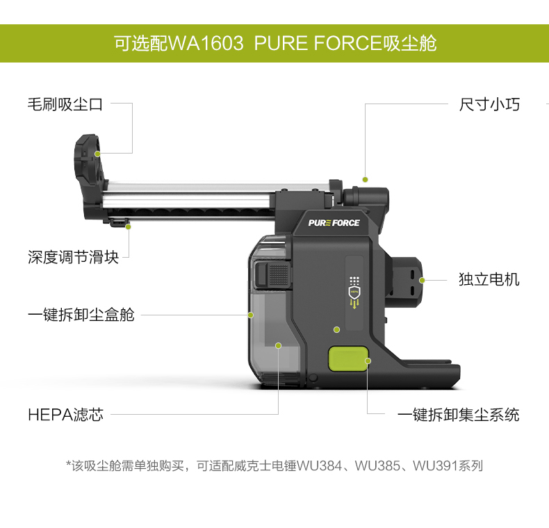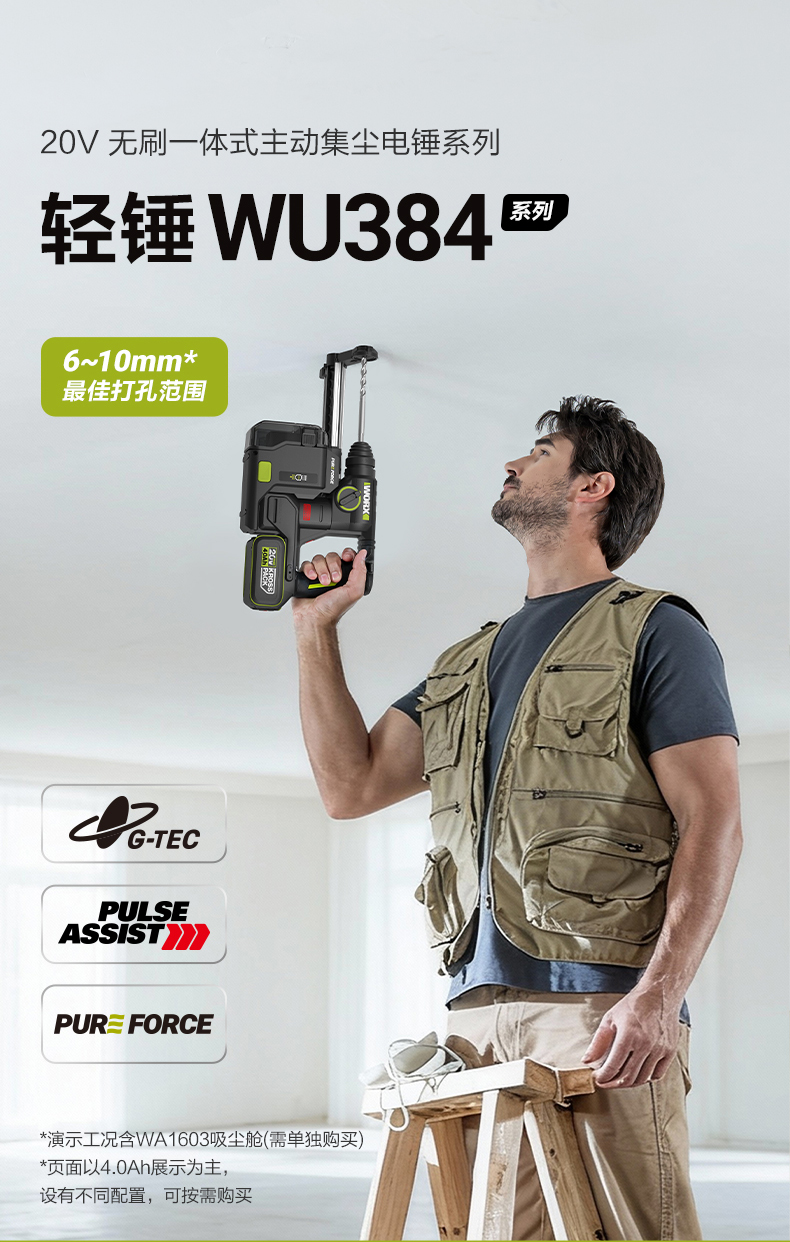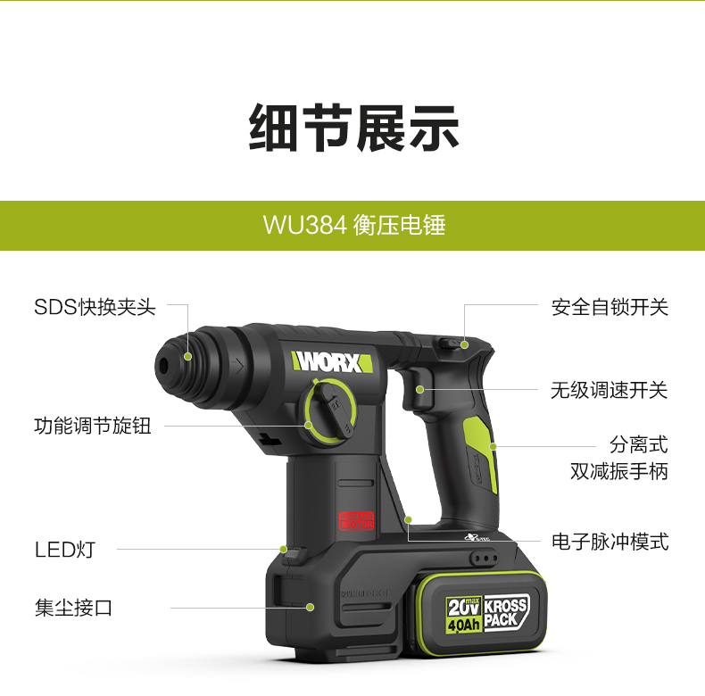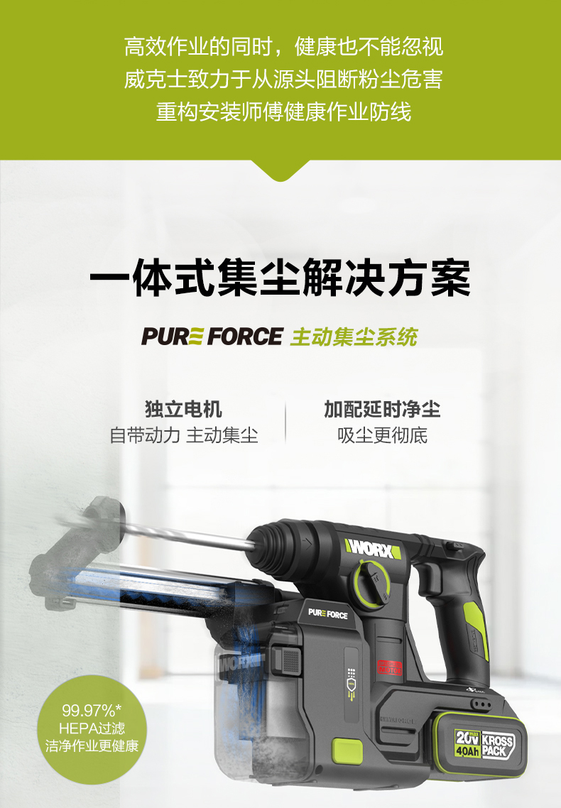 威克士锂电集尘电锤WU384充电冲击钻两用打混凝土钻墙电动工具