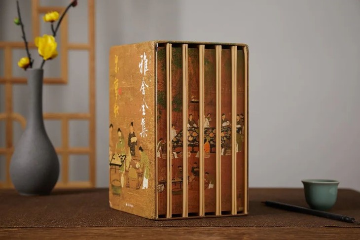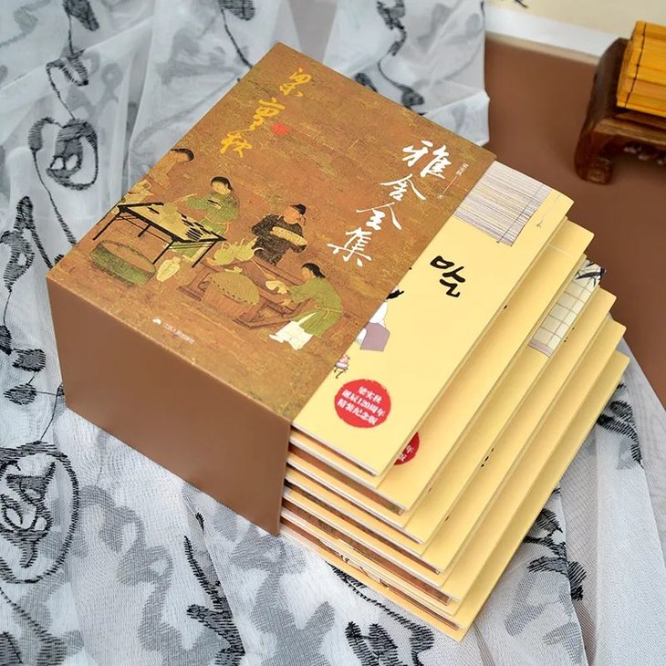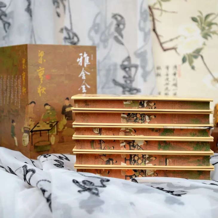 全书纪念版,装帧内页设计也极为考究,精装函套设计,六册封面插画清逸淡雅,与梁实秋雅舍风格相得益彰。