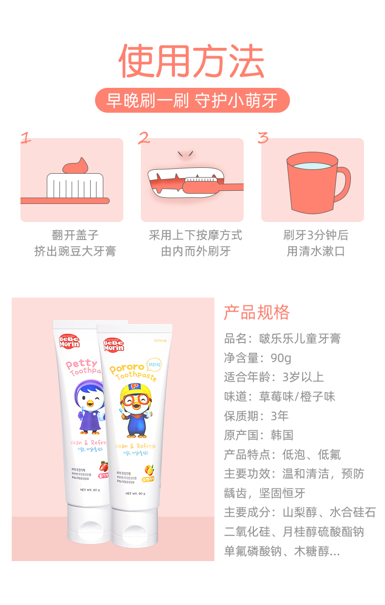 【中欧班列】韩国进口XDR Pororo低氟牙膏 草莓味 、橙子味