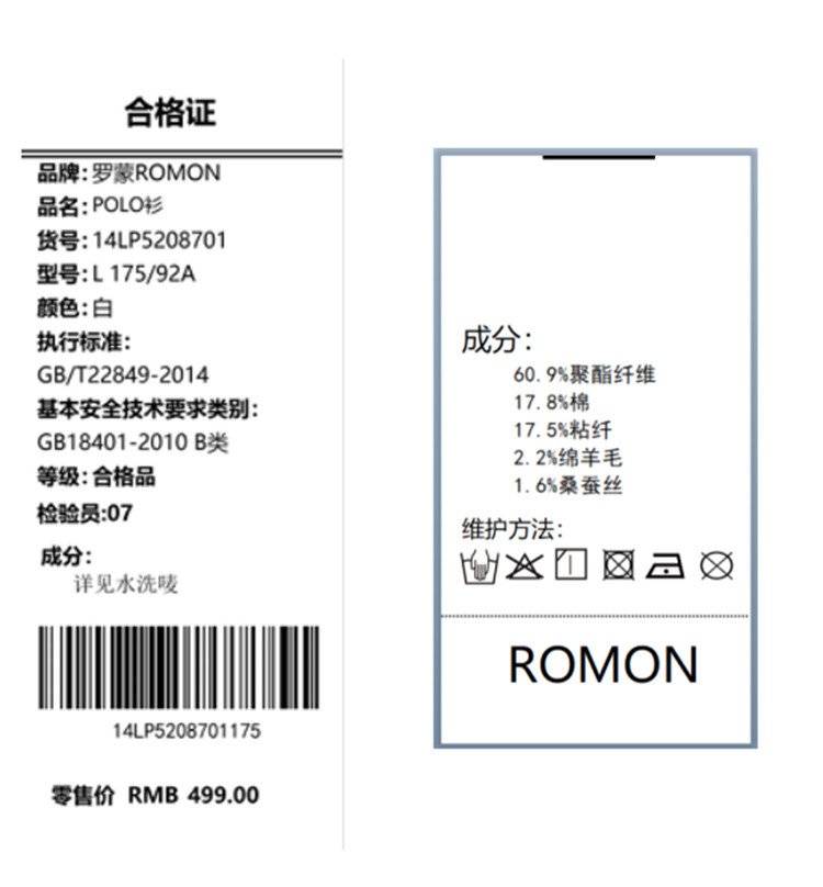 面料:60.9%聚酯纤维 17.8%棉 17.5%粘纤 2.2%绵羊毛 1.6%桑蚕丝