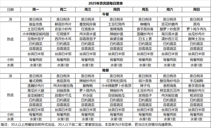 ①、当天就餐人数在 30 人以内供应形式为港式烧味套餐;就餐人数达 30 人以上按三荤二素一汤一主食的标准(菜谱另定)以自助形式供应;