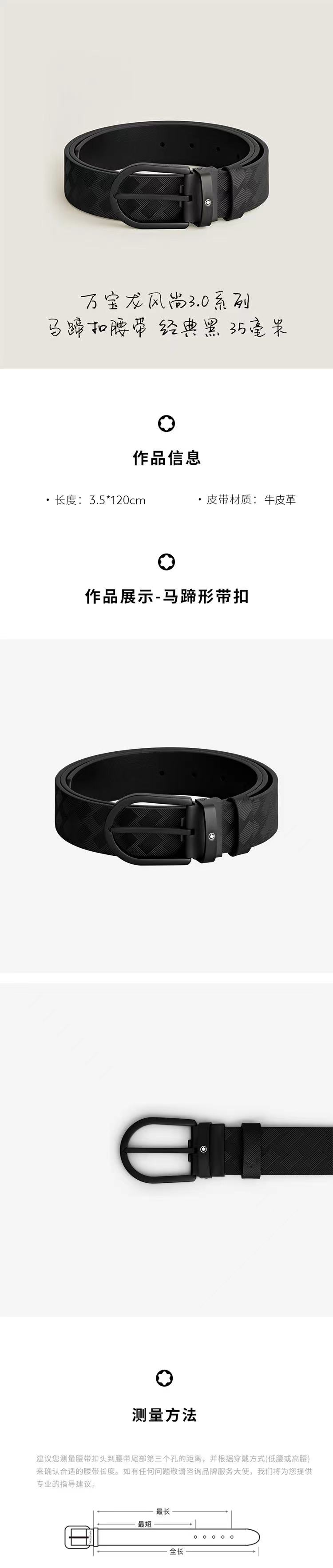 这款黑色35毫米腰带饰有标志性万宝龙风尚3.0图案,马蹄形针扣采用黑色PVD饰面。