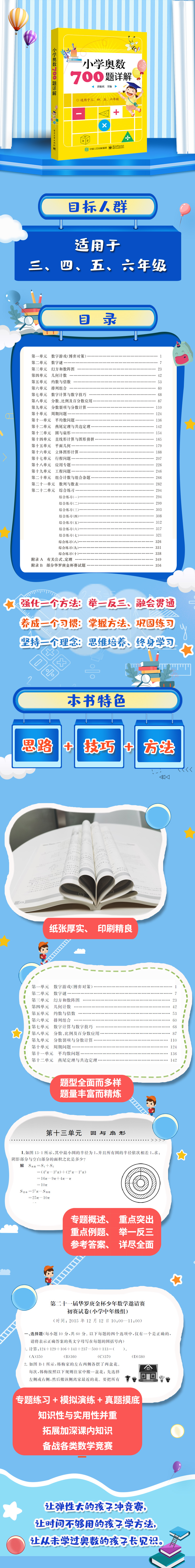 本书将奥数分为21个题型,每个题型设置20-50道习题,把一个题型从简单到高难度顺序排列,使学生在做习题的过程中,不区分年级,只区分题目的难度等级,让善于找规律的学生可以一鼓作气吃透整个体型;不善于找规律的同学可以从*简单的题目入手,通过详细讲解逐步渗透,帮助学生在奥数学习上突飞猛进。