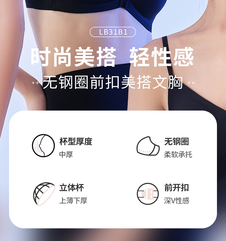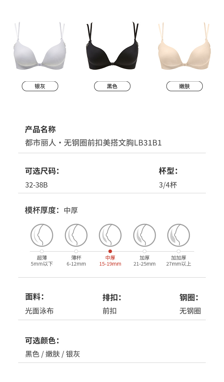 都市丽人B杯常规内衣零压无痕中厚光面泳布前扣无钢圈3/4杯常规文胸LB31B1