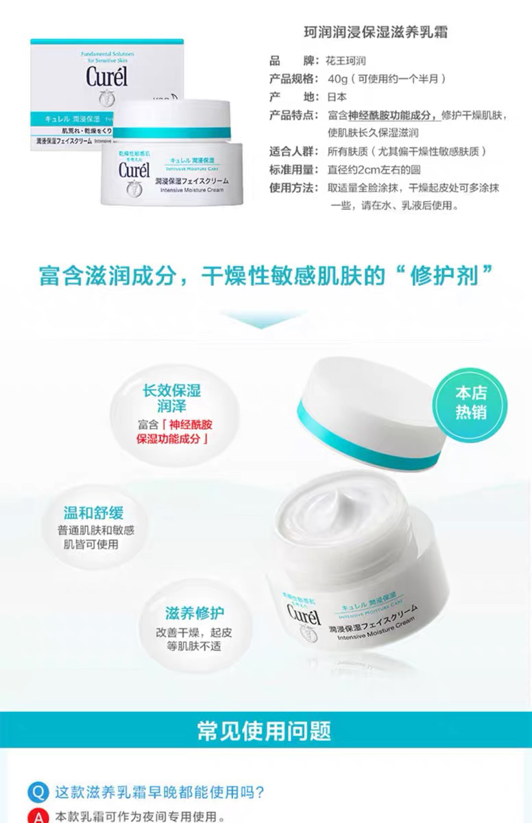 日本Curel珂润保湿滋养面霜 40g,属于让人特别安心不踩雷的面霜,简单的成份,对修复皮脂膜有非常好的功效。本身这个系列就是针对敏感干燥肌肤所研发,保湿抗敏、平衡水油、改善粗糙干纹。