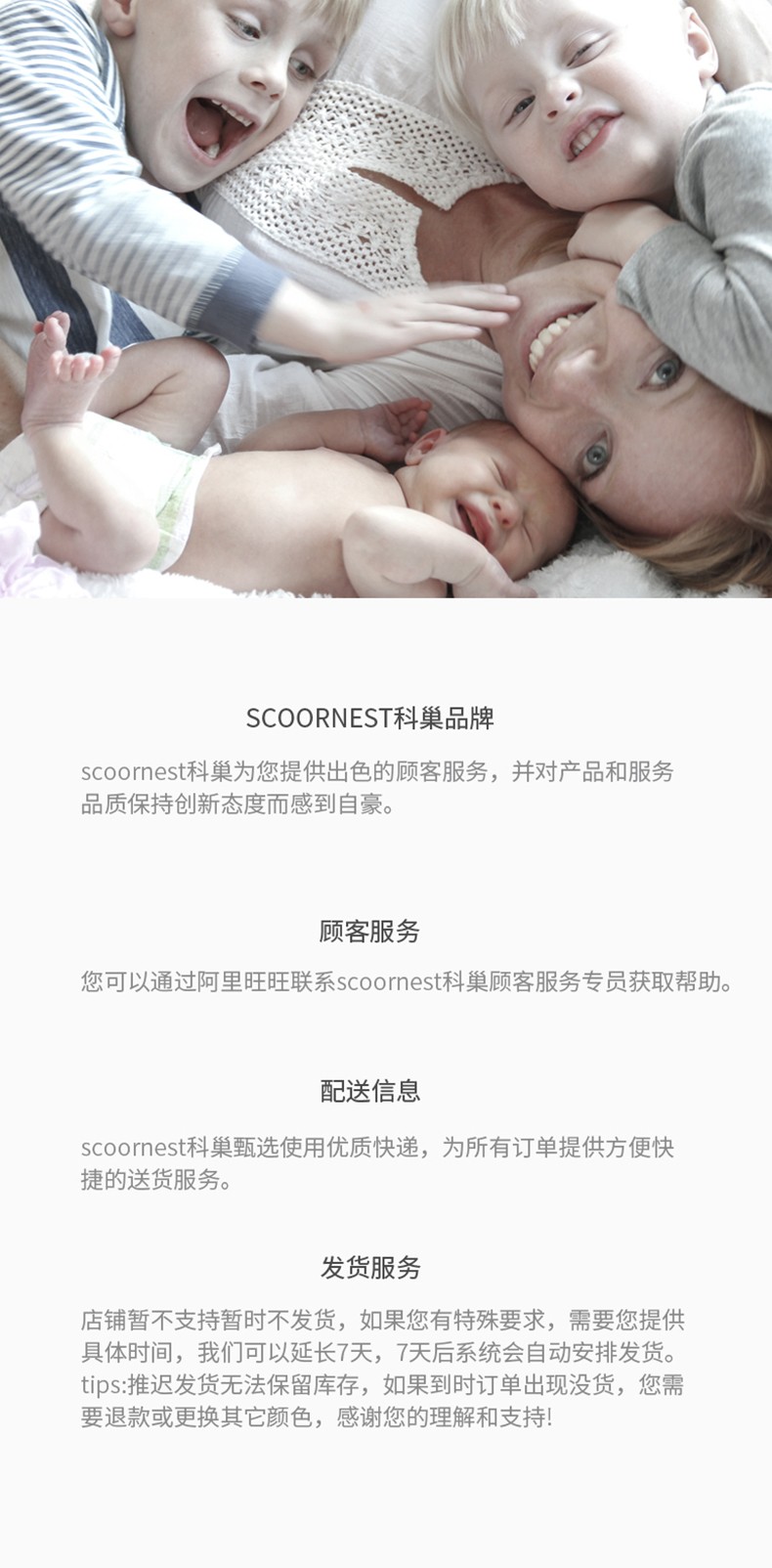 - Scoornest始终秉承给每一位宝宝送去科学的、关心的、创新的成长体验,通过提供商品和服务,使顾客形成守护、发展、巩固这种弥足珍贵的亲情的爱。