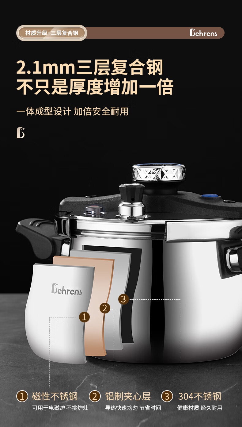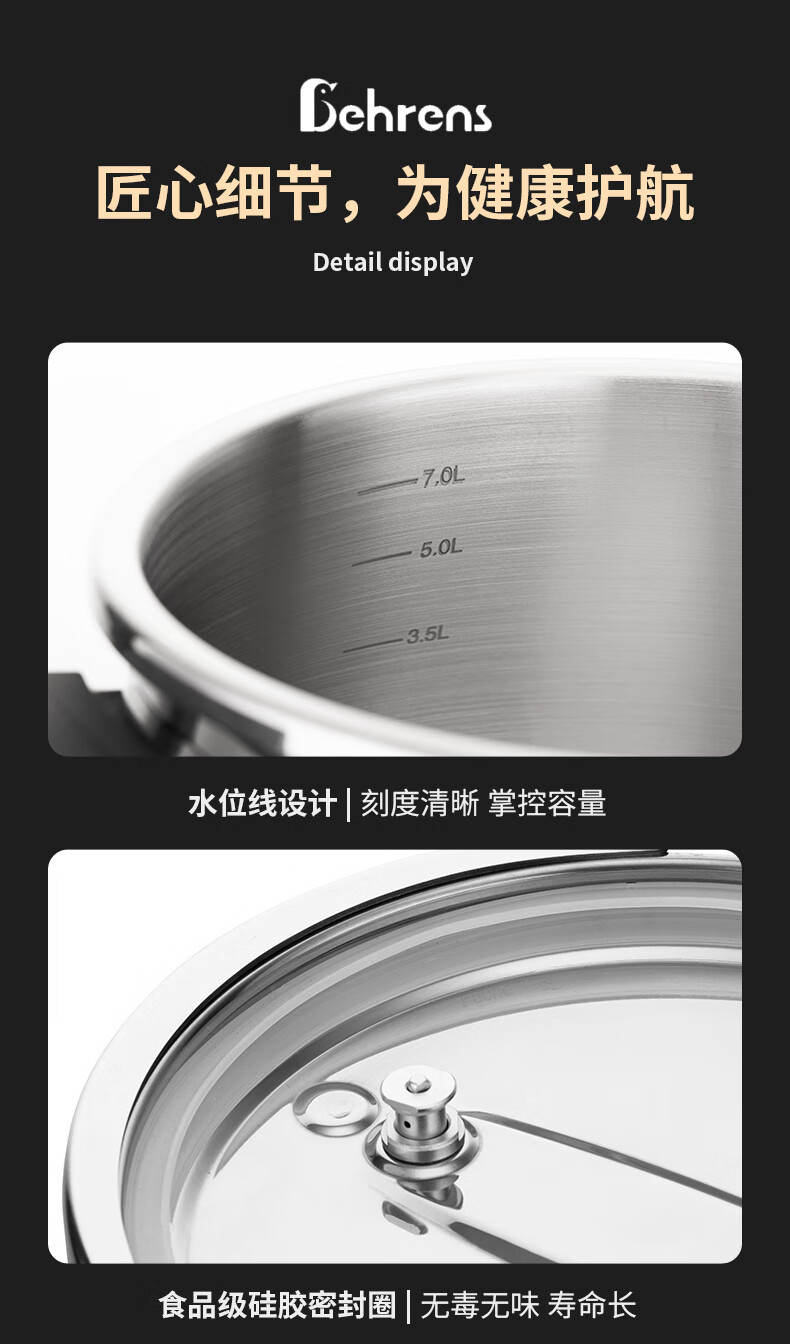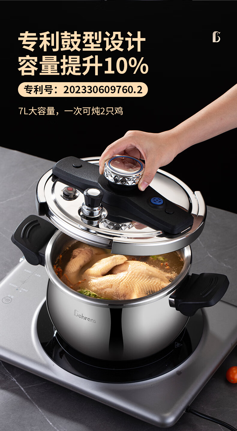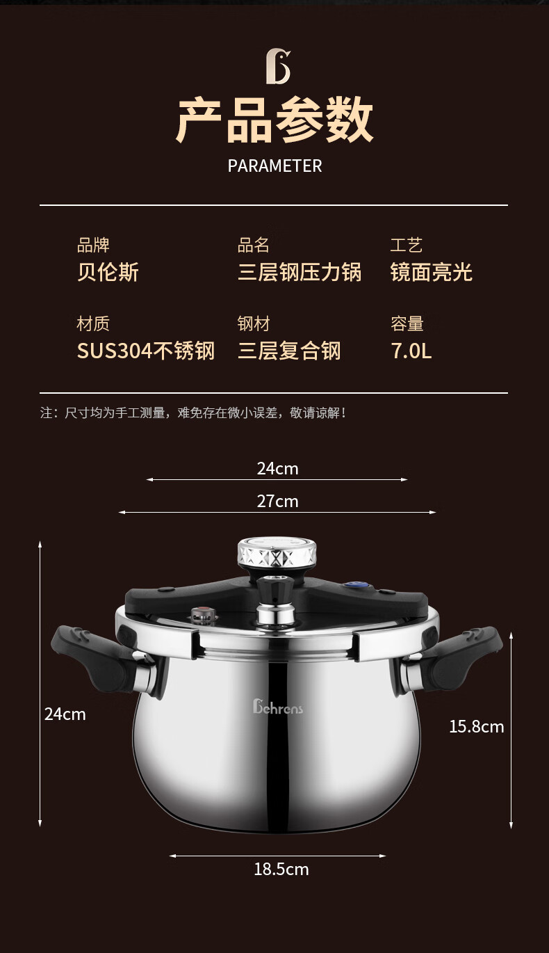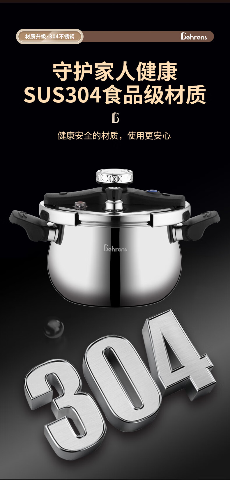 贝伦斯304不锈钢高压锅防爆家用燃气灶电磁炉通用旋压大容量压力锅7升