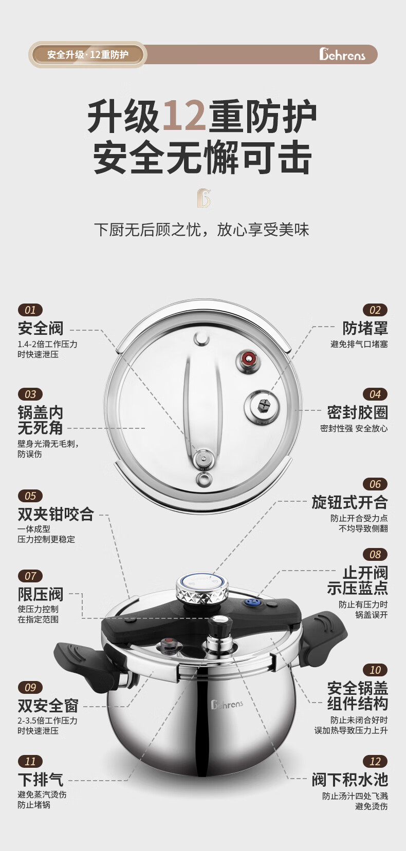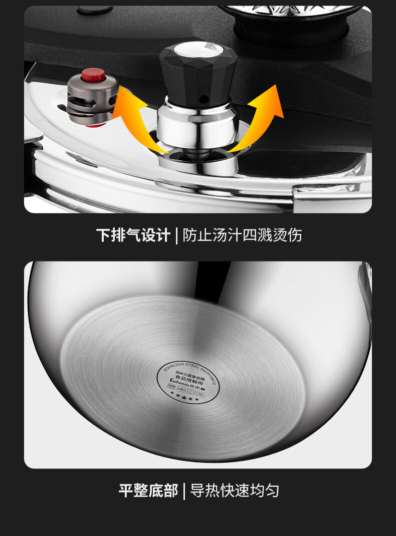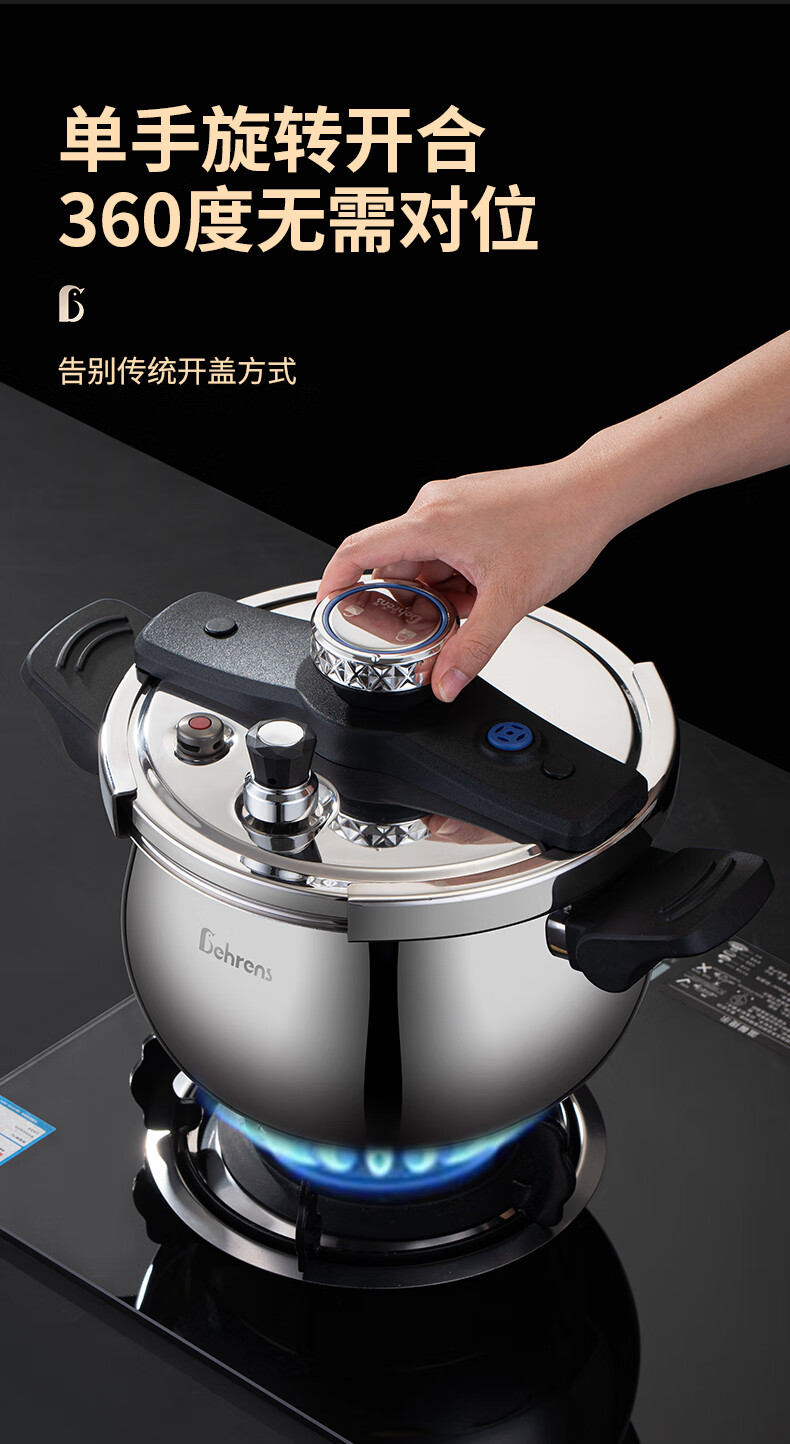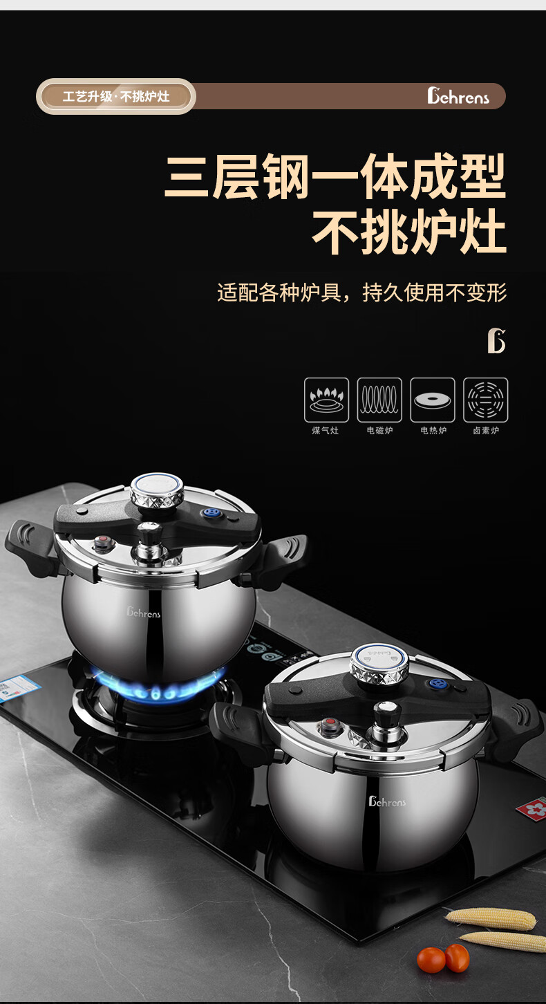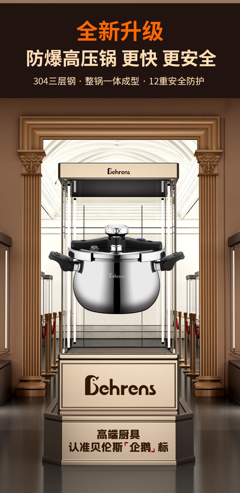 贝伦斯304不锈钢高压锅防爆家用燃气灶电磁炉通用旋压大容量压力锅7升