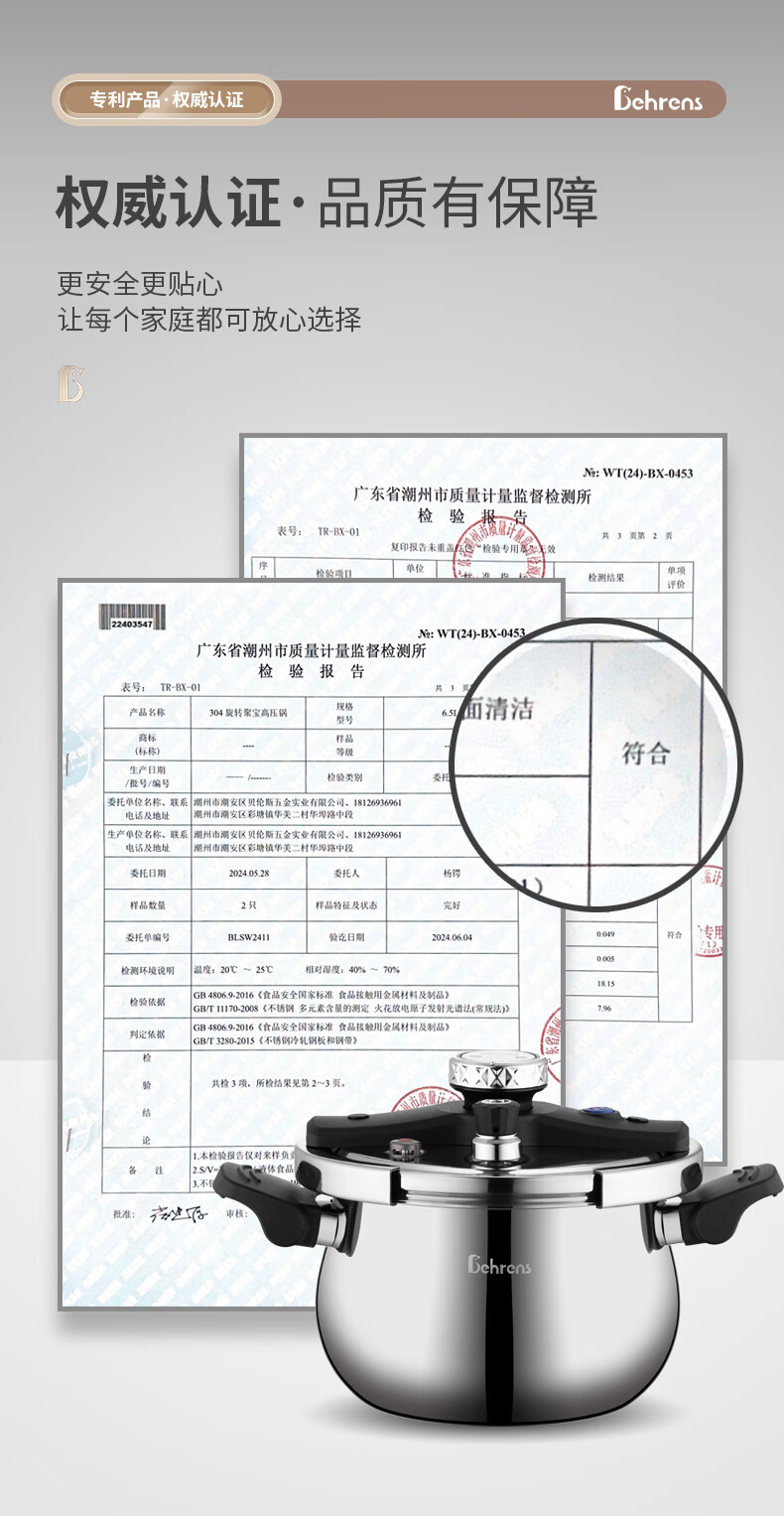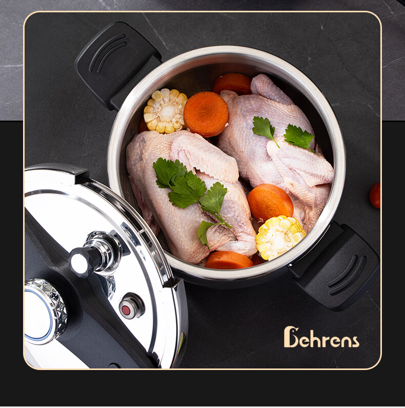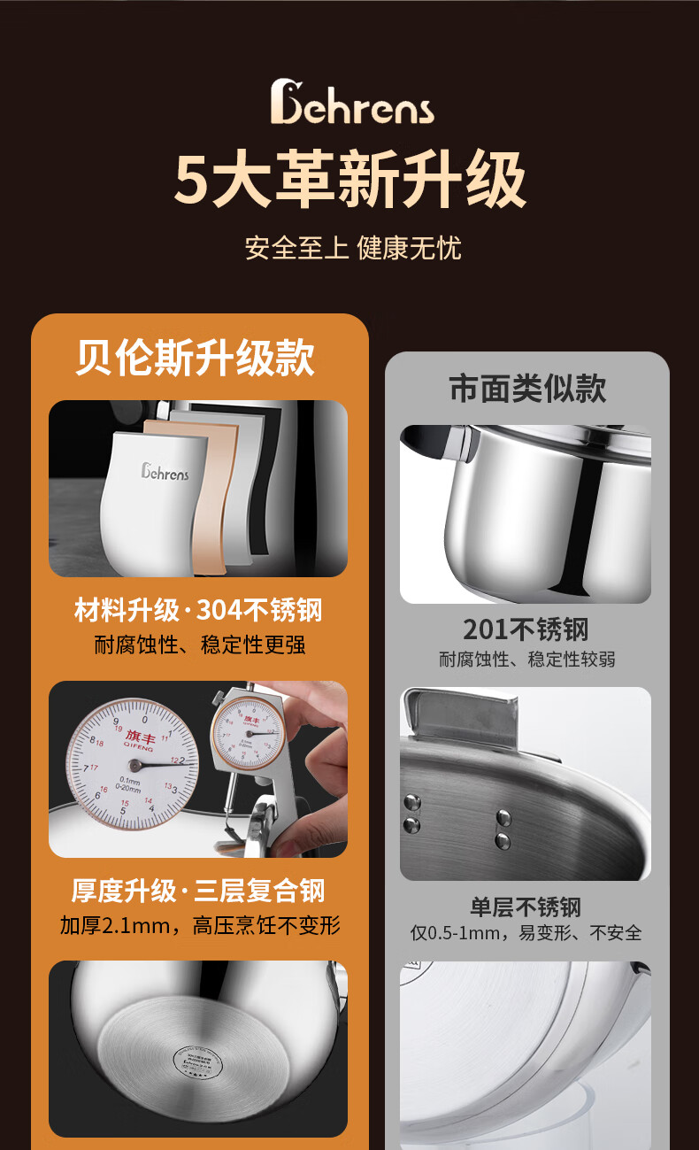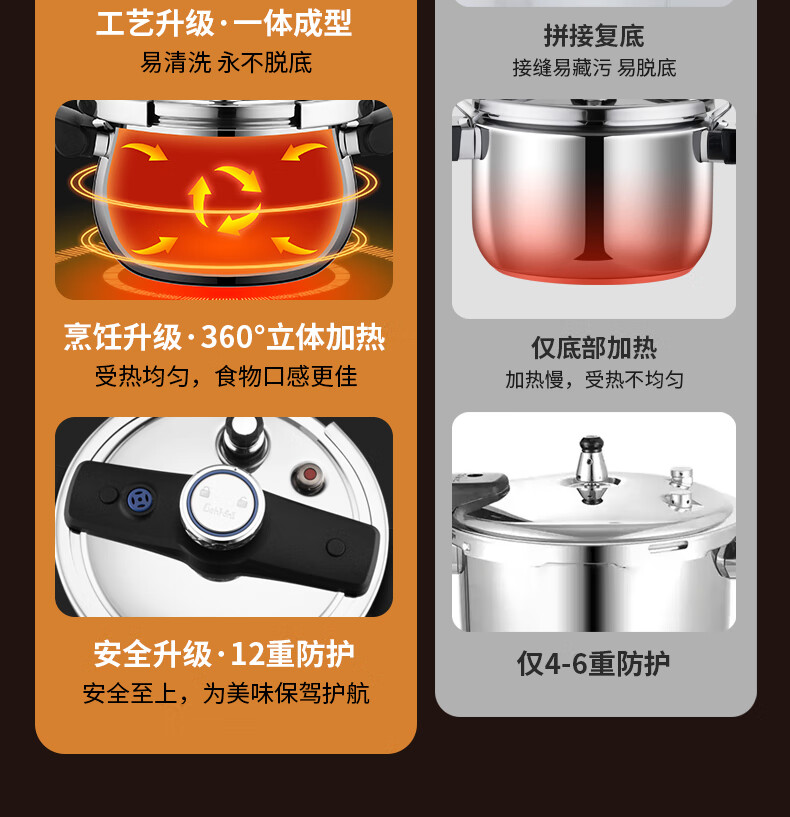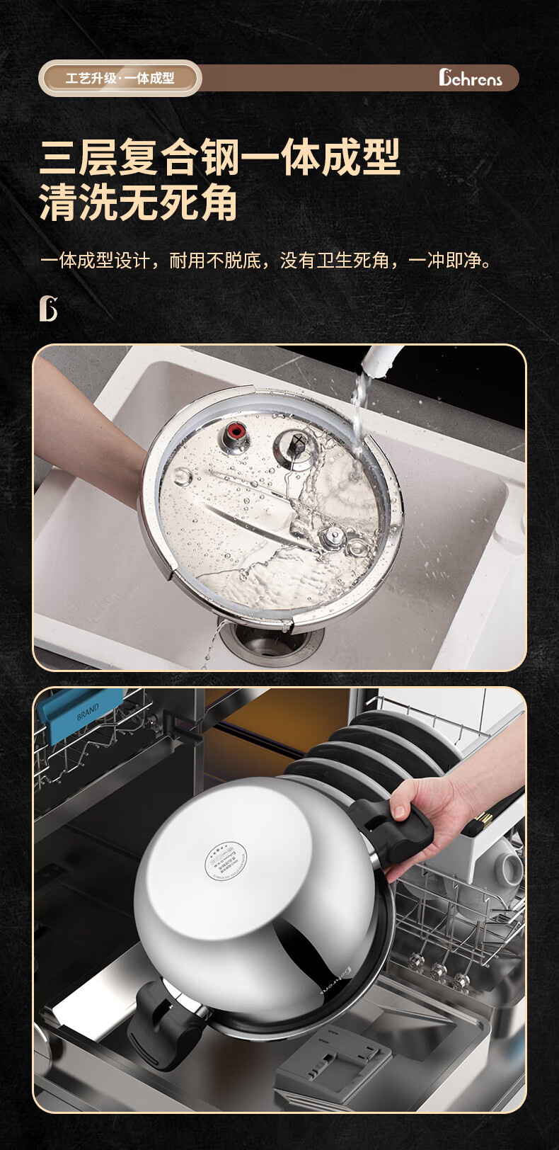 贝伦斯304不锈钢高压锅防爆家用燃气灶电磁炉通用旋压大容量压力锅7升