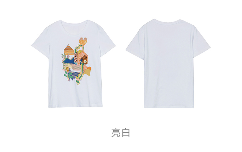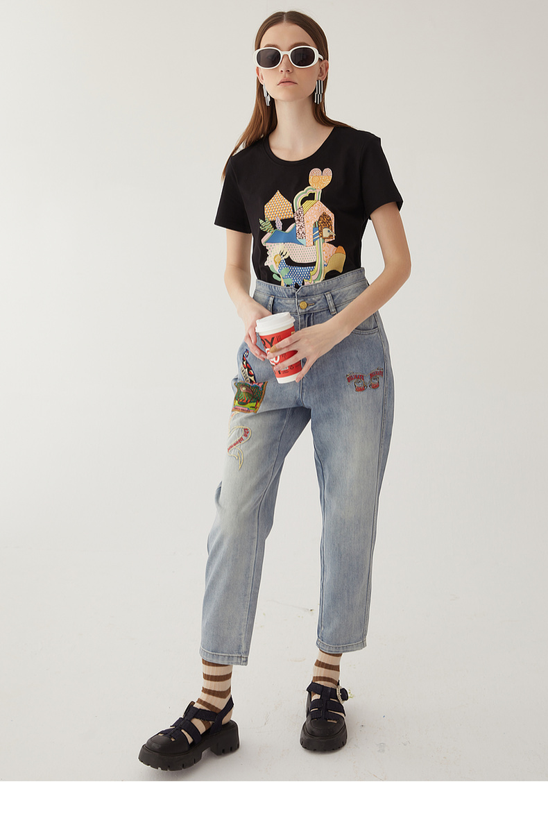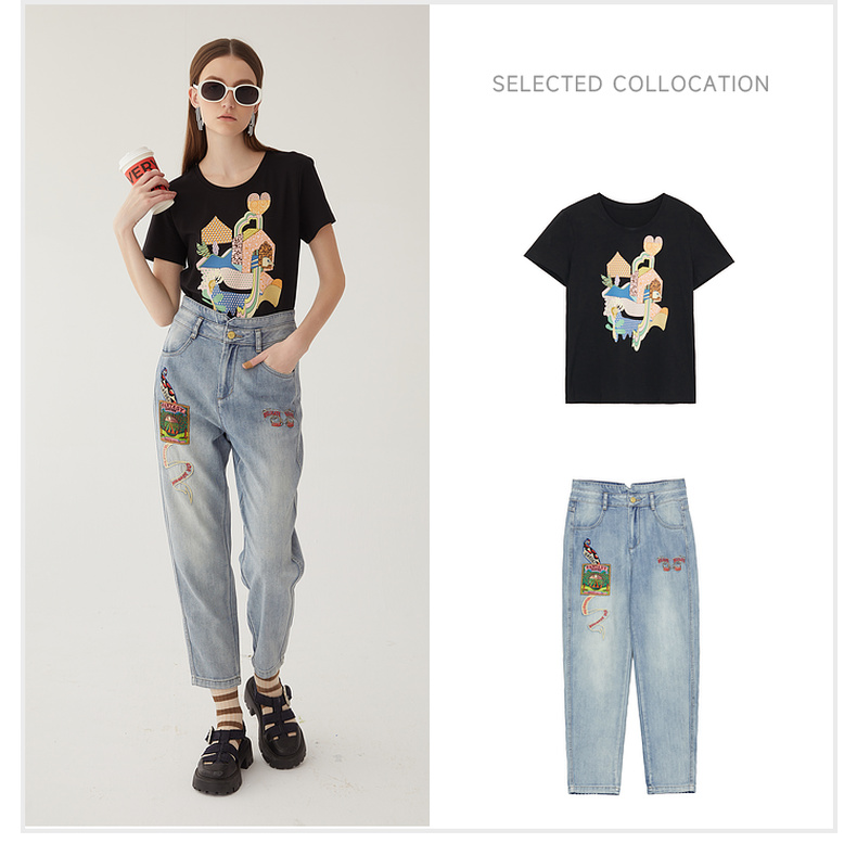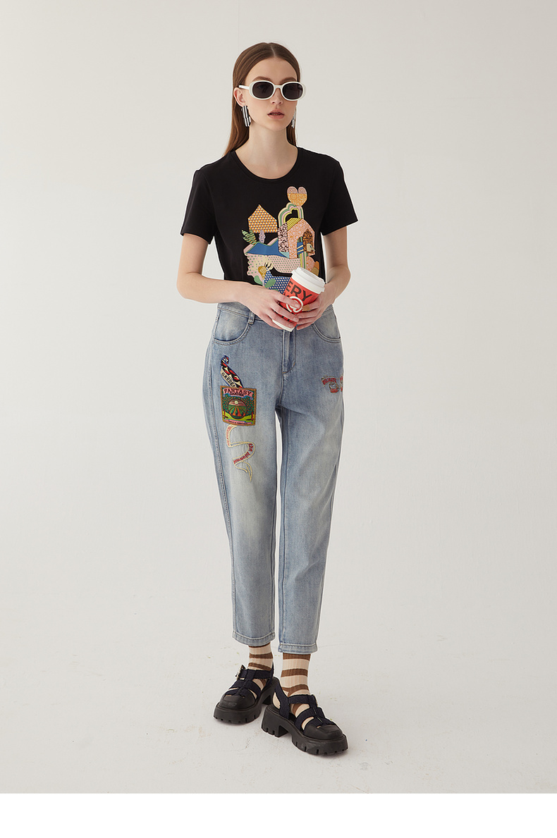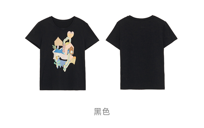 谜底2024夏季新款圆领特色印花T恤短袖女修身绣花上衣女246MT7051