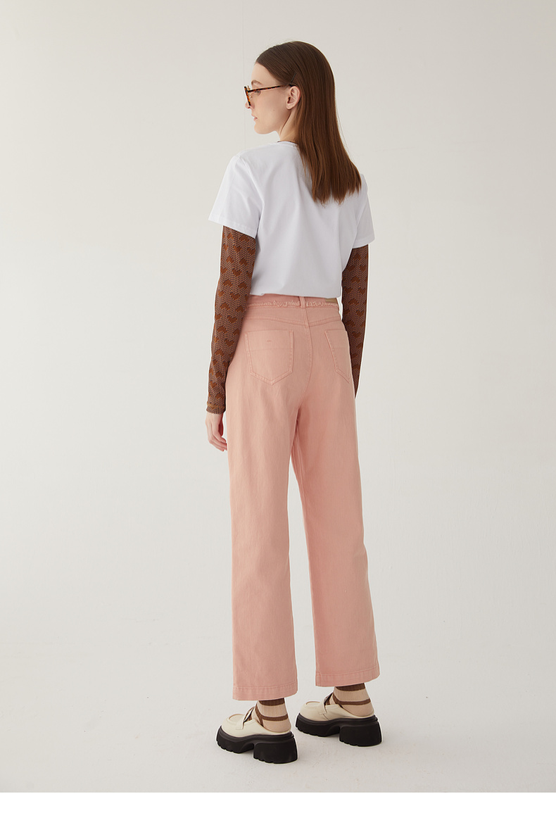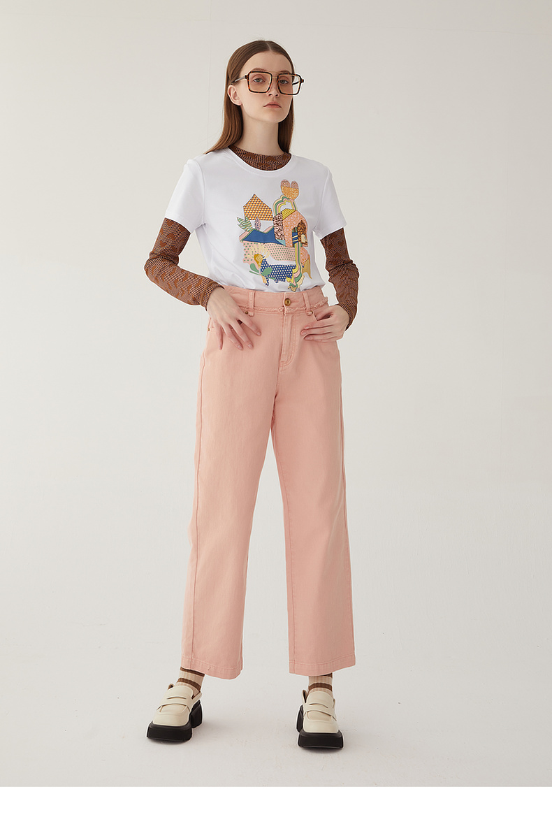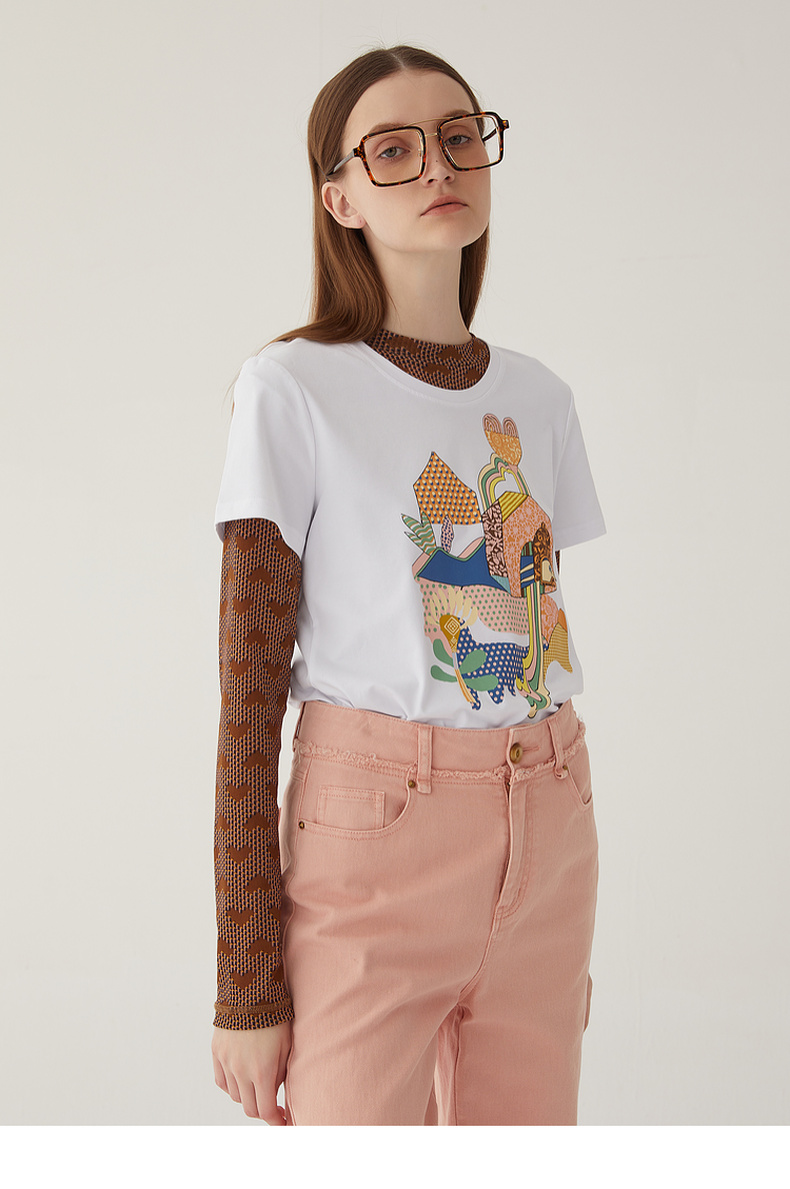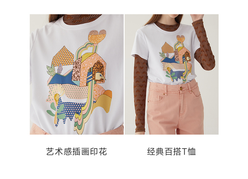 谜底2024夏季新款圆领特色印花T恤短袖女修身绣花上衣女246MT7051