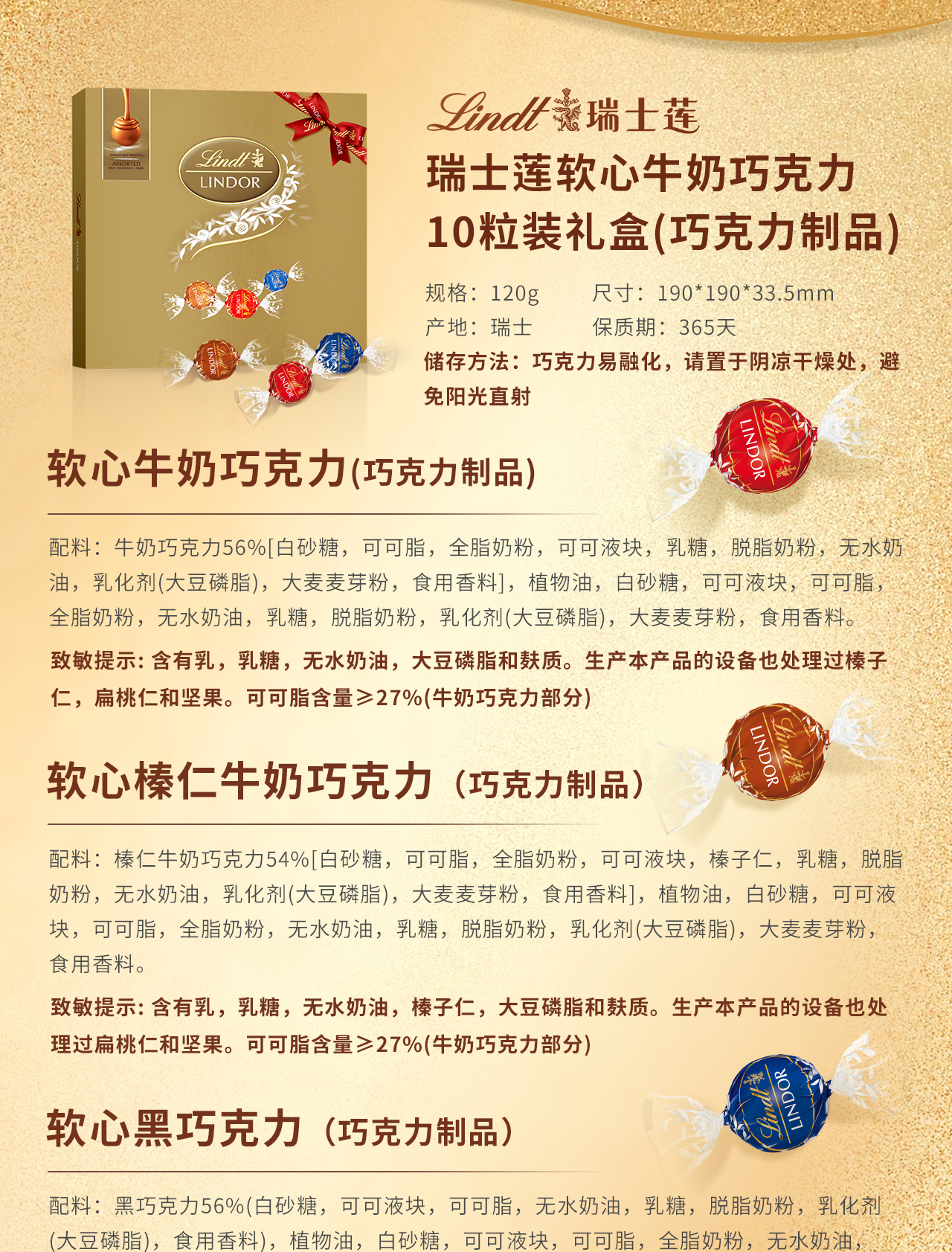 【瑞士莲】软心精选巧克力礼盒120g(10粒)