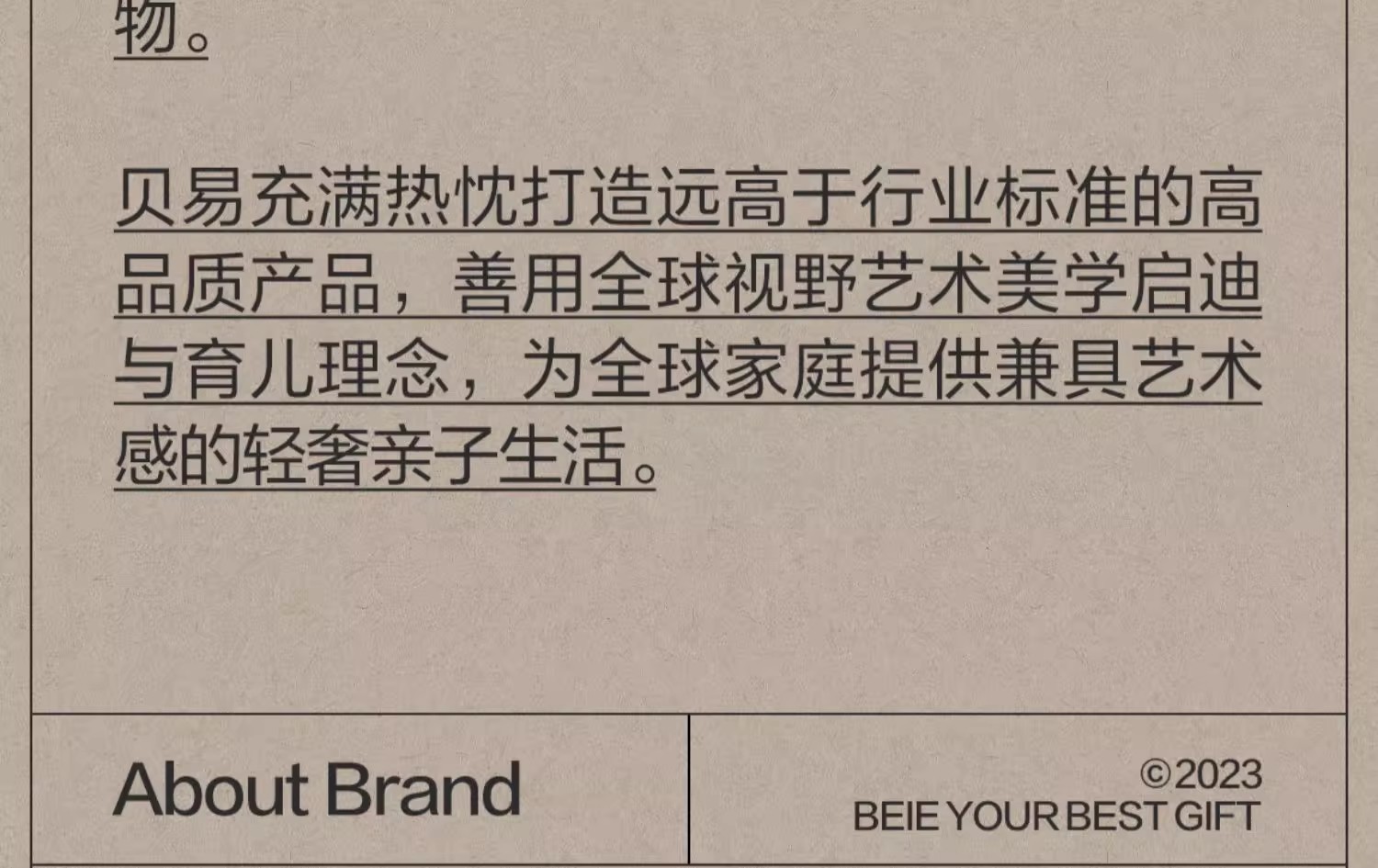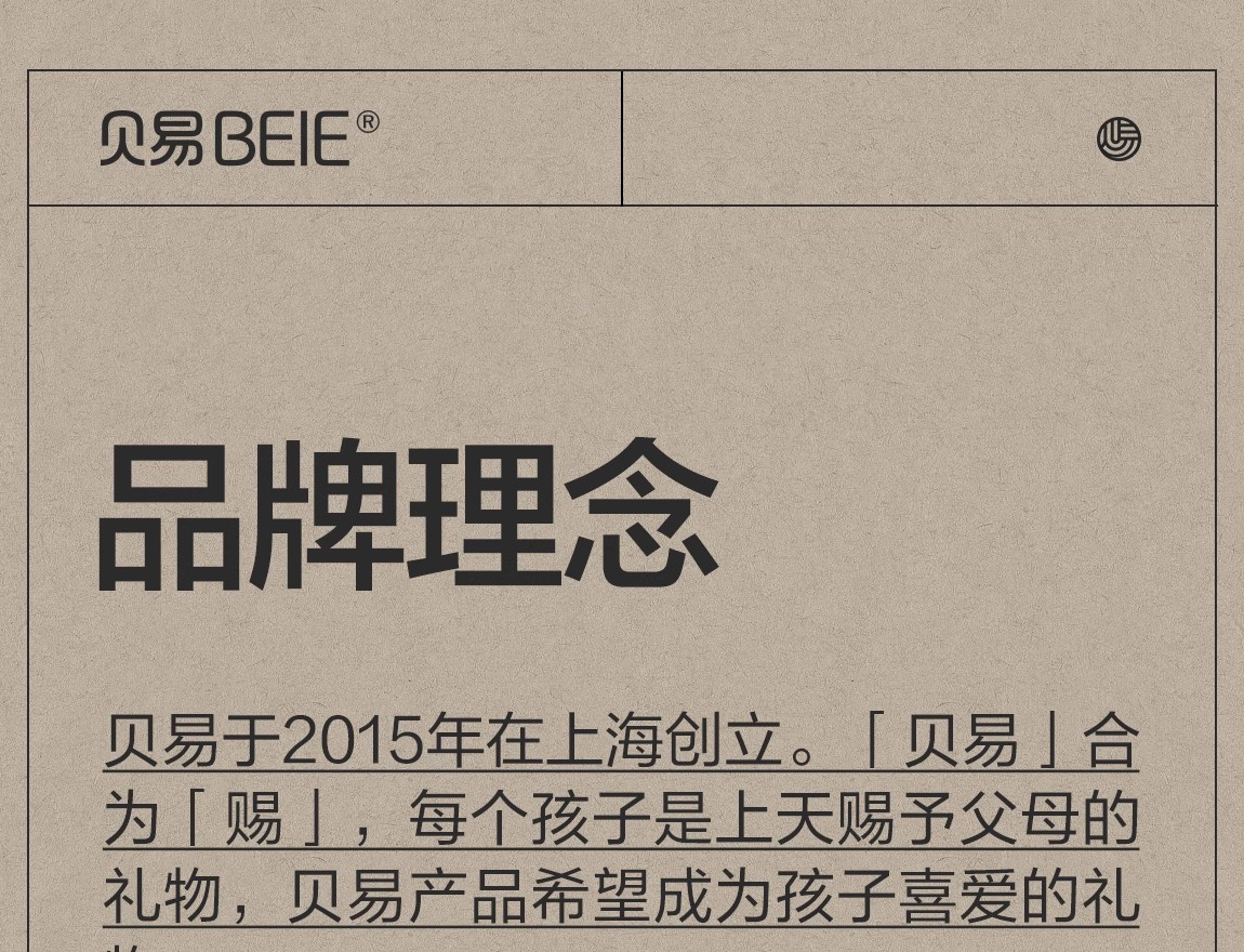 - 「BEIESTATE贝易」以极简设计为风格,主打兼顾设计、品 质和性价比的母婴产品,以创造极致细腻、不张扬、 不世俗的当代母婴用具,为用户日常亲子生活与幼儿 的启蒙早教提供新选择。
