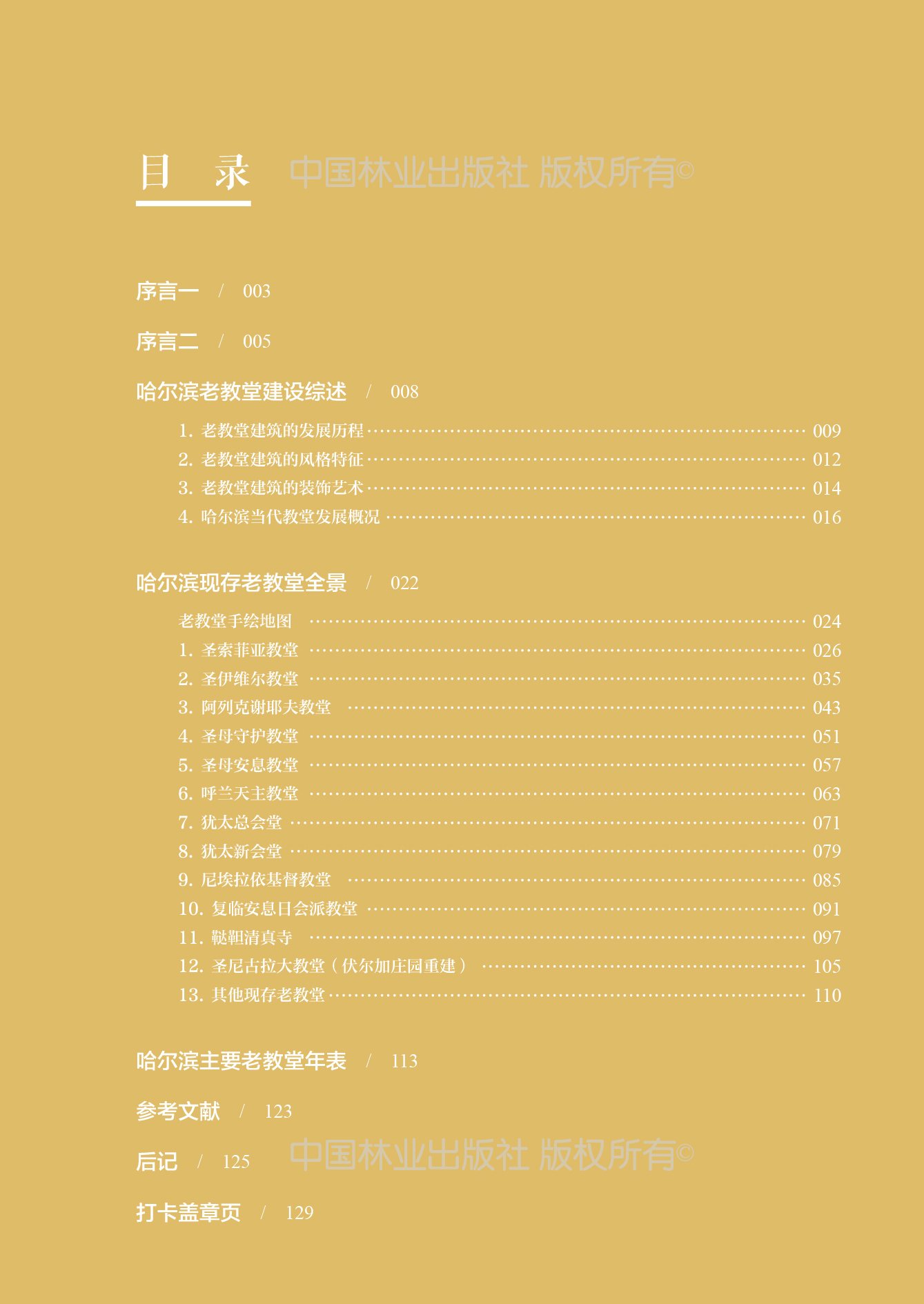 ·第三部分 哈尔滨主要老教堂年表。按时间顺序记录35座老教堂的名称、保存情况及时间地点等信息,配以珍贵老照片,准确清晰。