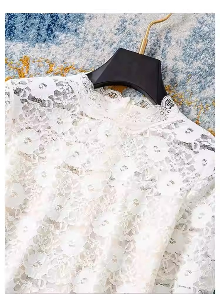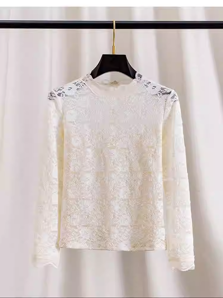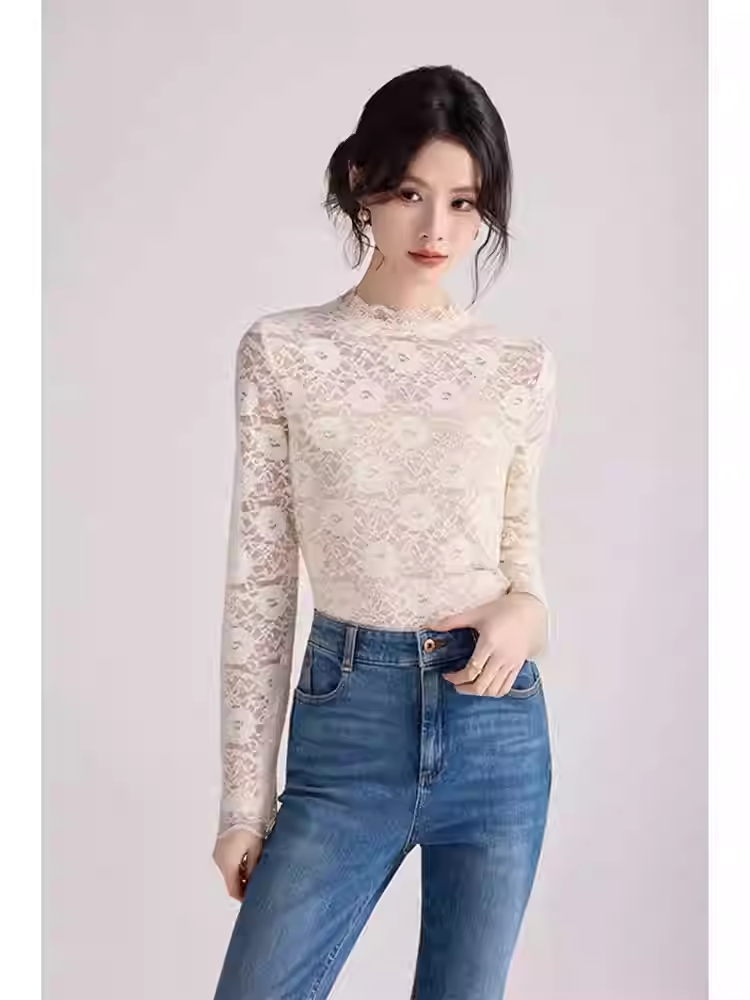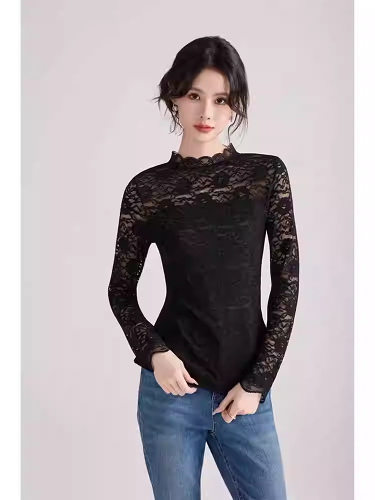 轻奢简约~亲肤蕾丝立领长袖打底衫女2026春季新款设计感百搭上衣