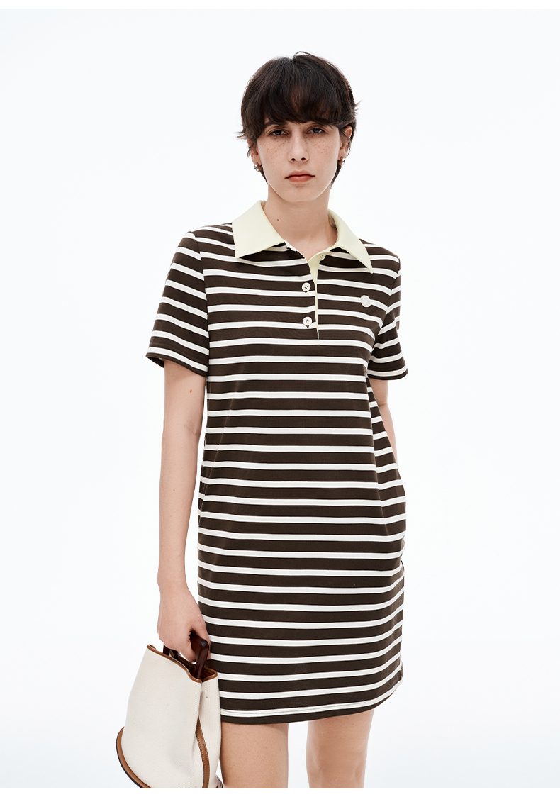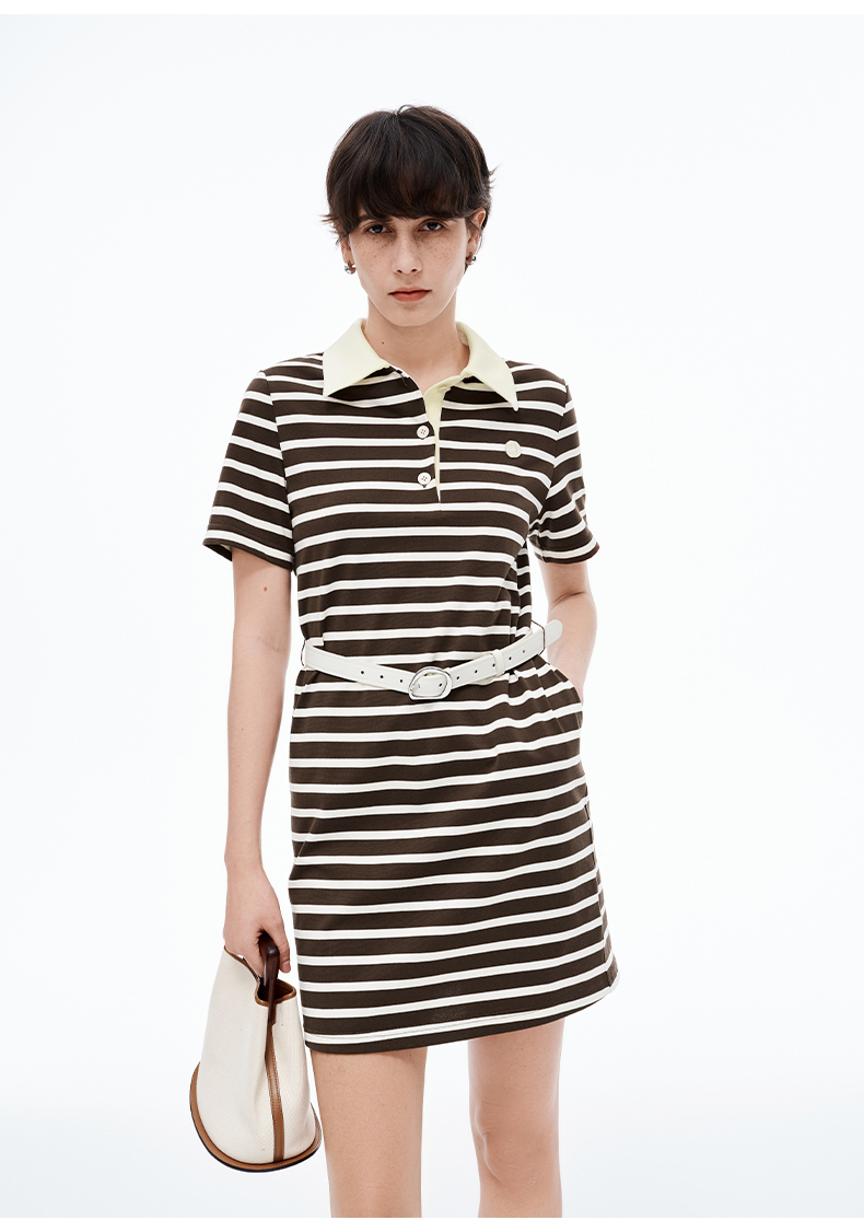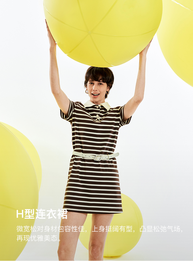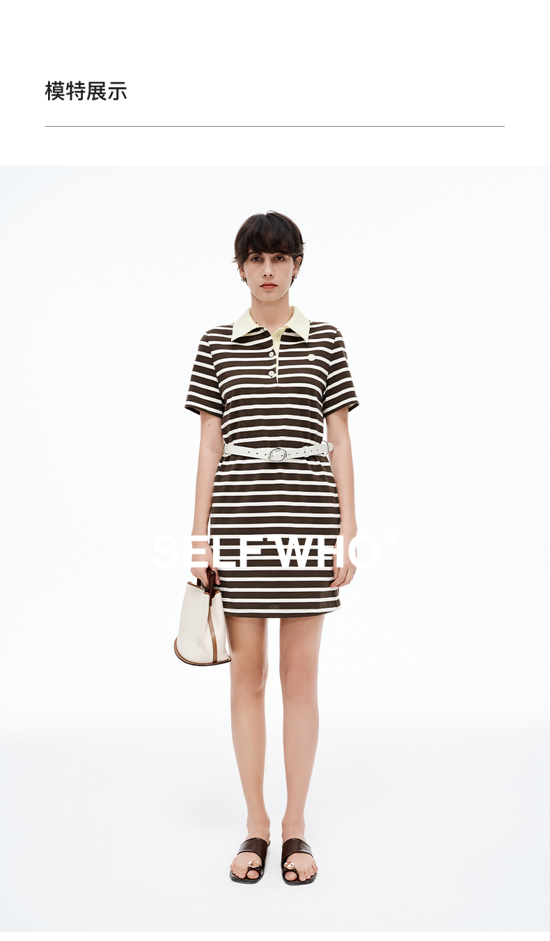 SELFWHO笑脸衣橱棉混纺经典条纹连衣裙夏季新款翻领H型裙子