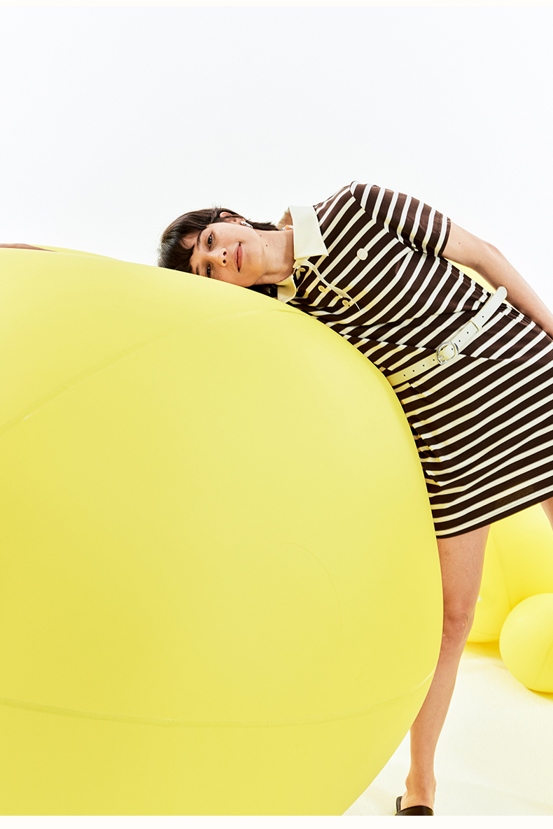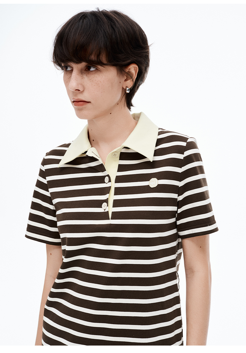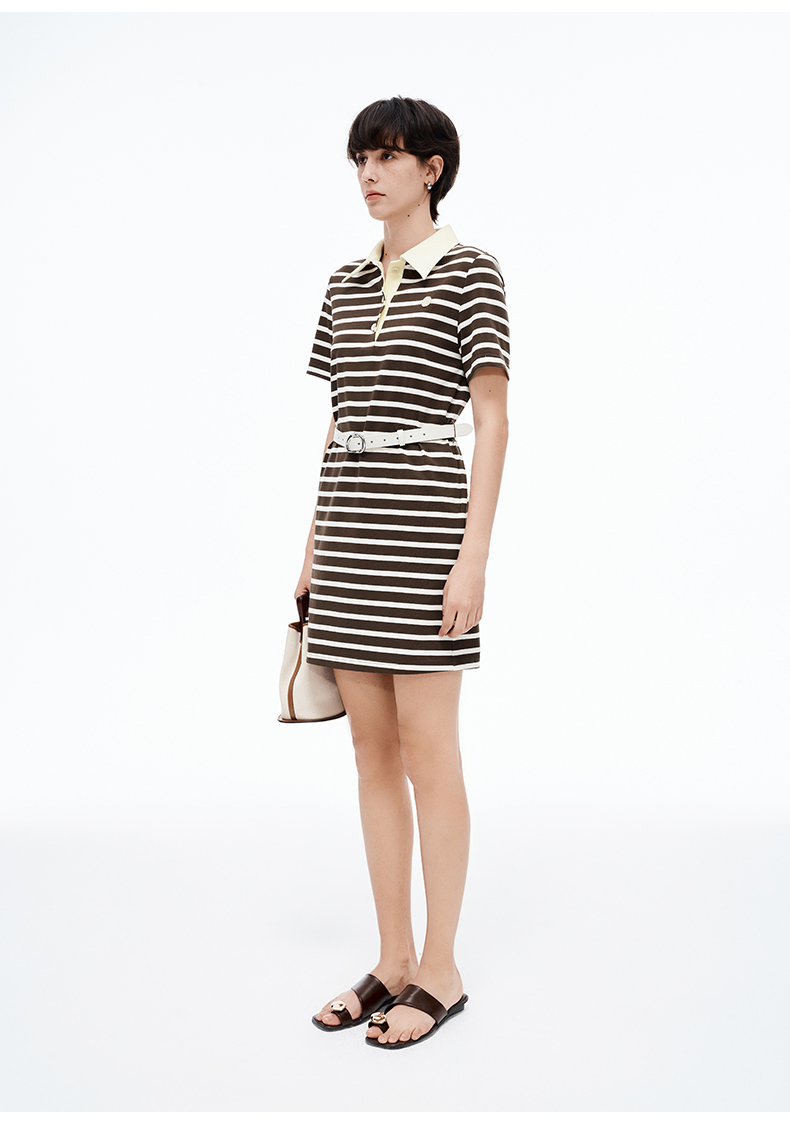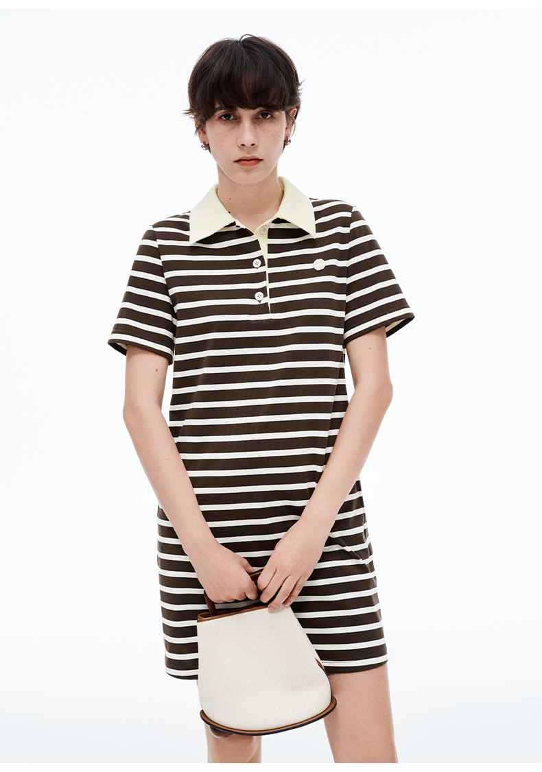 SELFWHO笑脸衣橱棉混纺经典条纹连衣裙夏季新款翻领H型裙子