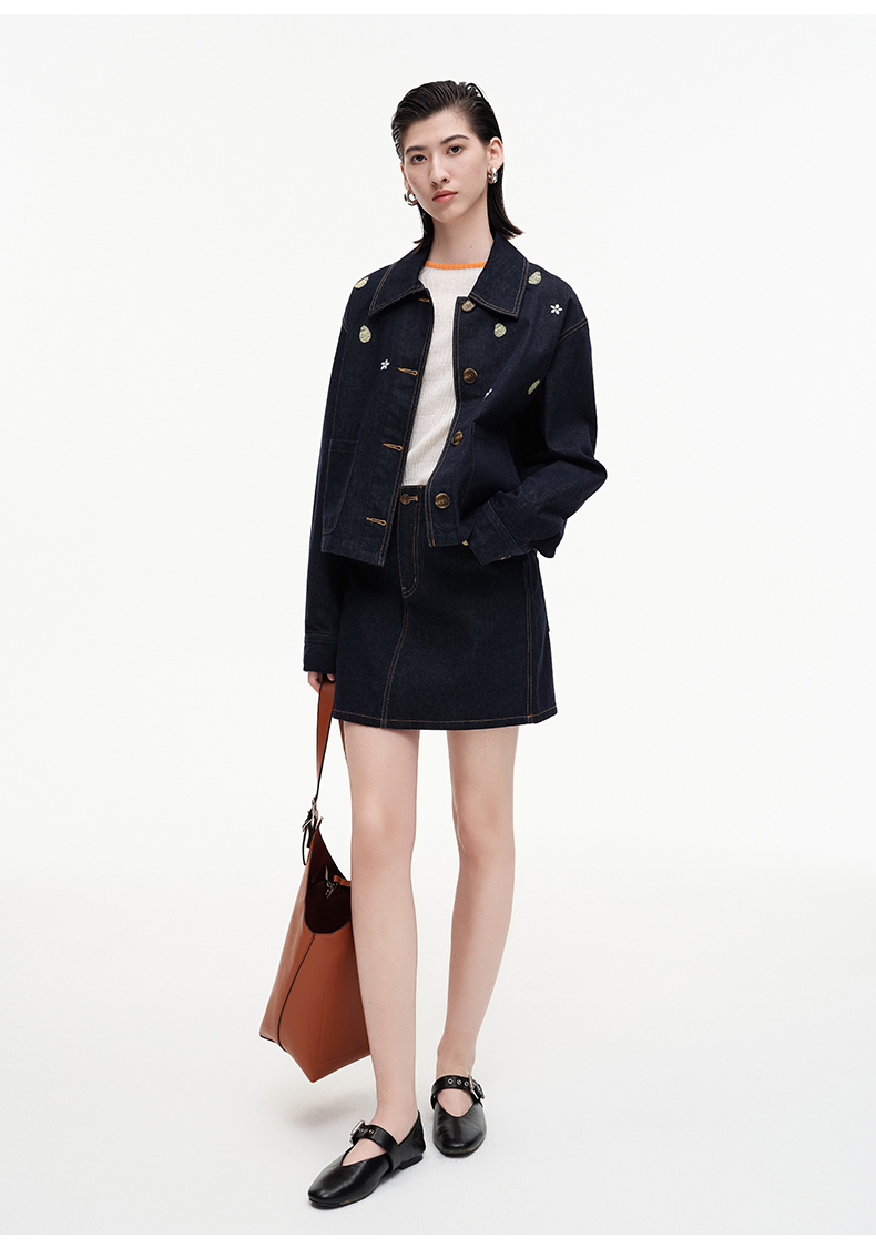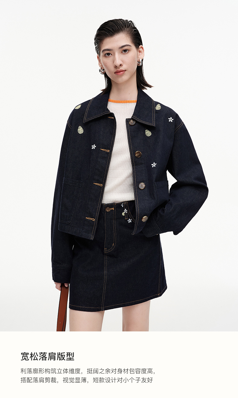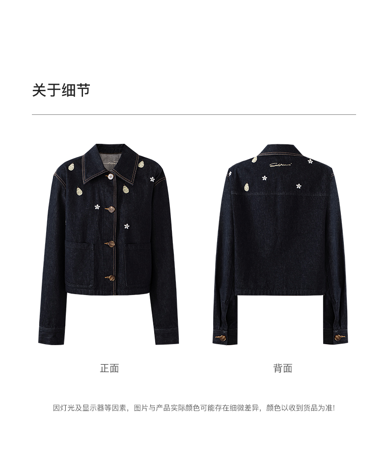 SELFWHO棉混纺原牛风梨花刺绣牛仔外套女2025秋新款复古翻领上衣