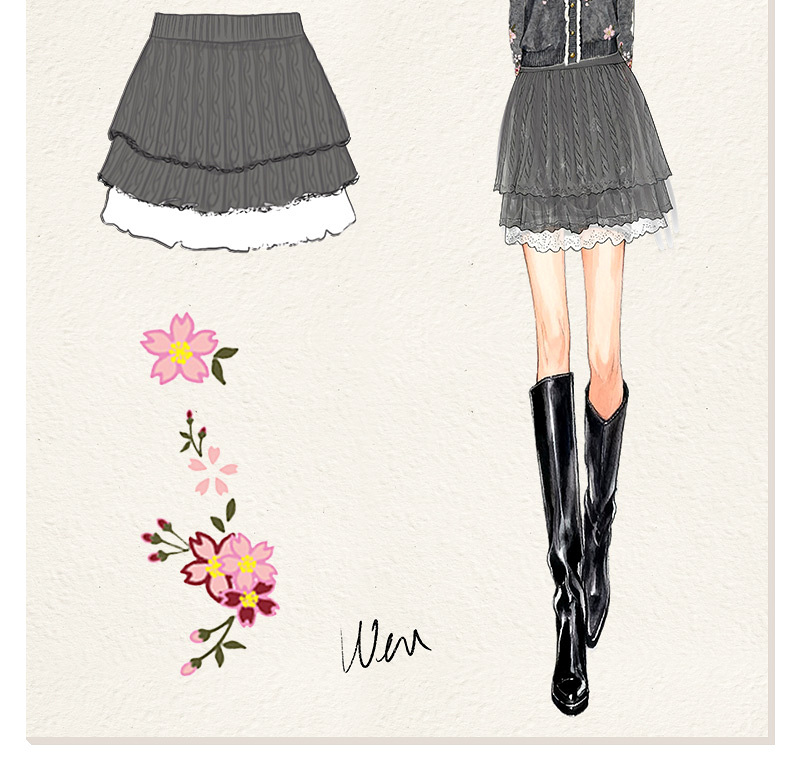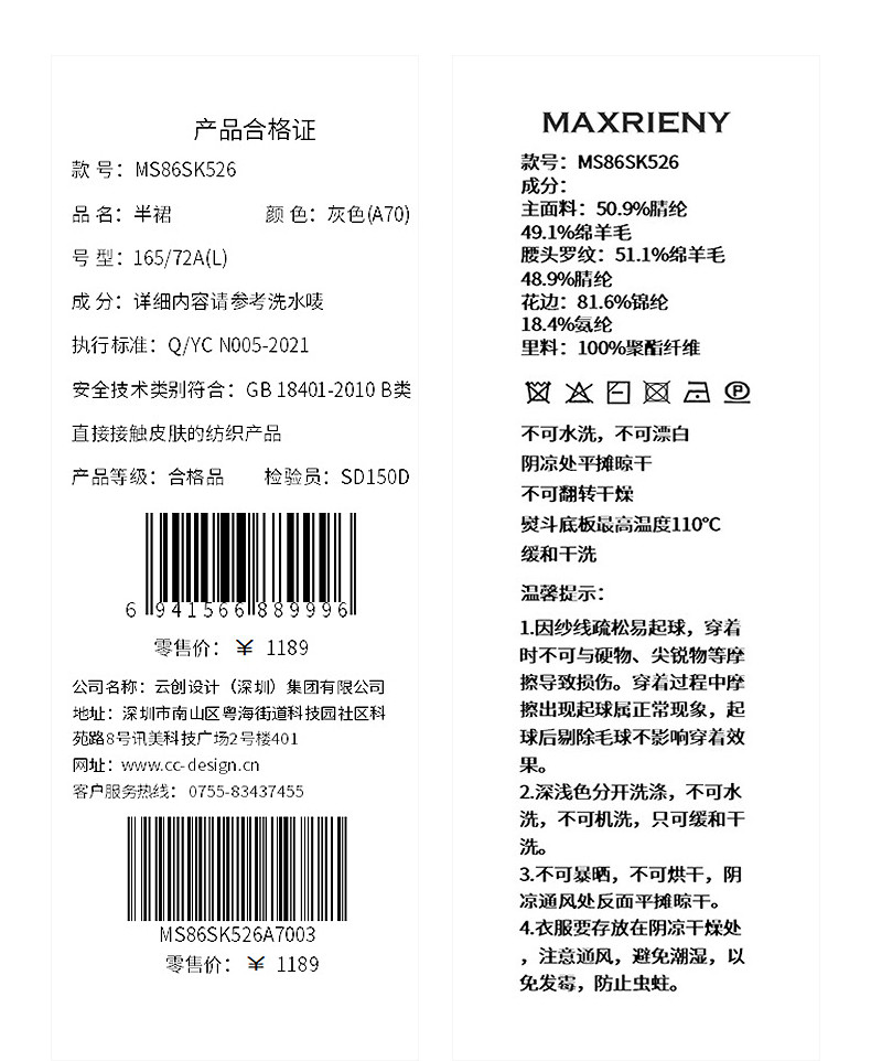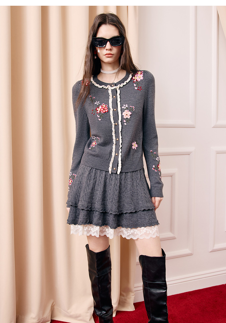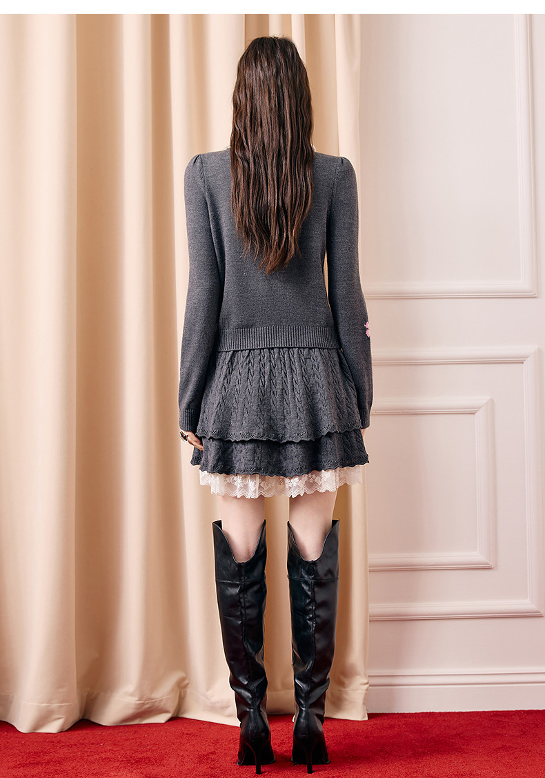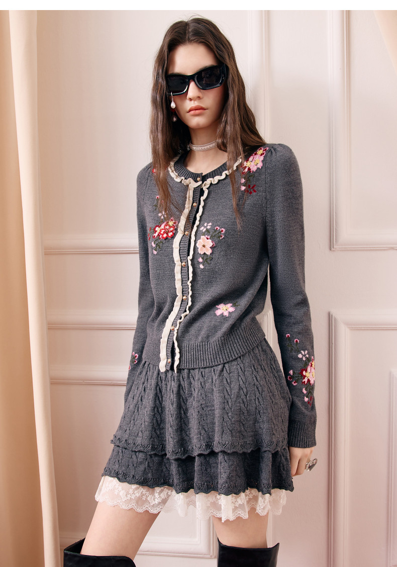 天虹发货:MAXRIENY格雷系穿搭散摆蕾丝拼接短裙羊毛混纺半裙25冬款(货号:MS86SK526)