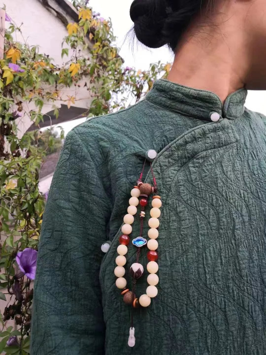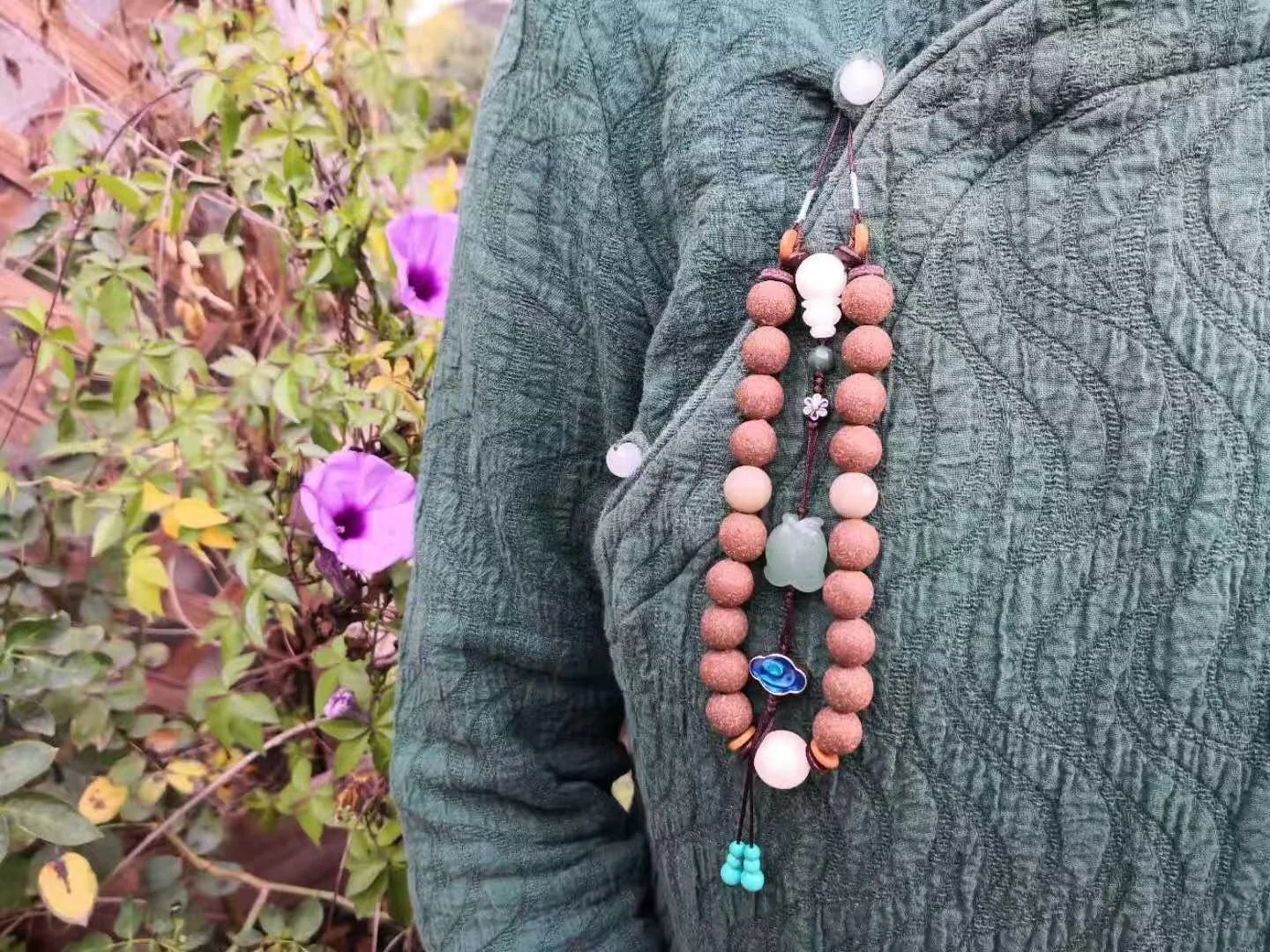 十八子三通出有挂绳,可用于压襟佩戴,具体佩戴搭配方式见下图。