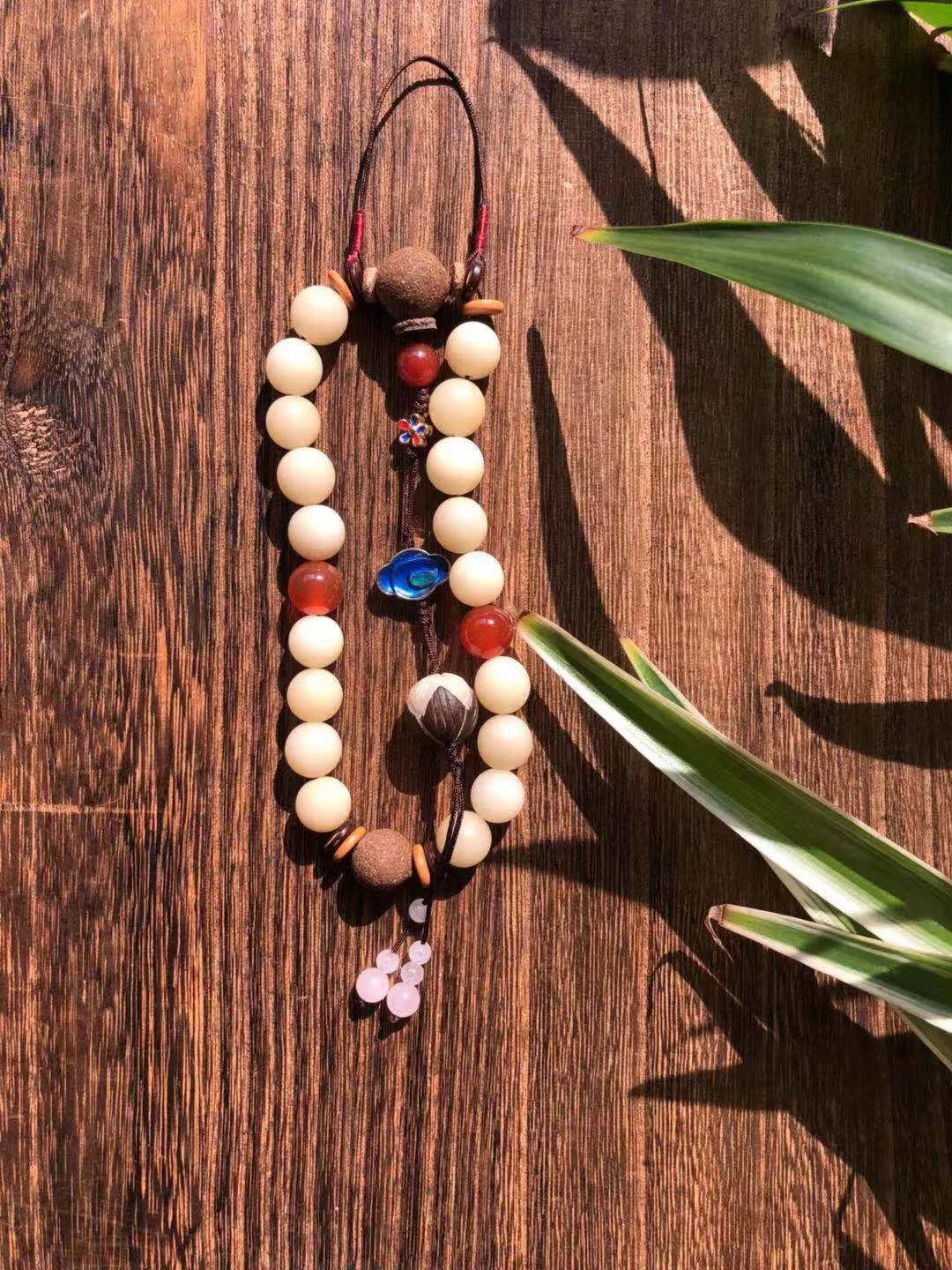 此款十八子为压襟款,分为阳春款和白雪款,阳春的顶珠和三通为雍华香珠制成;白雪的顶珠和三通为白菩提根制成。二者相辅相成,颜色对比方便日常搭配各色衣服。