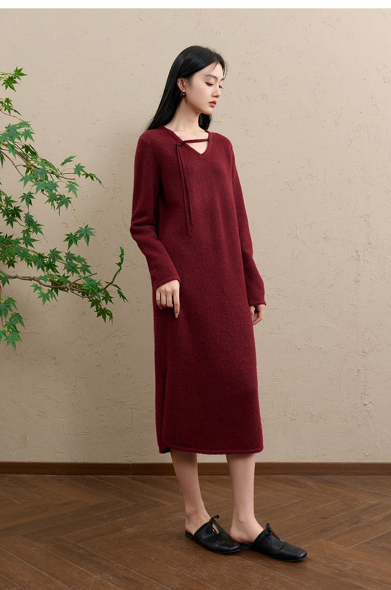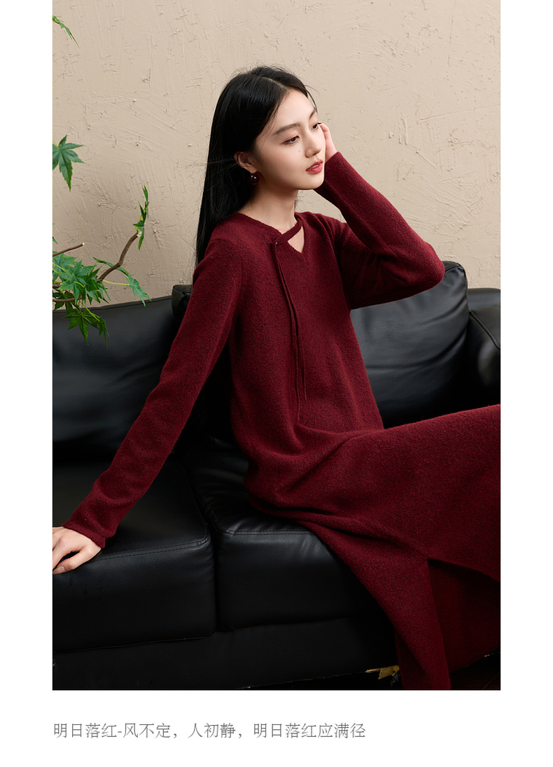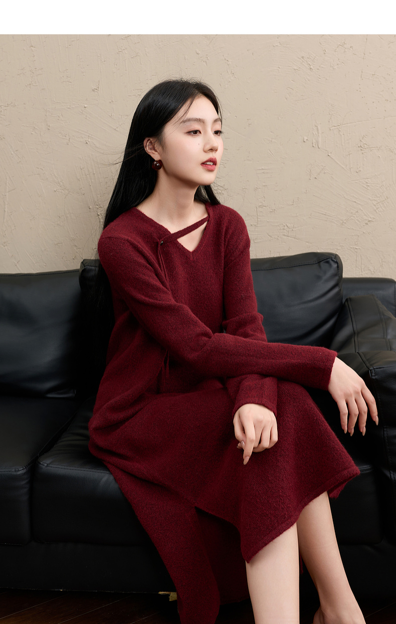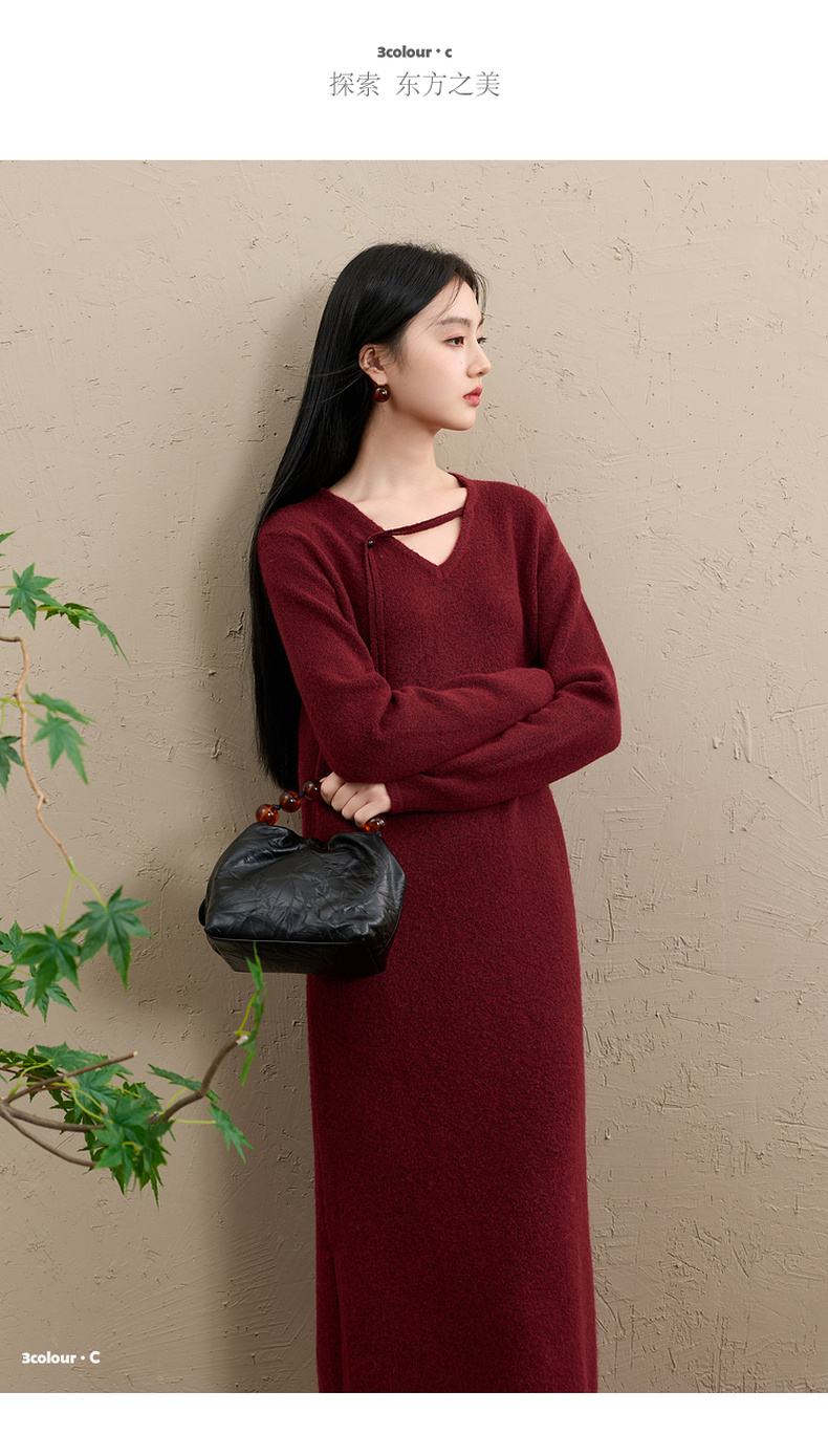 三彩【明日落红】2025冬季新款针织裙V领宽松开叉长裙C