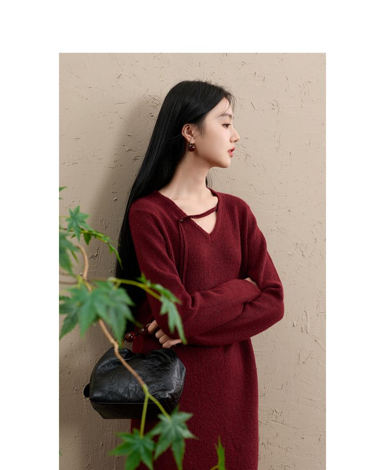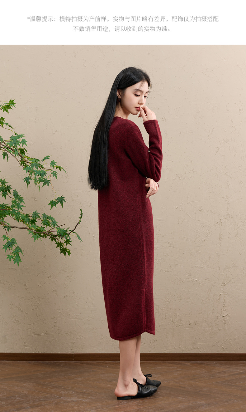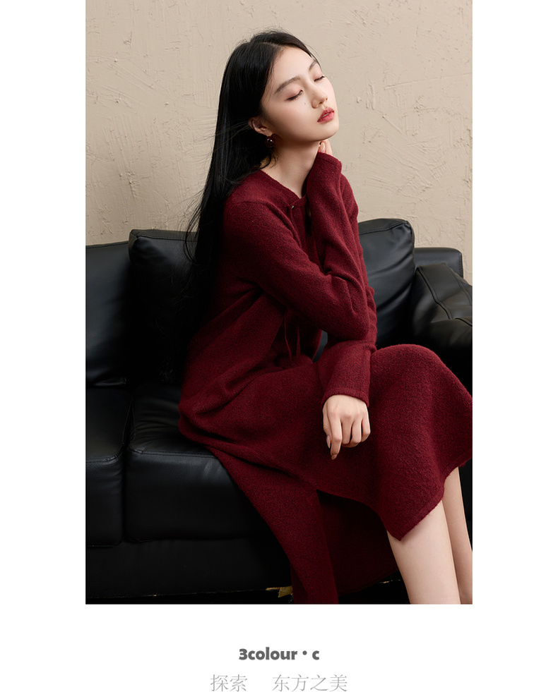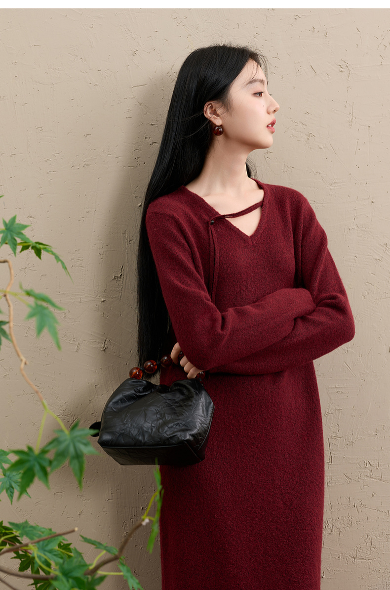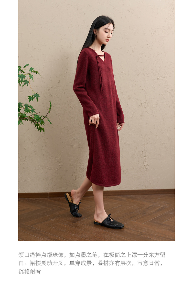 三彩【明日落红】2025冬季新款针织裙V领宽松开叉长裙C