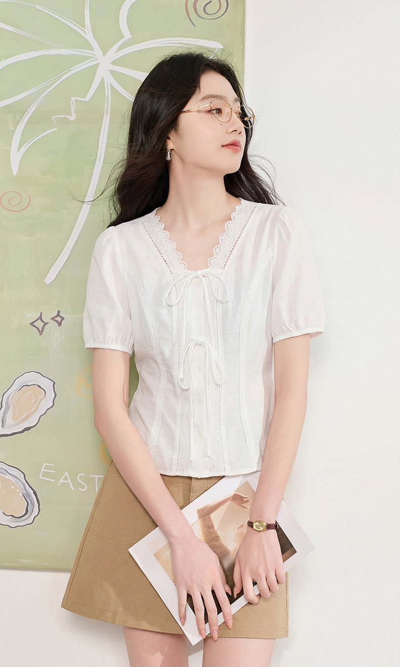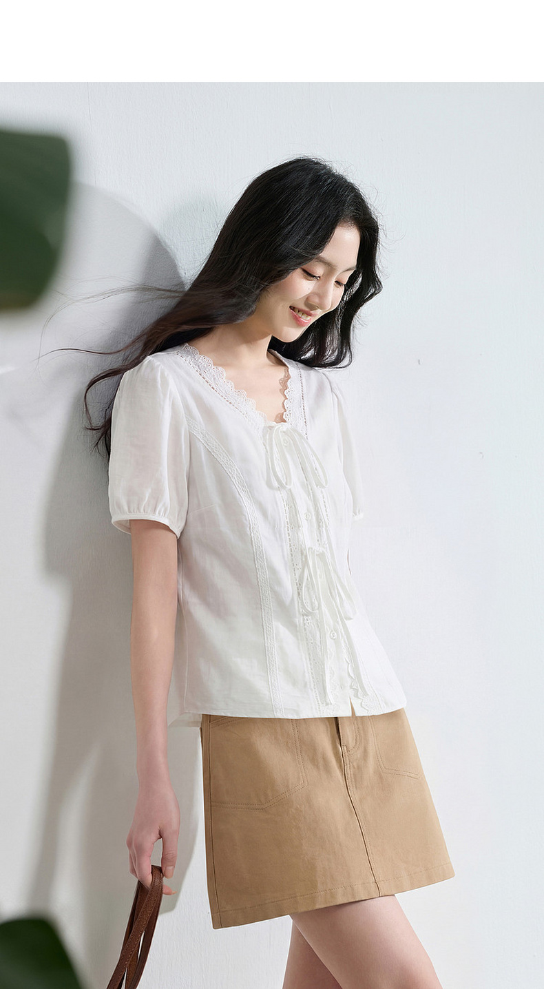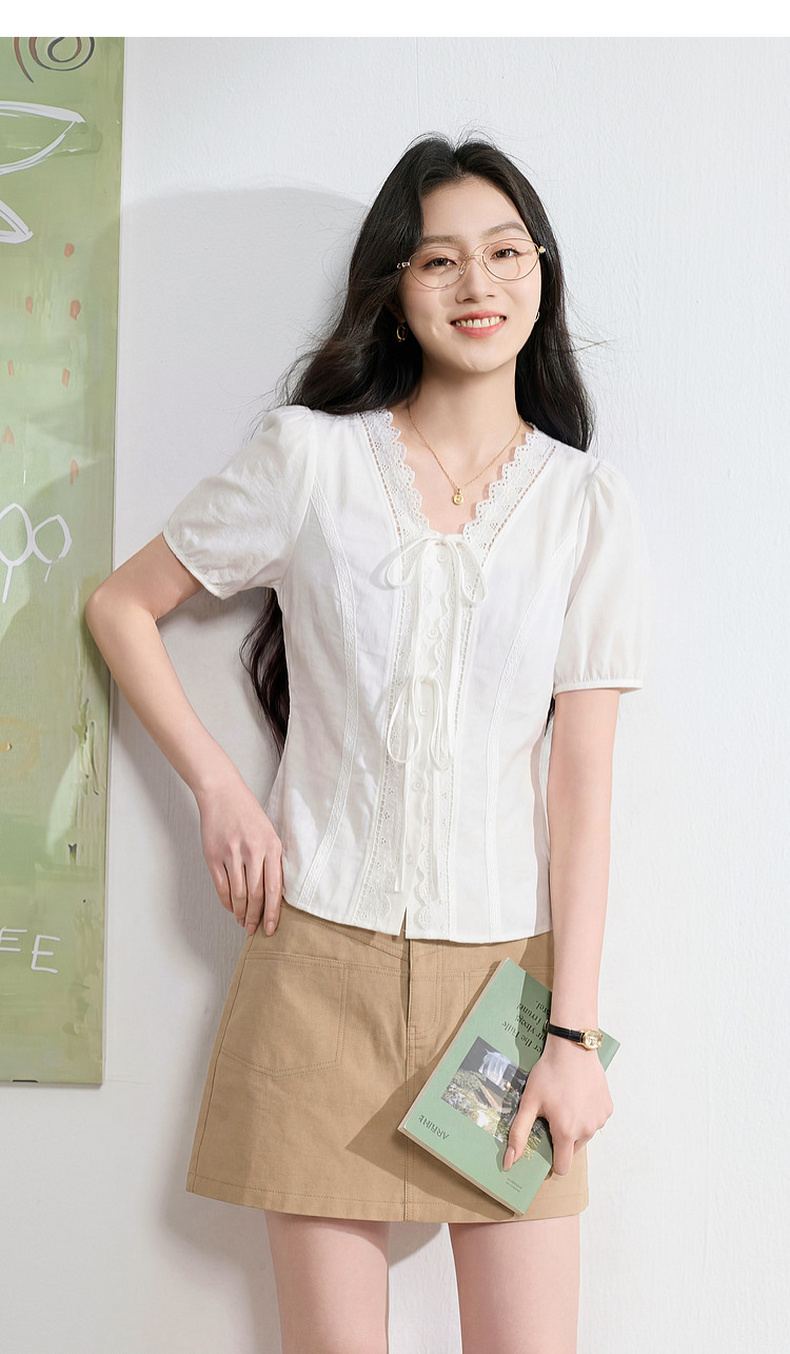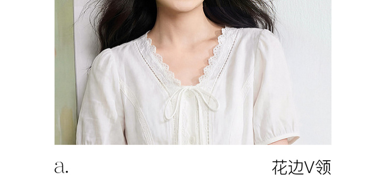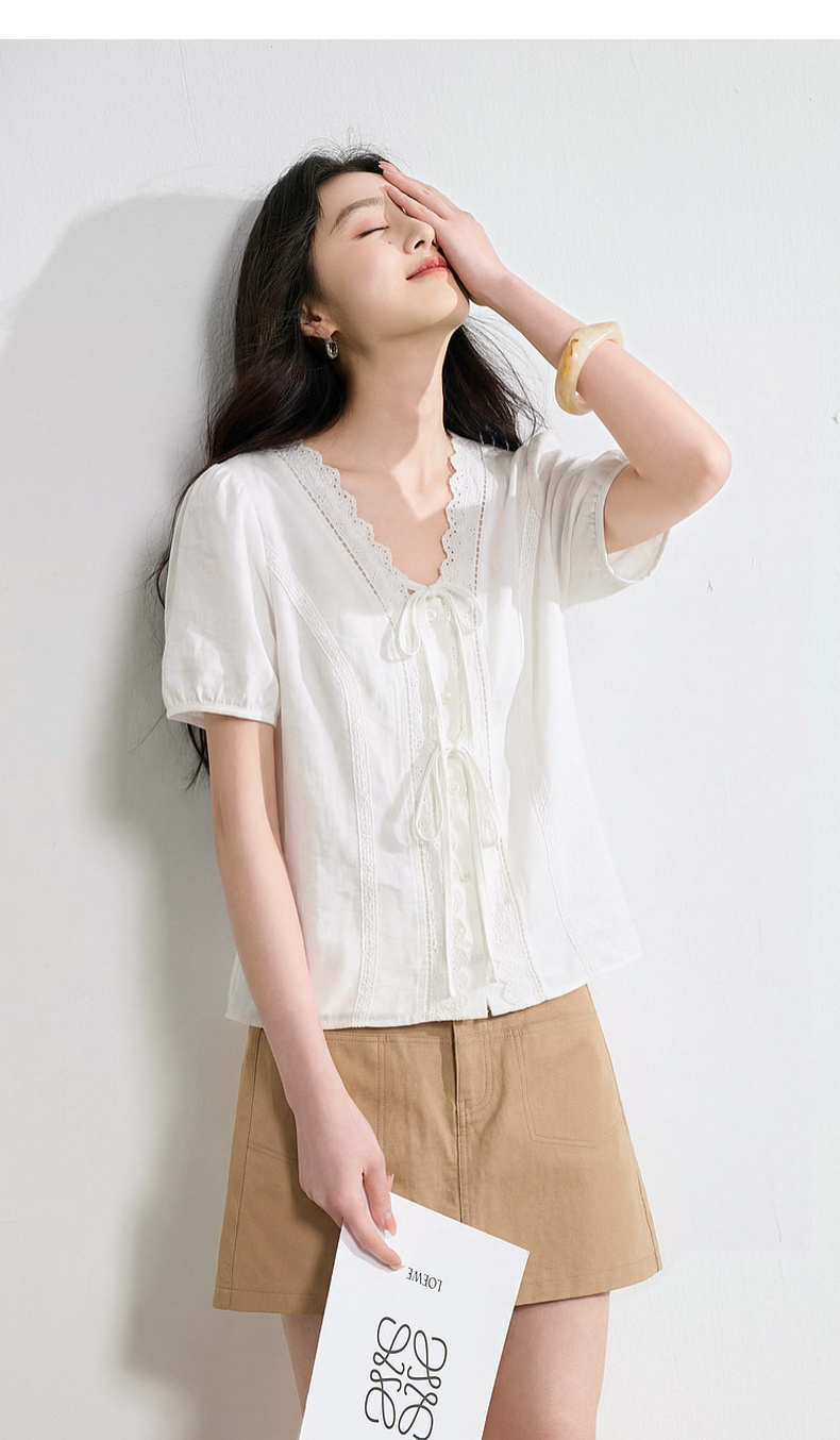 三彩2026夏季新款花边V领短袖白衬衫衬衣上衣小衫气质简约S