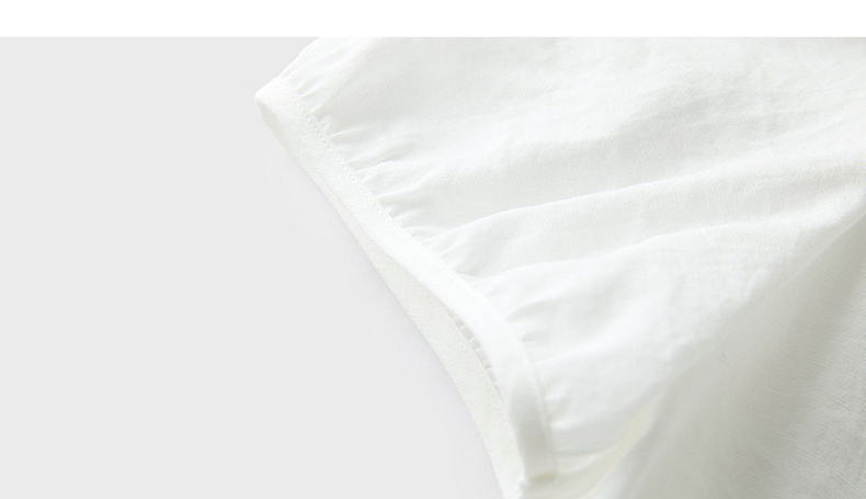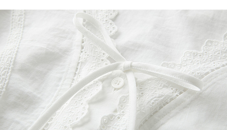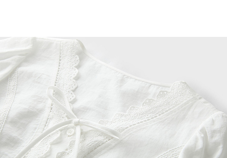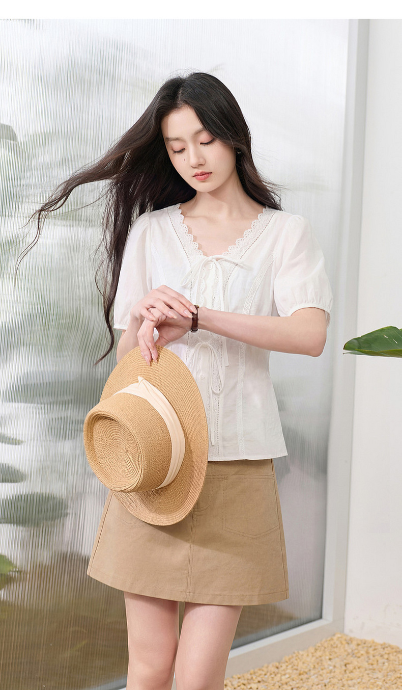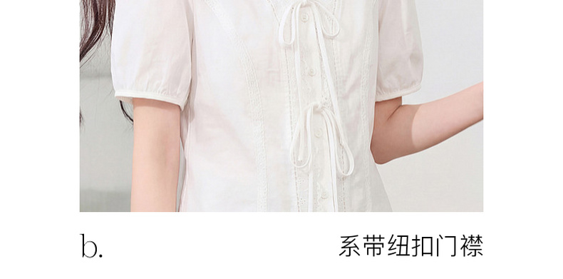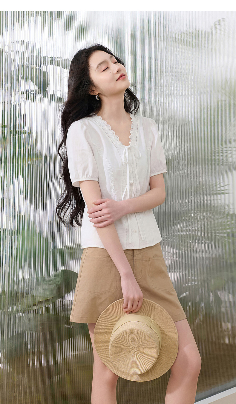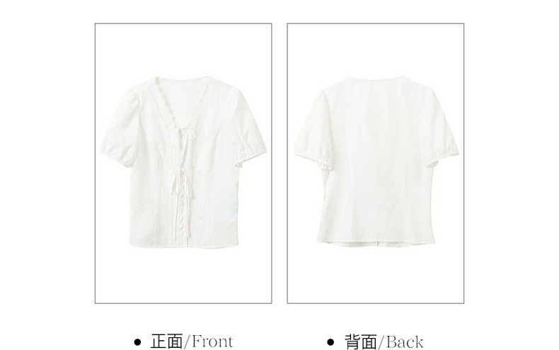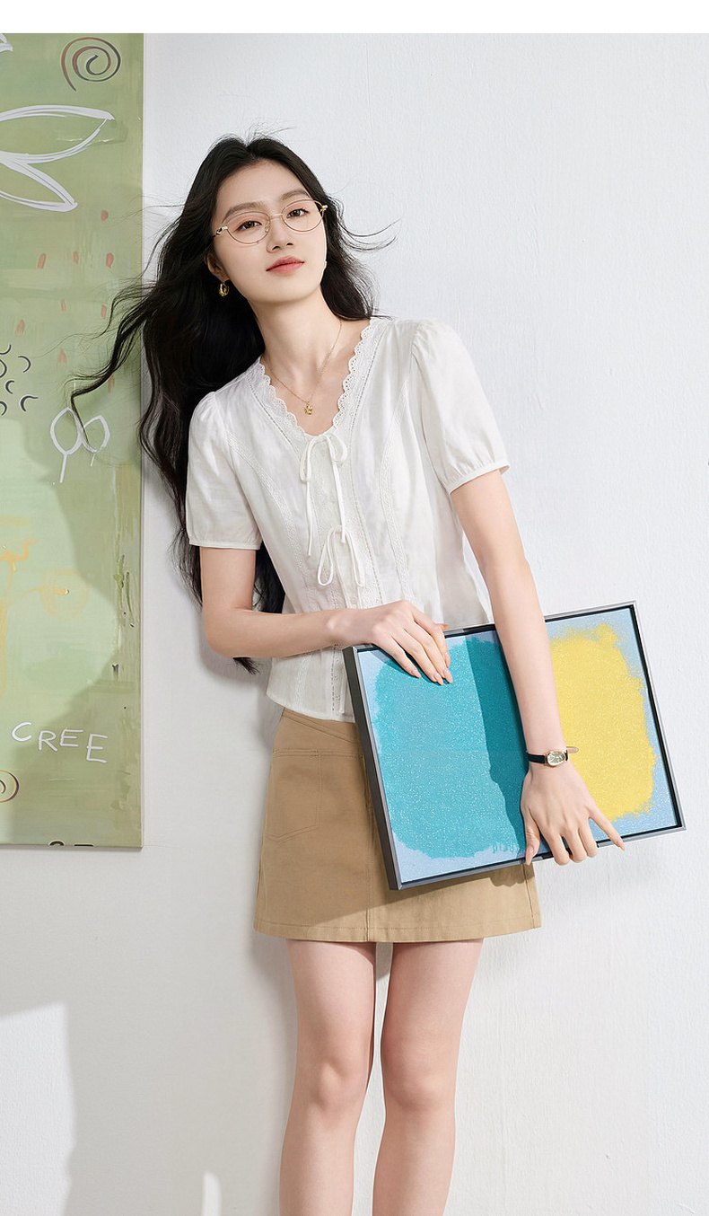 三彩2026夏季新款花边V领短袖白衬衫衬衣上衣小衫气质简约S