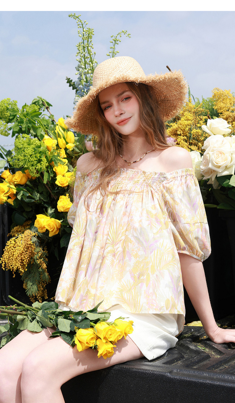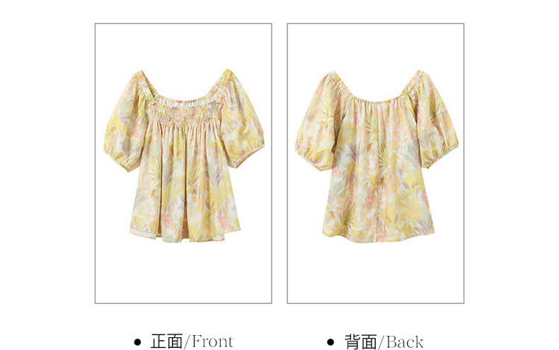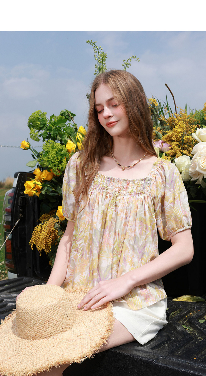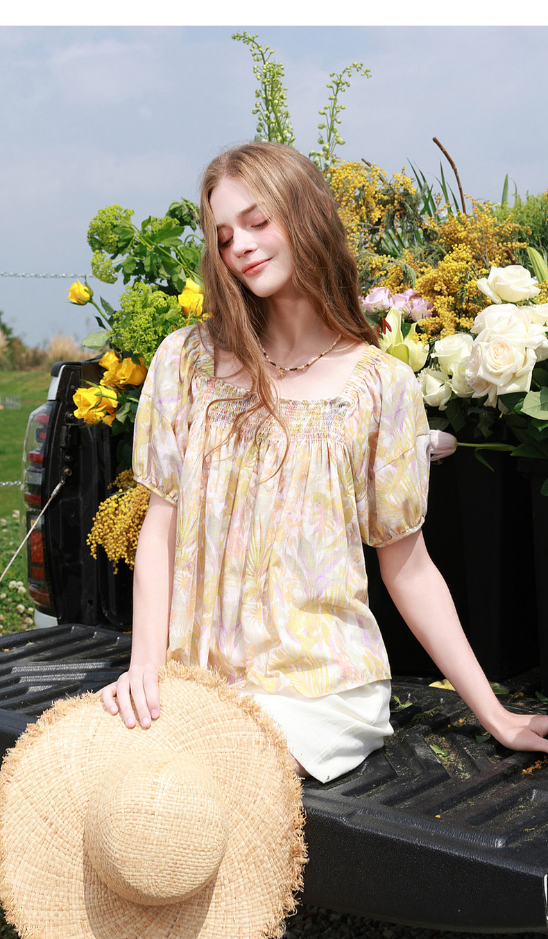 三彩2026夏季新款印花小衫宽松娃娃衫泡泡袖方领套头上衣M