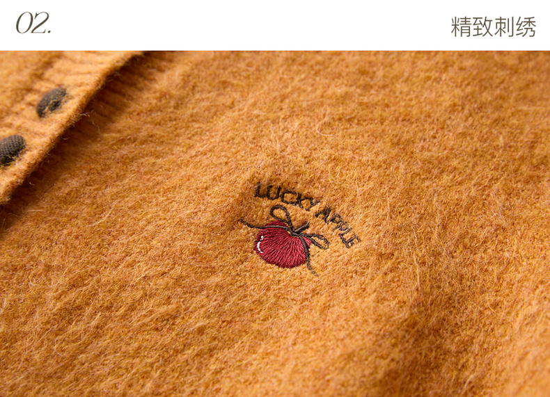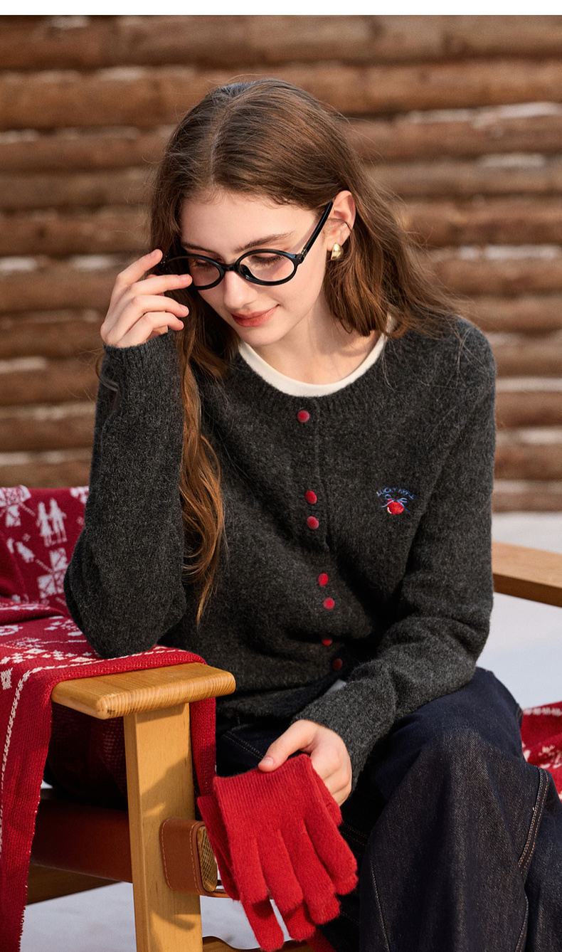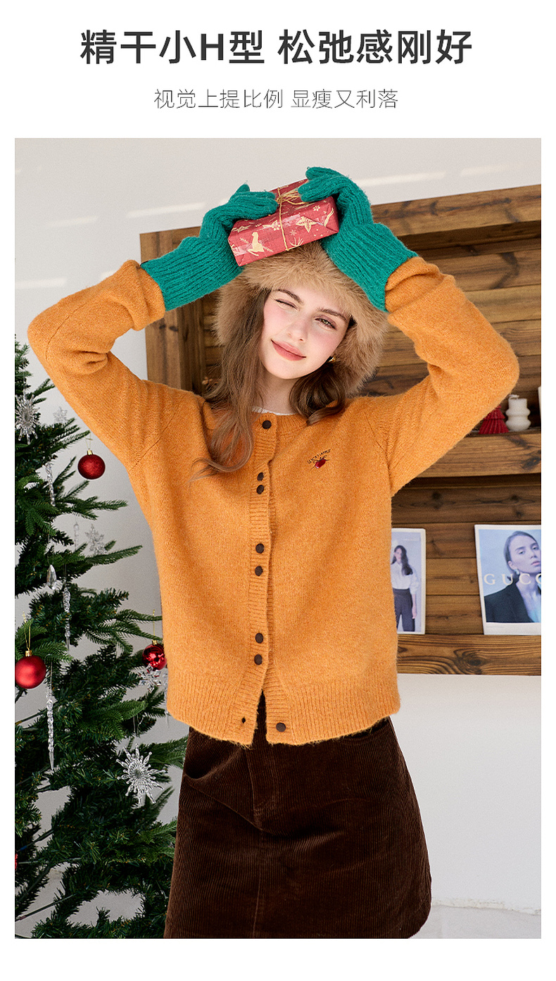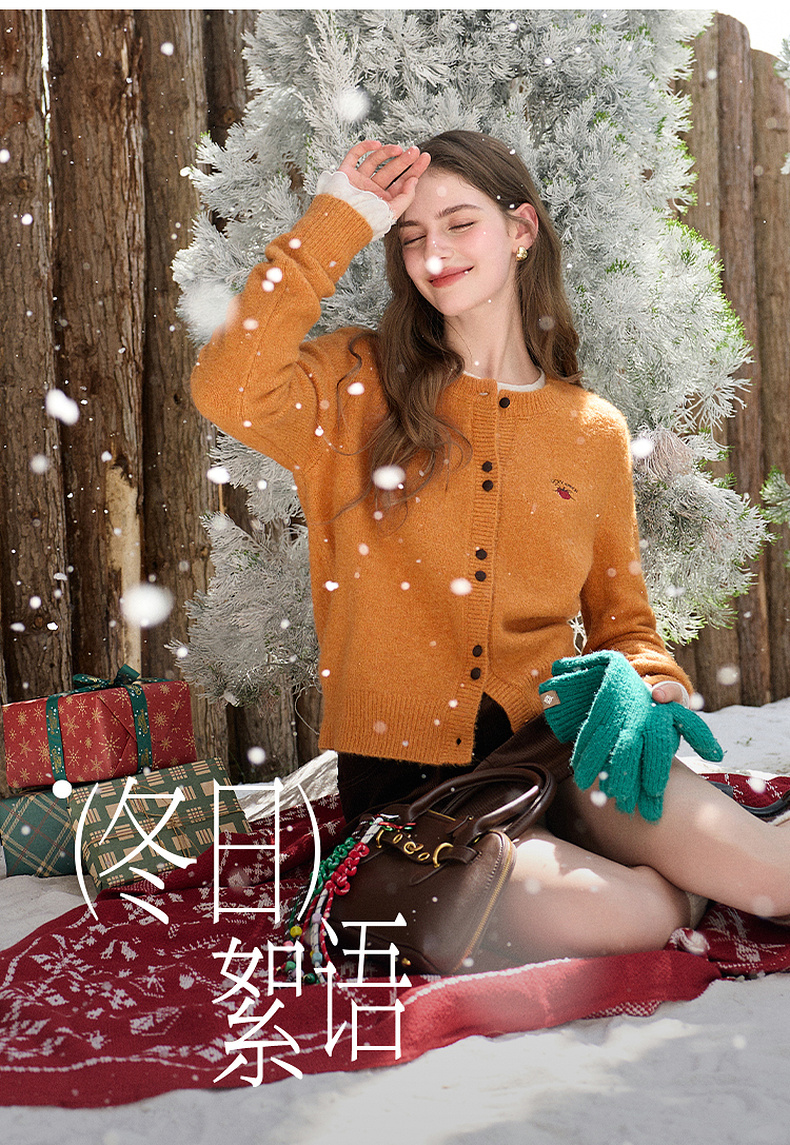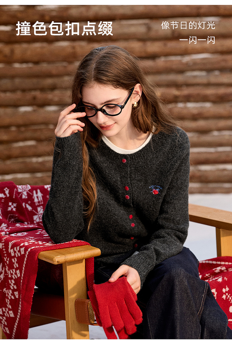 三彩2026春季新款撞色刺绣针织衫圆领毛衫开衫休闲外套M