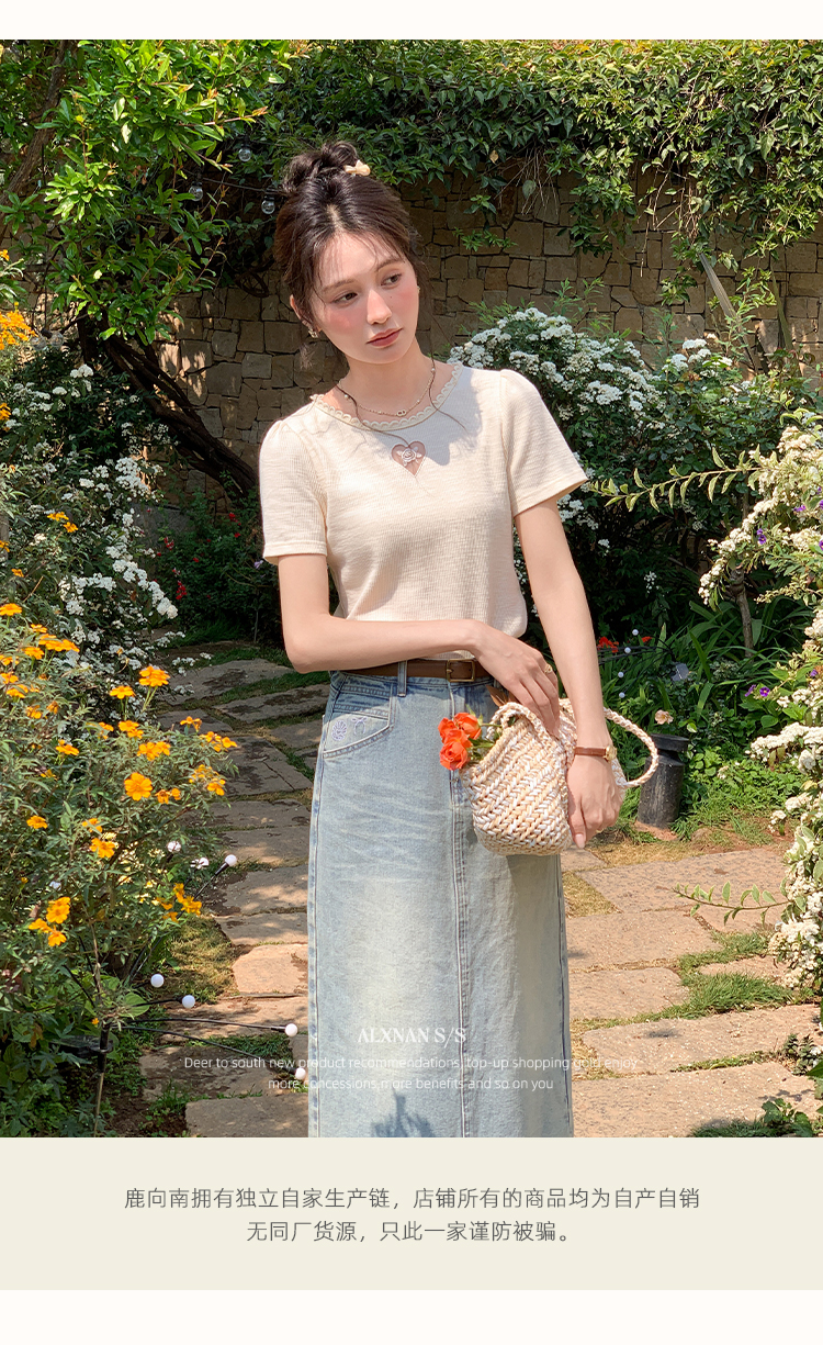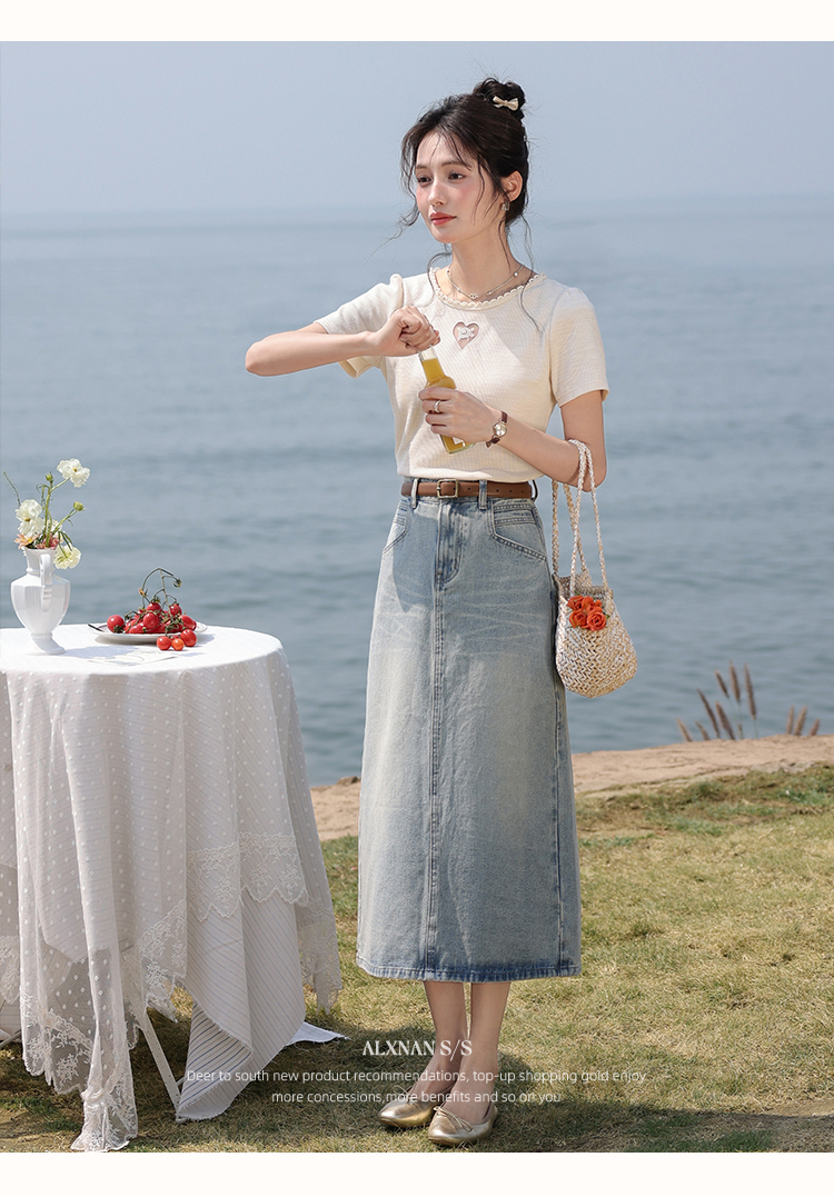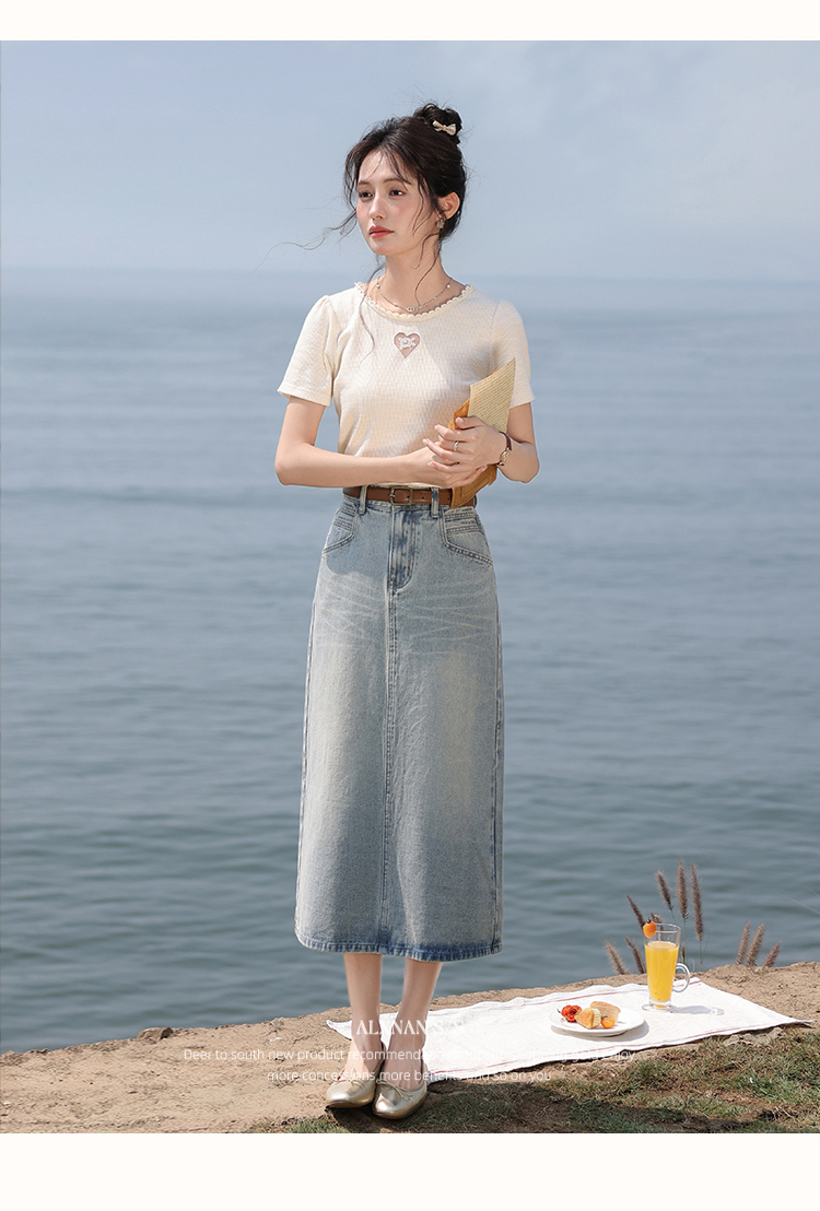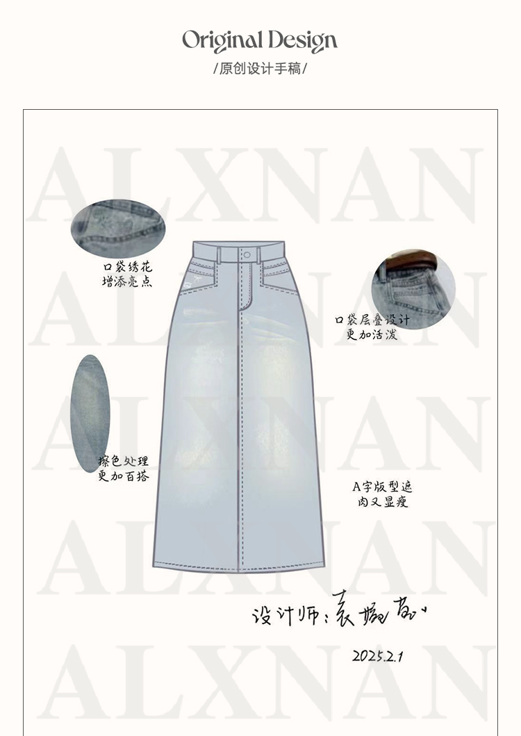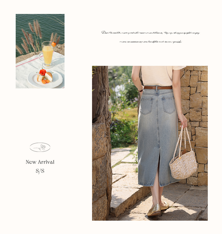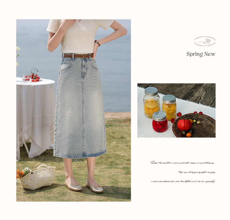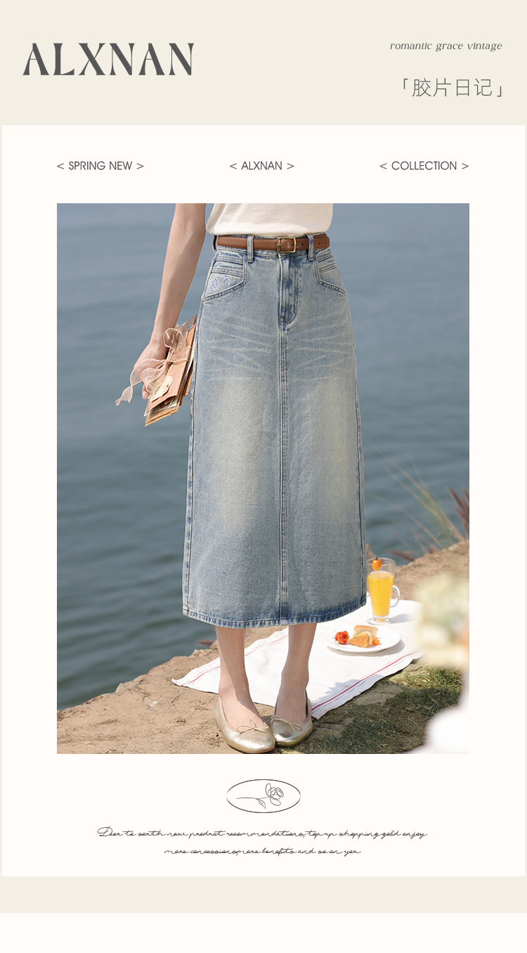 【65折秒杀】鹿向南「胶片日记」牛仔蓝复古中长款后开叉牛仔半身裙夏时尚裙子