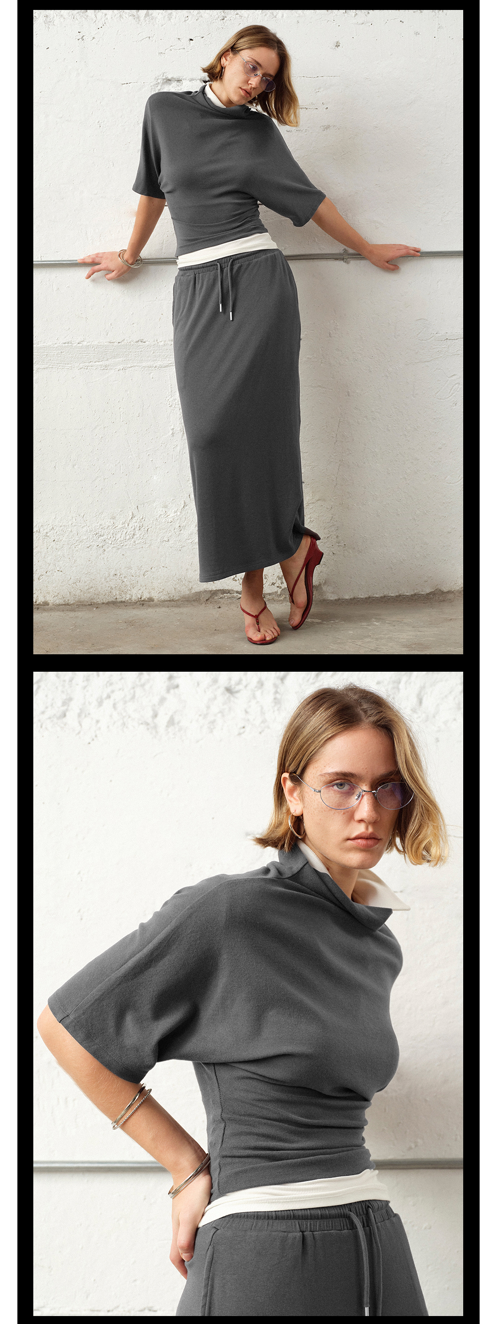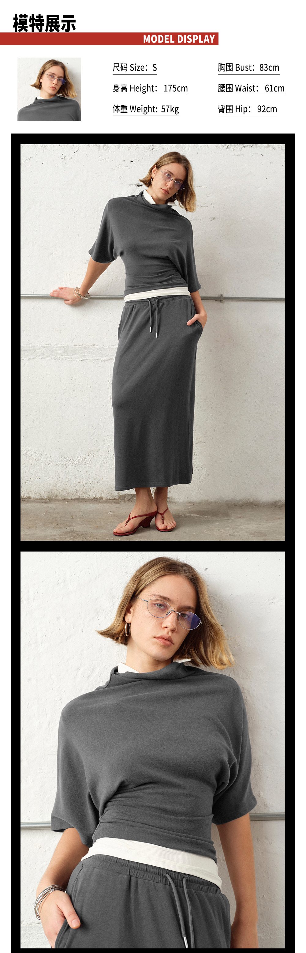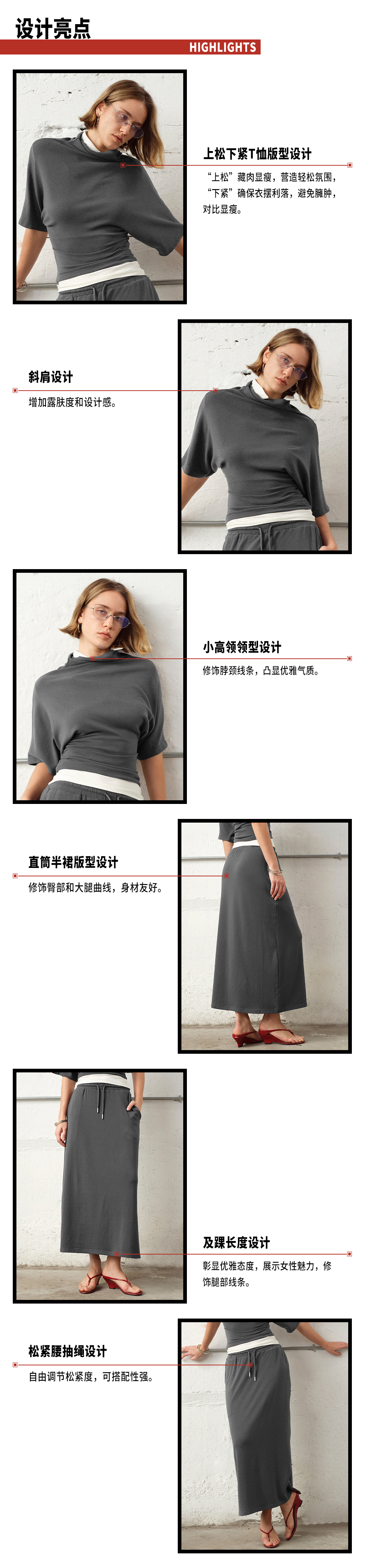 TR她热 随性优雅 灰色弹力百搭小高领斜肩T恤抽绳直筒半裙套装