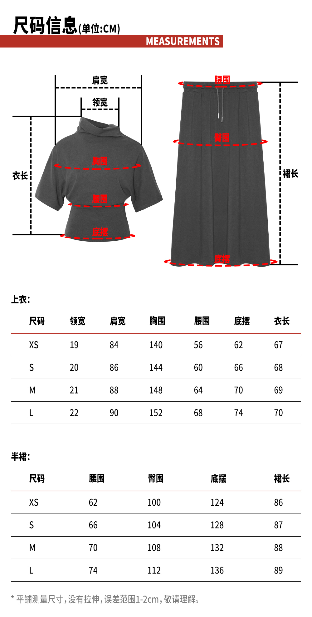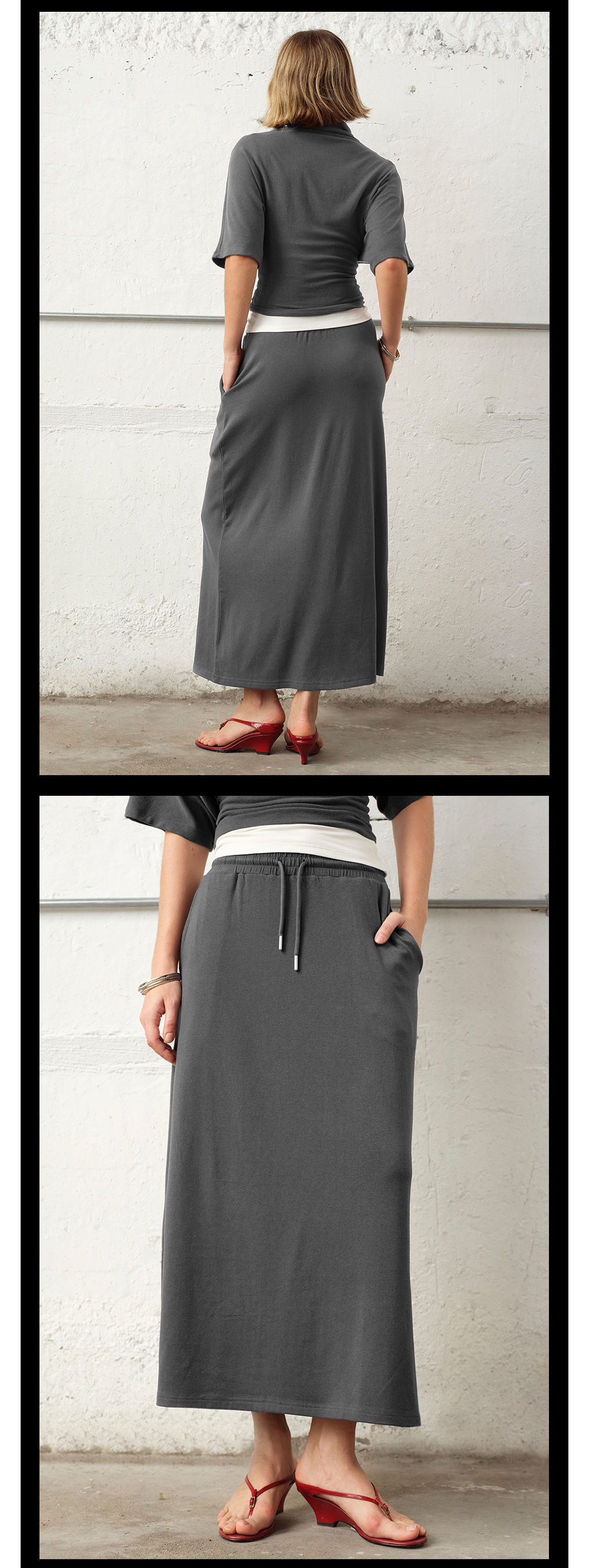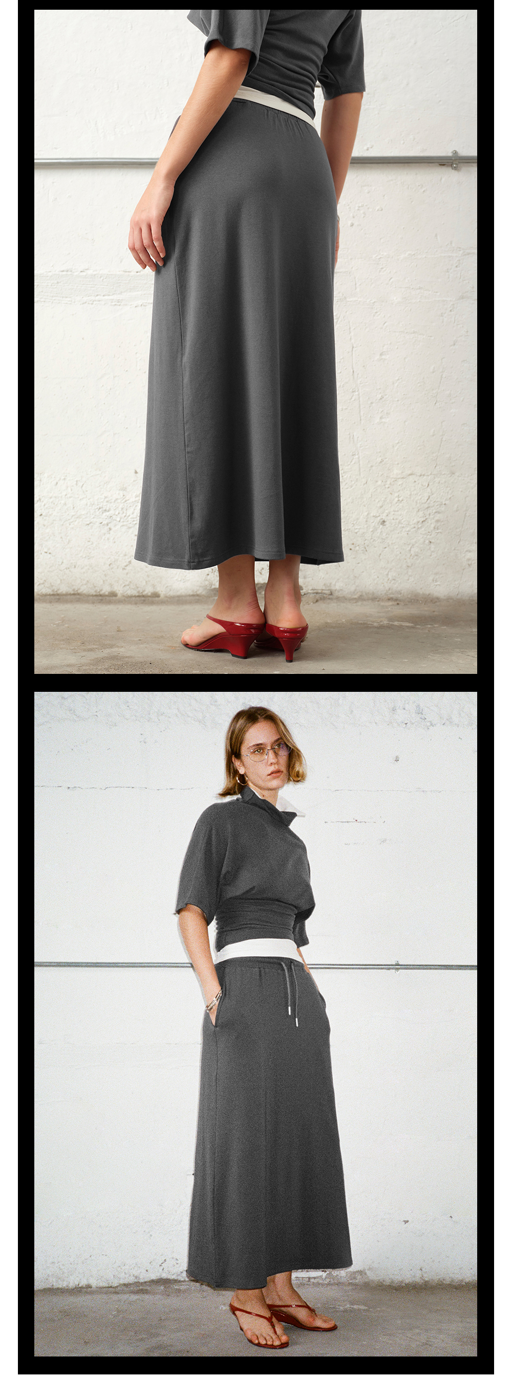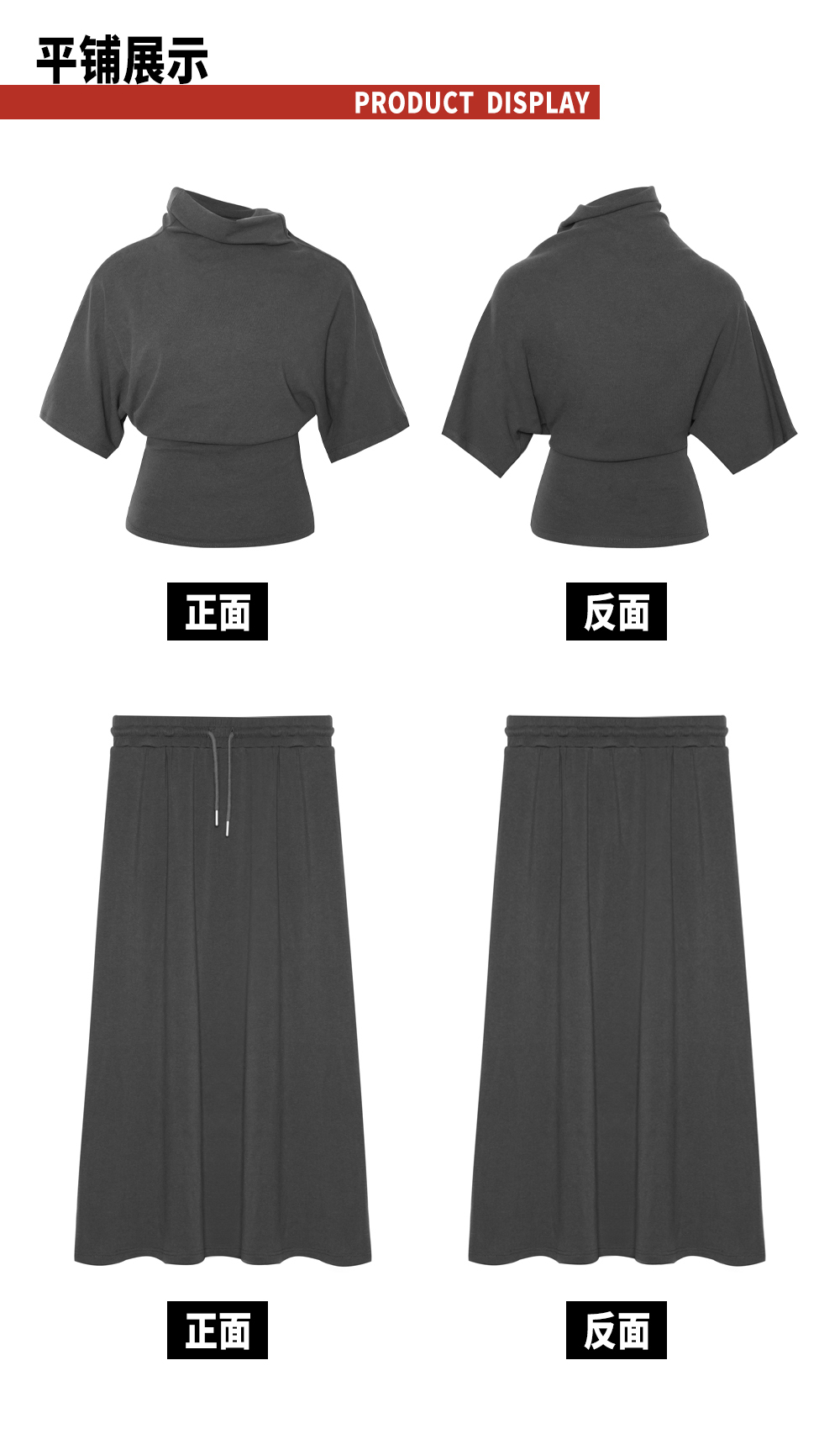 TR她热 随性优雅 灰色弹力百搭小高领斜肩T恤抽绳直筒半裙套装