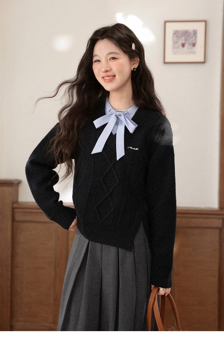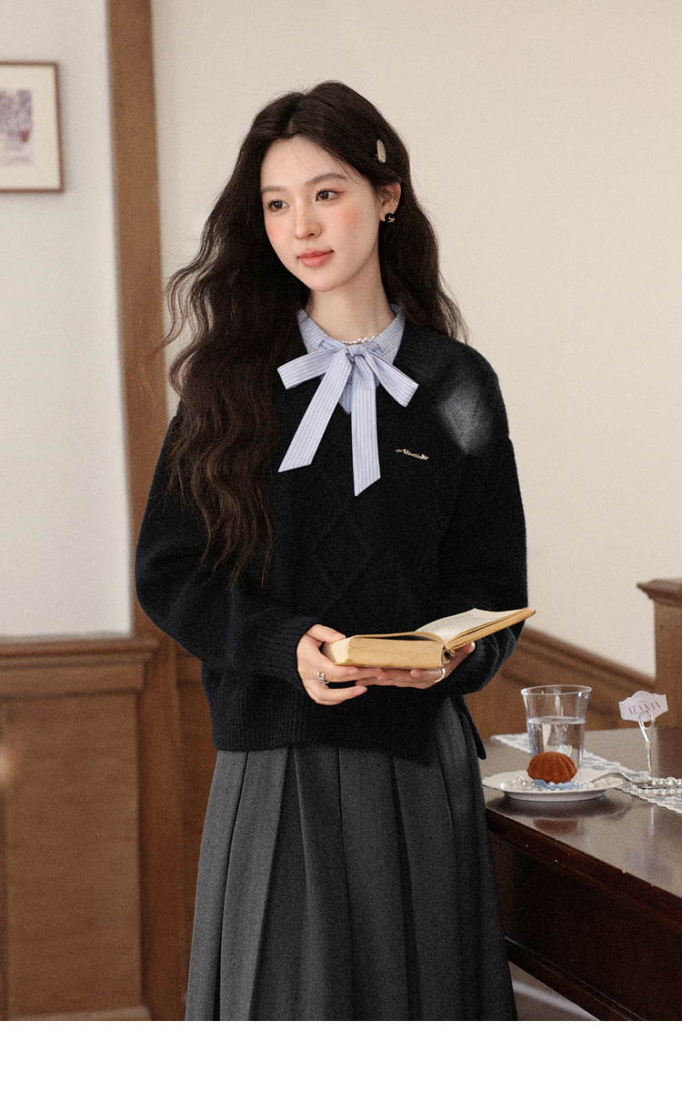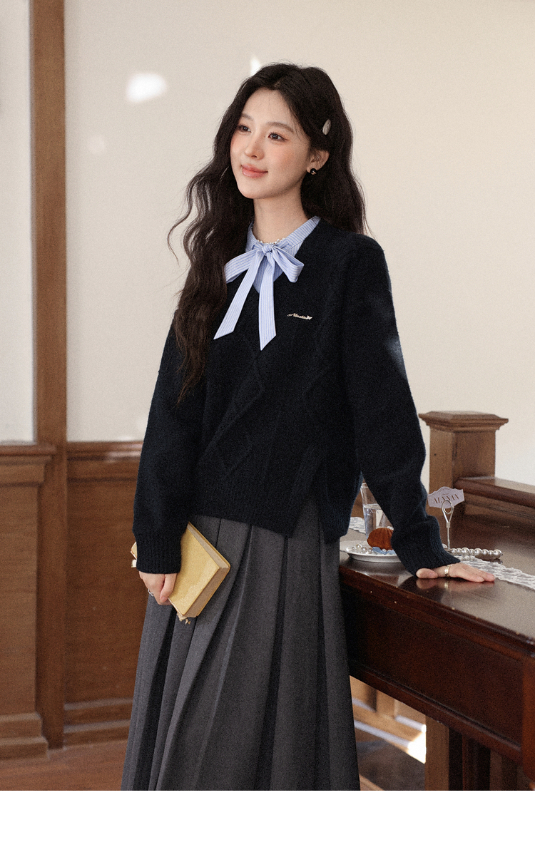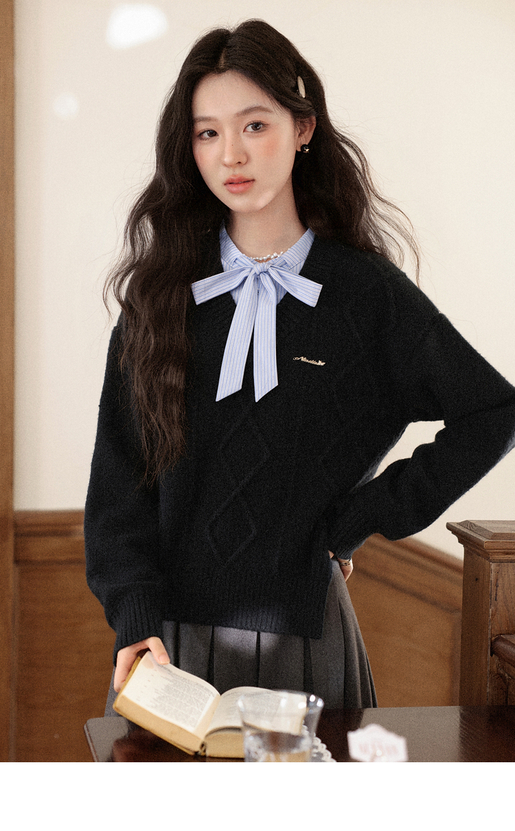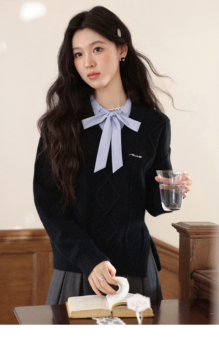 鹿向南「深蓝絮语」学院风假两件蝴蝶结黑色衬衫毛衣减龄上衣女秋