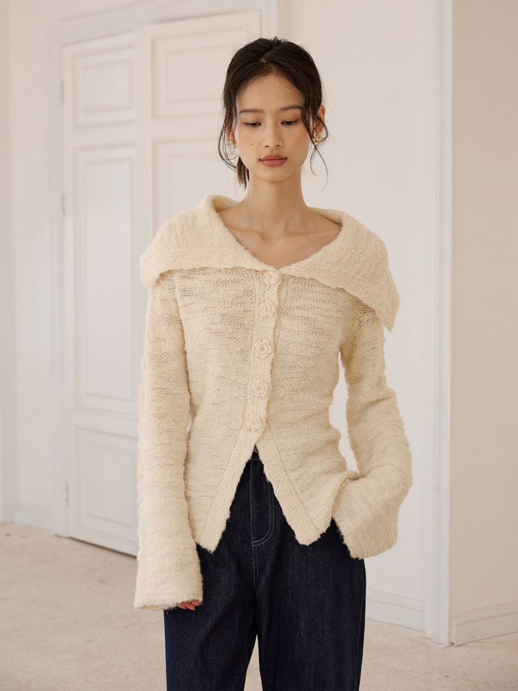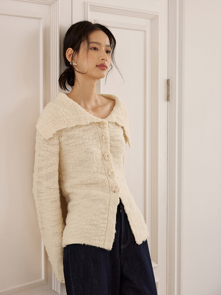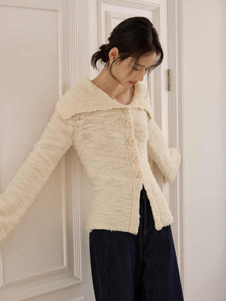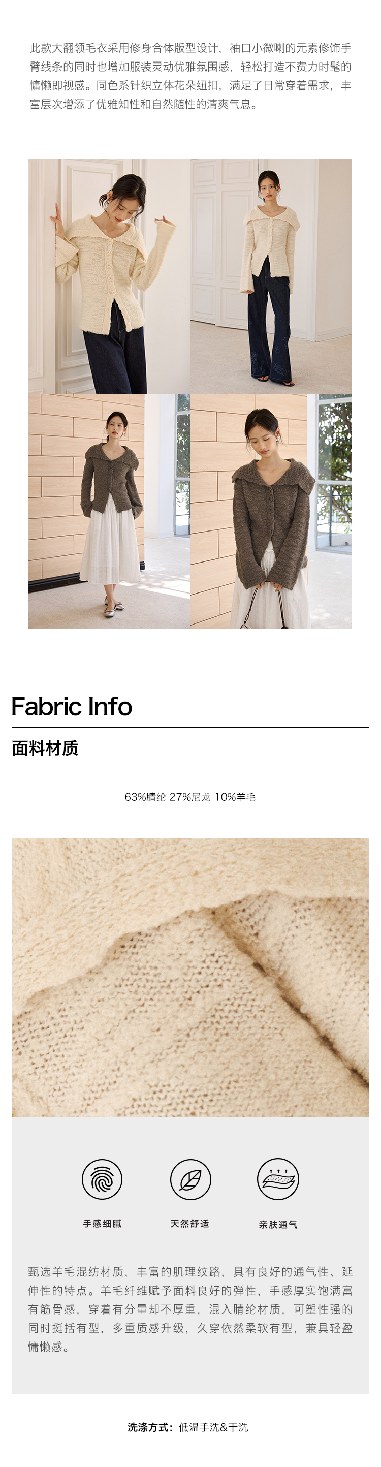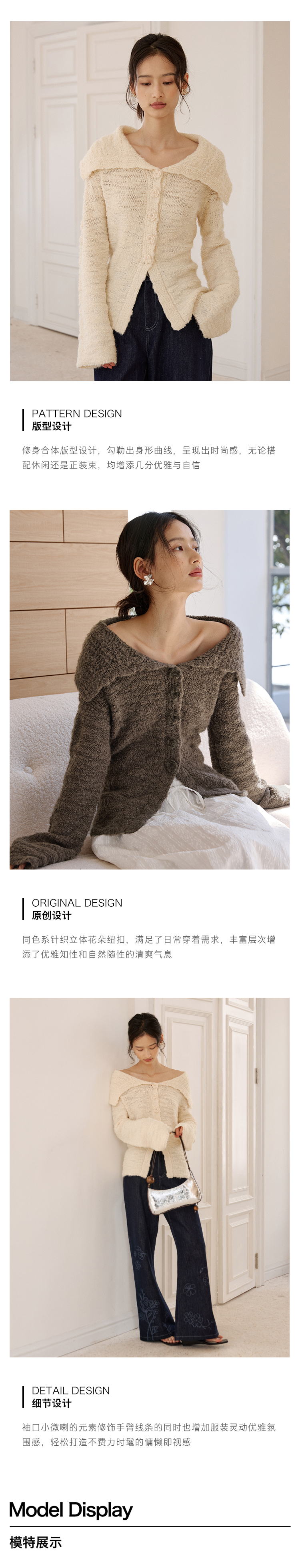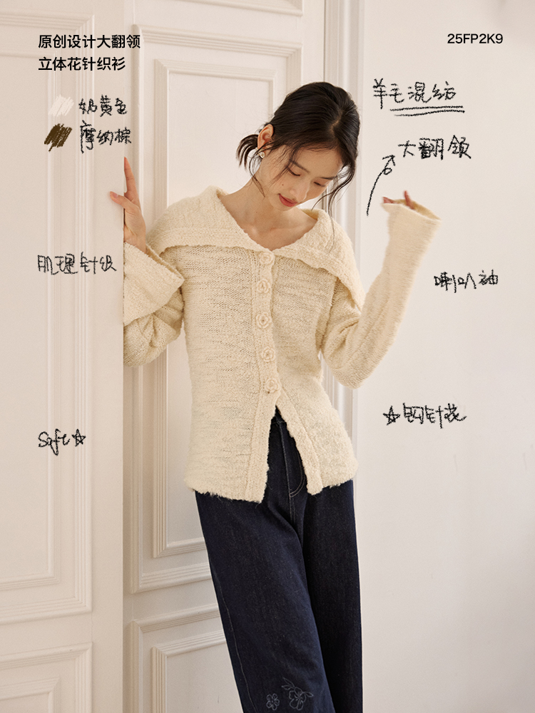 ForPoem 现货 25/SS原创设计大翻领立体花羊毛肌理针织上衣