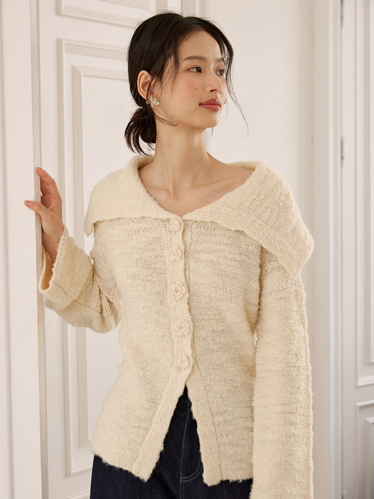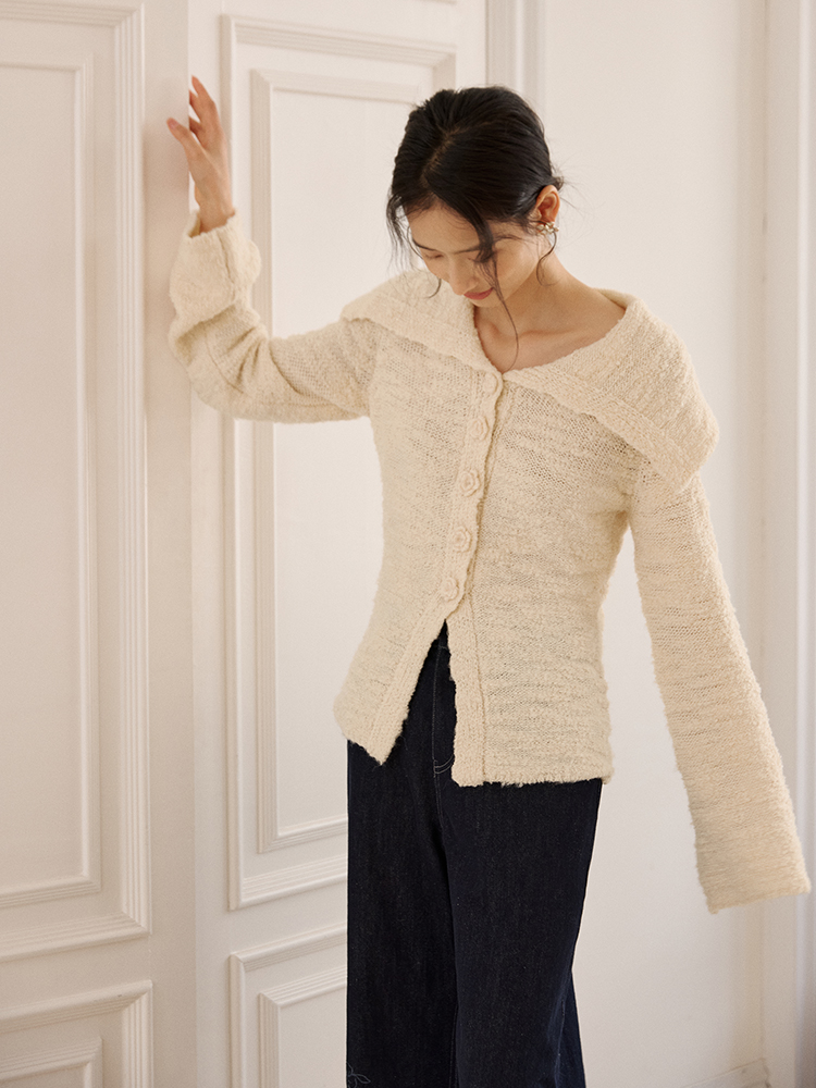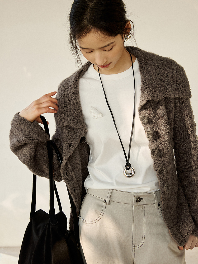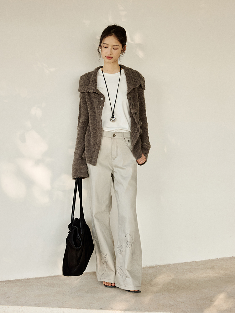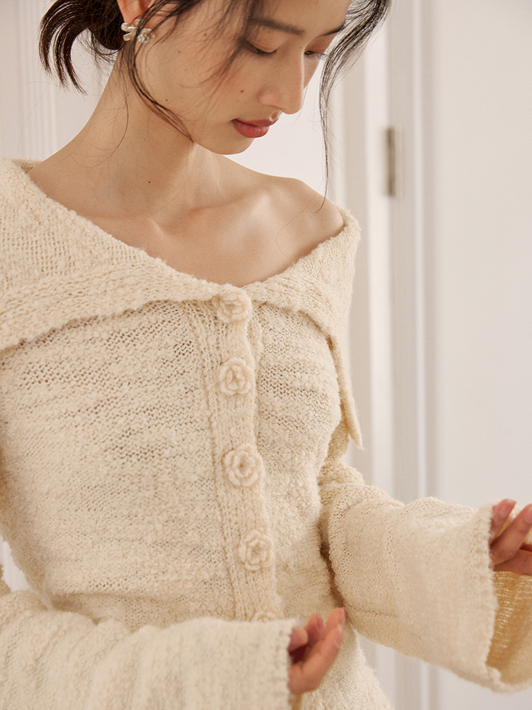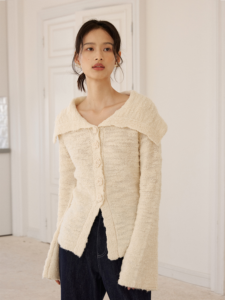 ForPoem 现货 25/SS原创设计大翻领立体花羊毛肌理针织上衣