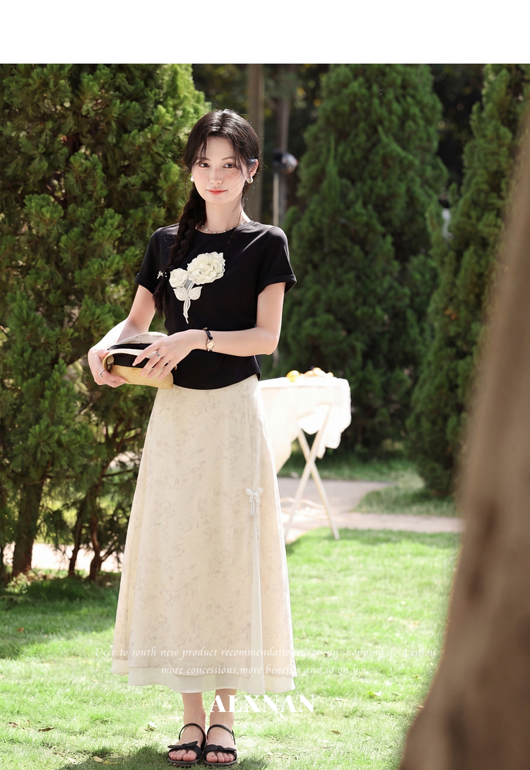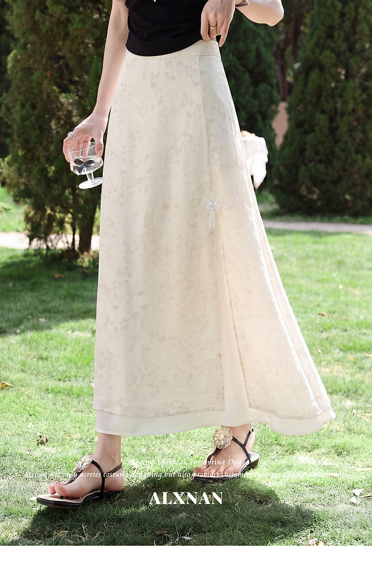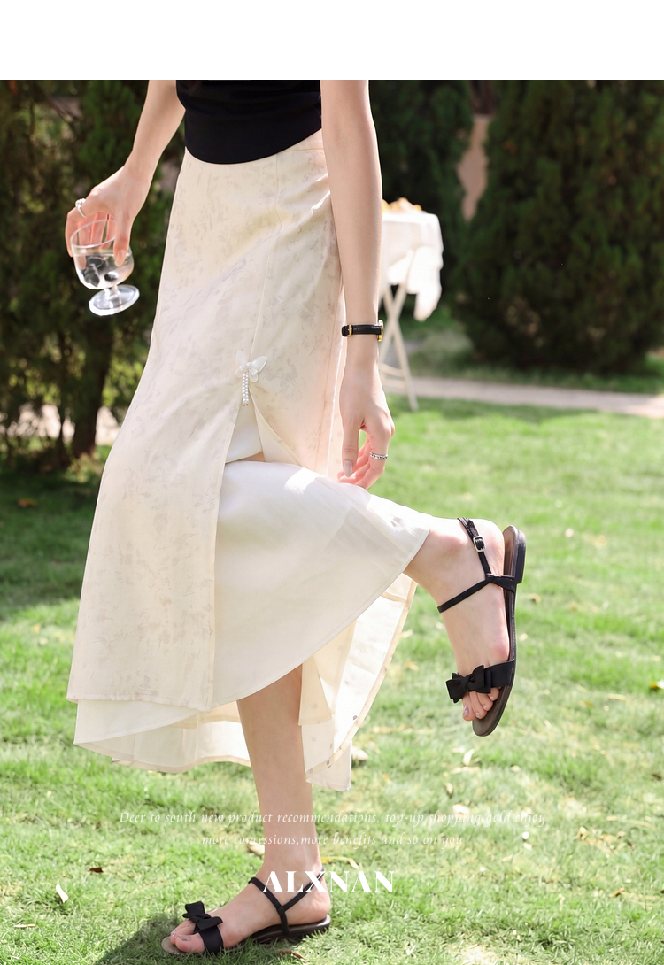 鹿向南「蝶落白纱」新中式杏色印花半身裙女夏季新款气质A字长裙
