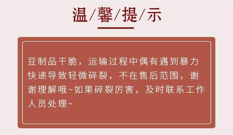 小贴士:豆制品干脆,运输过程中偶有遇到暴力快递导致碎裂,不在售后范围 ,不支持退货退款,介意的亲请慎拍哦