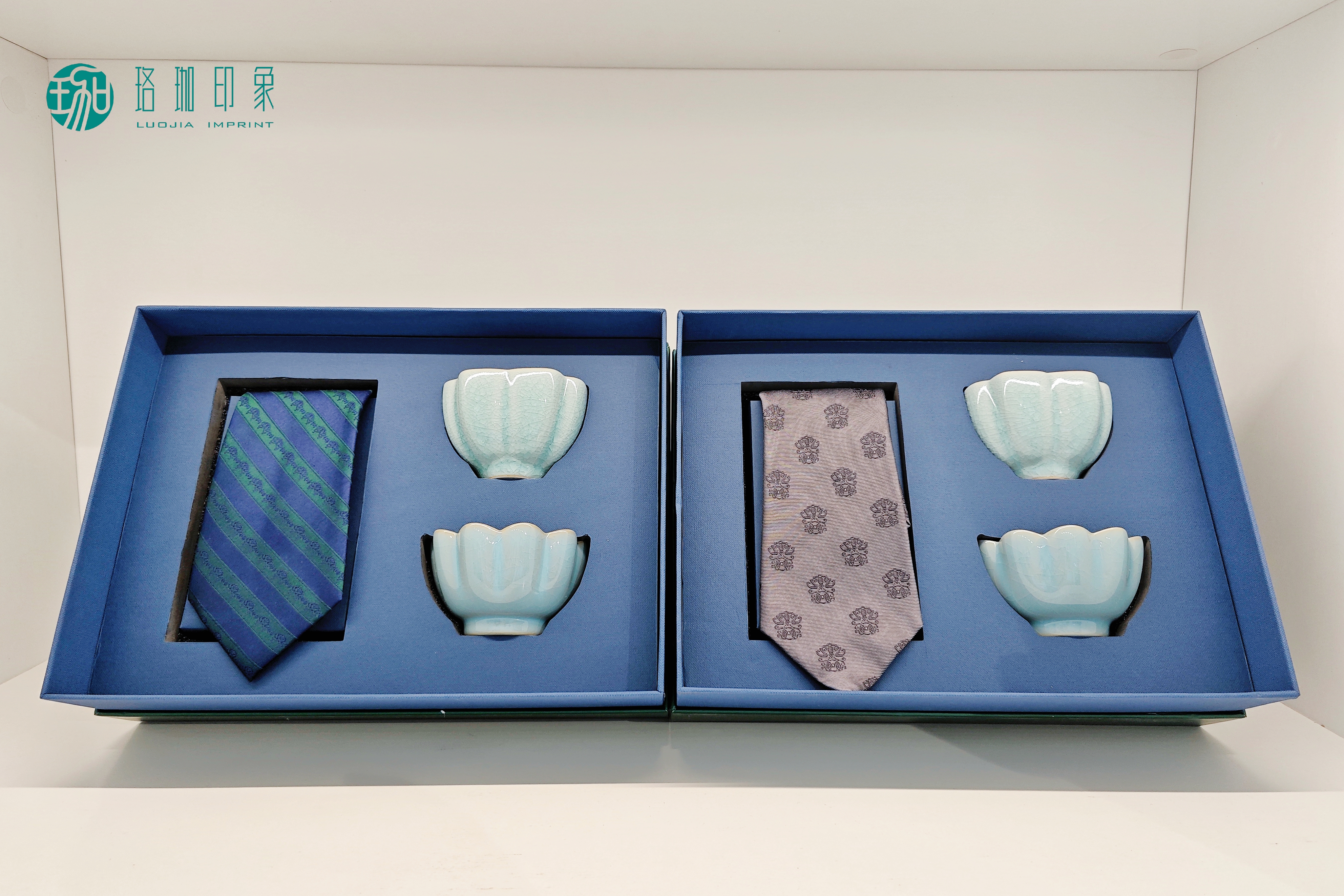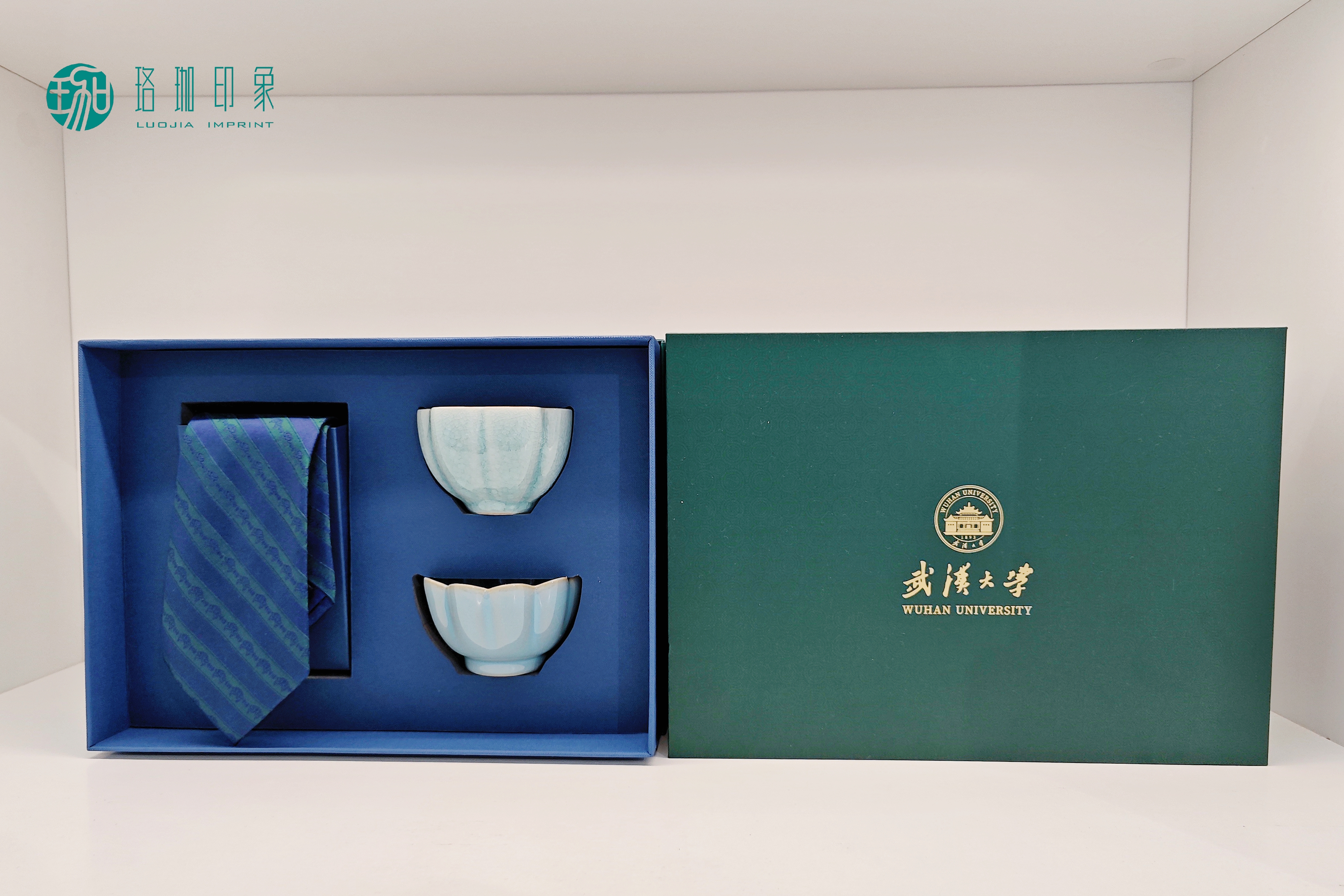 领带融合武汉大学经典建筑琉璃瓦当“蝠”在眼“钱”元素设计,以桑蚕丝和羊毛为载体,寓意福禄双全,吉祥如意,节节高。对杯选用汝瓷,宋瓷之冠,北宋宫廷御用,有“纵有家财万贯,不如汝瓷一片”之美誉,玛瑙入釉,温润莹透,天青开片自然天成。两者刚柔并济,是武大历史与非遗艺术的完美结合,更是珍贵文化的薪火相传。