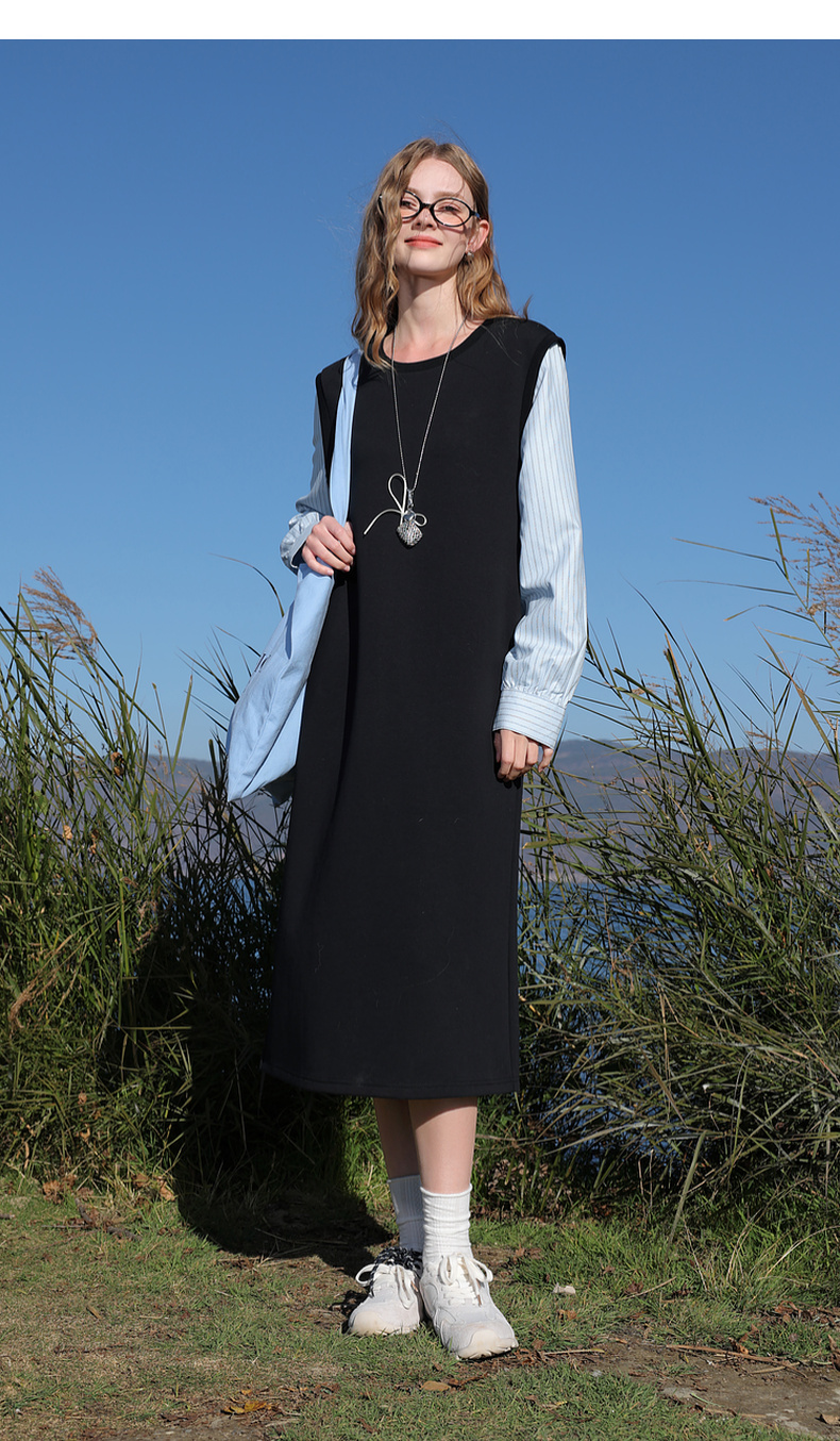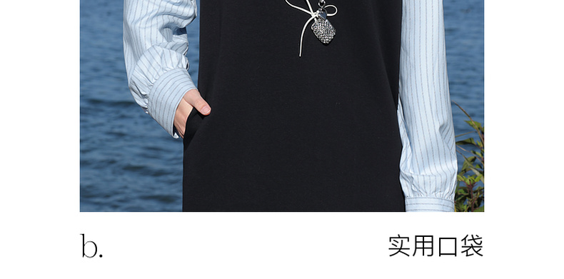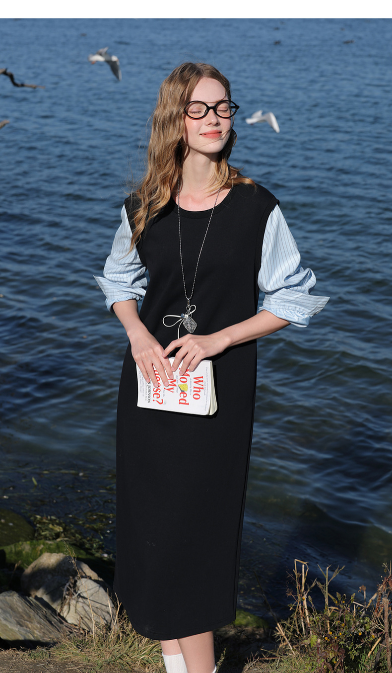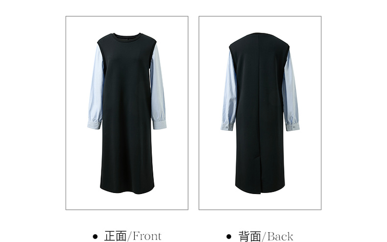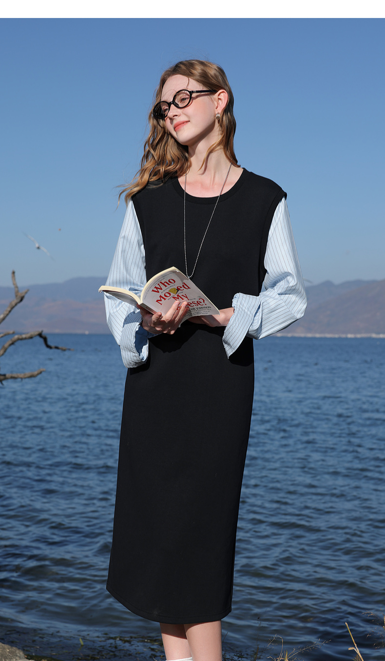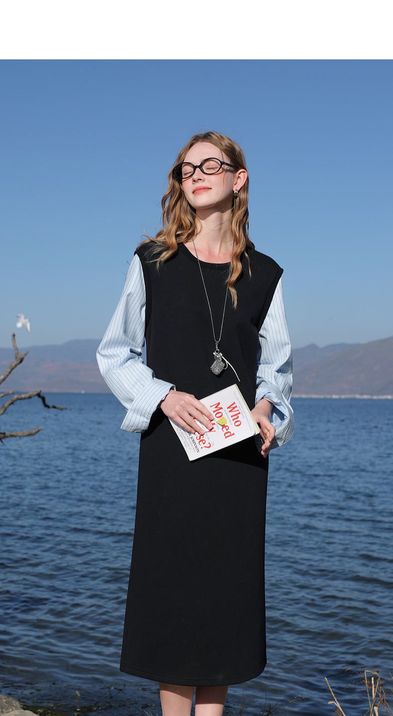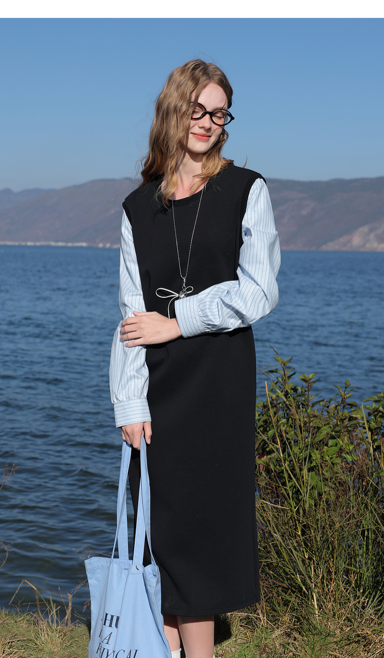 三彩2026春季新款条纹长袖假两件连衣裙宽松圆领直筒裙长裙M